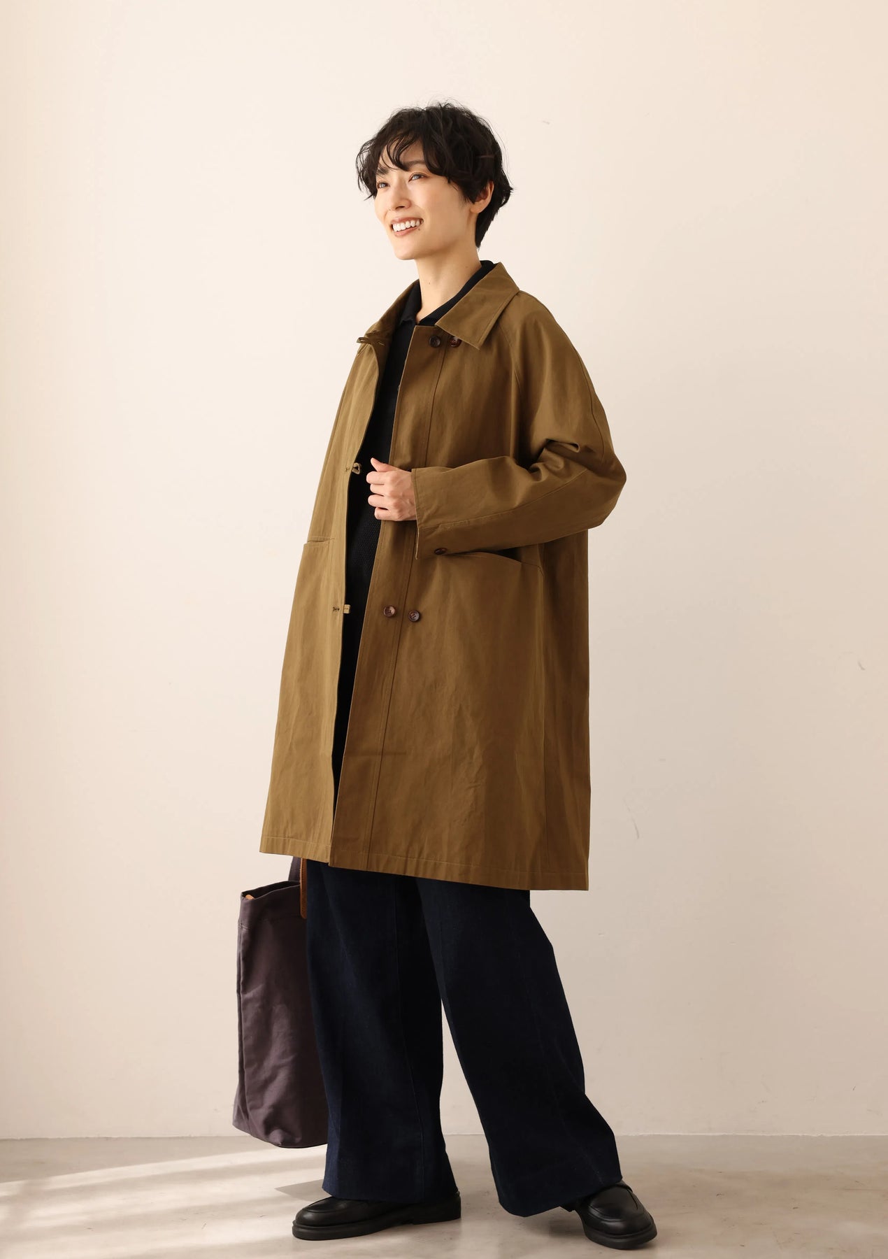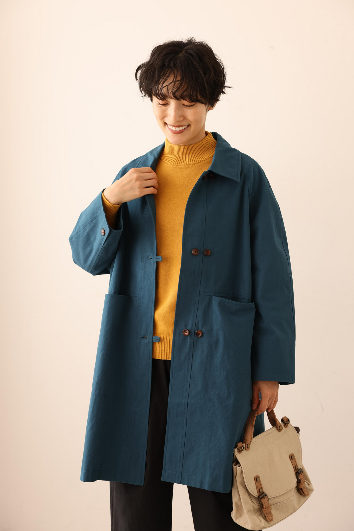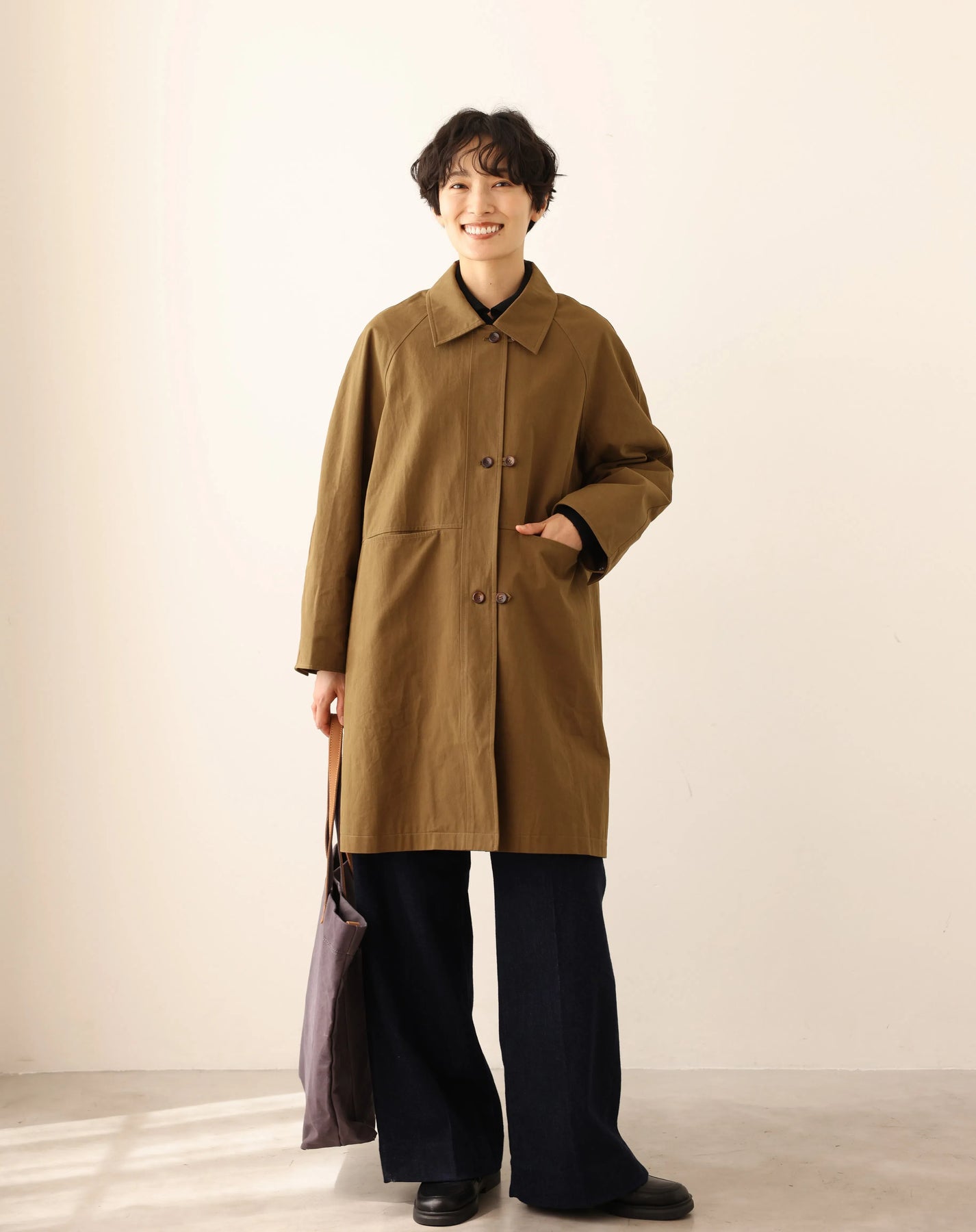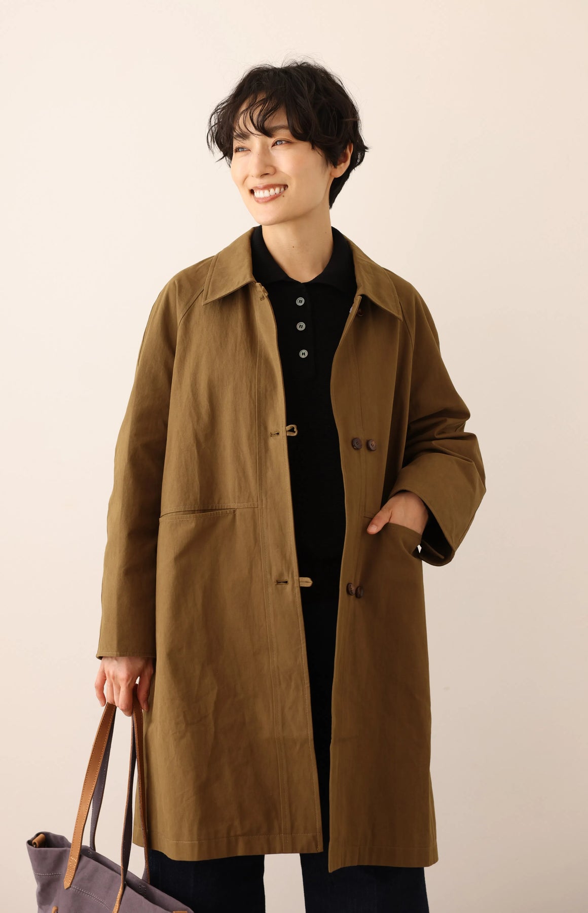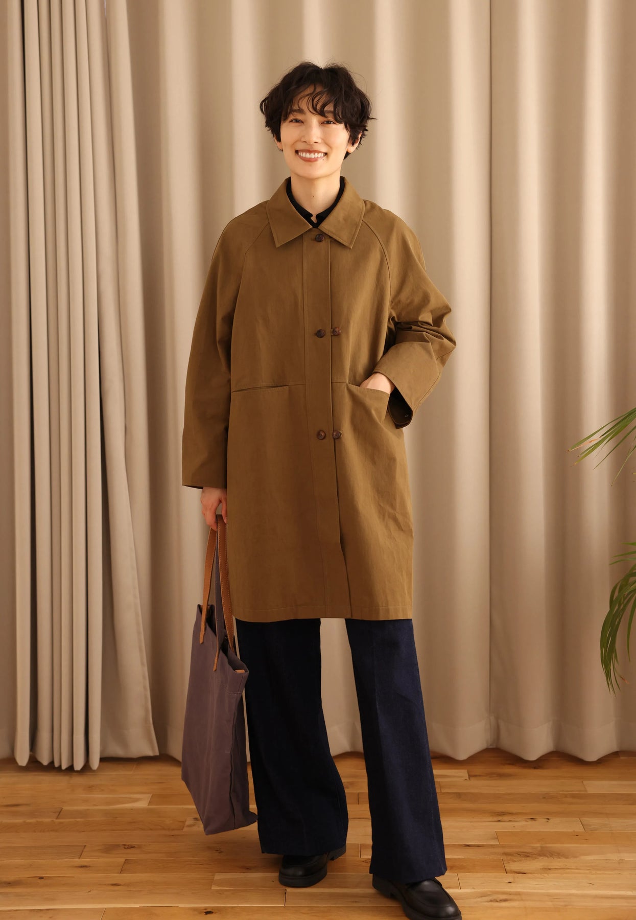 秋の着こなしの主役になるコート ミドル丈コート 240928★高密度のコットン生地で作ったミドル丈コート。★きれいめにもカジュアルにも似合う定番のステンカラー。★中にニットやパーカなどの厚手のインナーを着てもごわつかないのもポイント。★ボリュームのあるワンピースやボトムともバランスよく着こなせます。★袖口はボタンで留められるので、風の侵入を防いでくれます。★さらっと羽織るだけでおしゃれな雰囲気がまとえる一枚です。素材:表地:コットン100%裏地:ポリエステル55% レーヨン45%サイズ:身丈89cmバスト115cm桁丈77cm裾158cmモデルさんの身長:163cm透け感:なし裏地:ありポケット:あり伸縮性:なし光沢感:なしシーズン:春、秋、冬