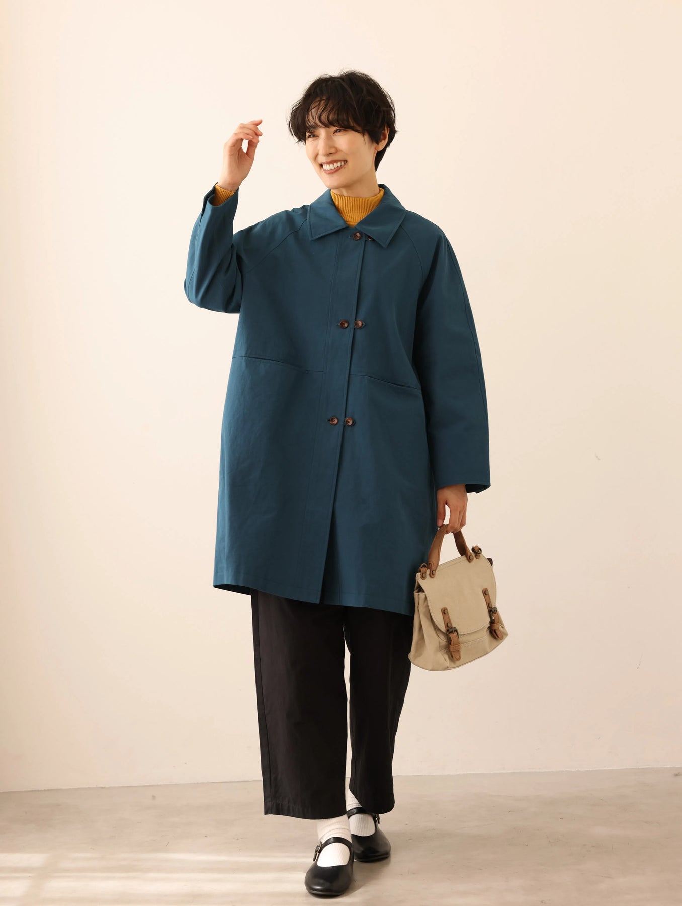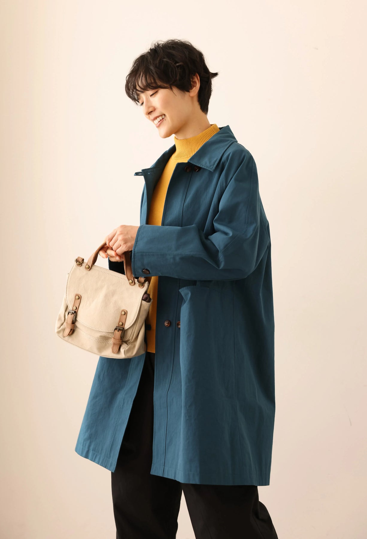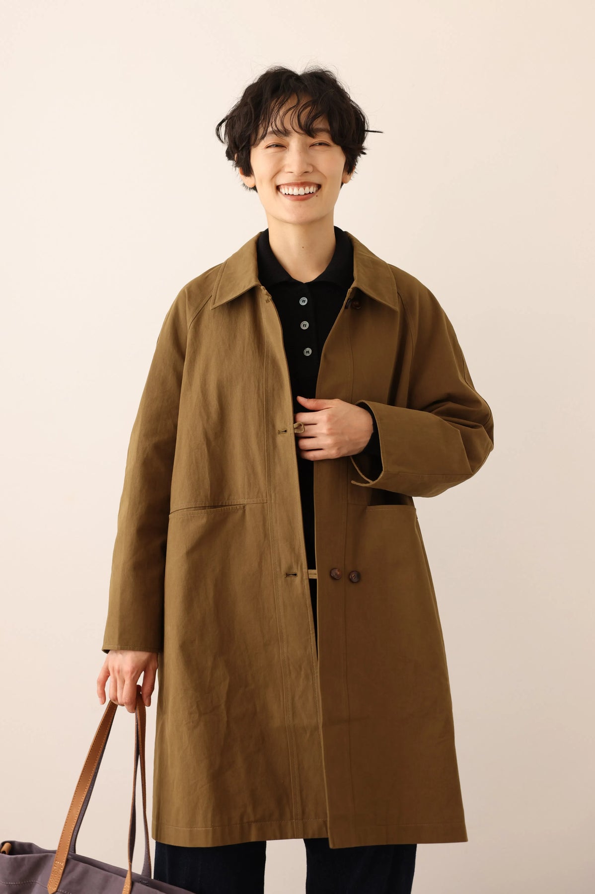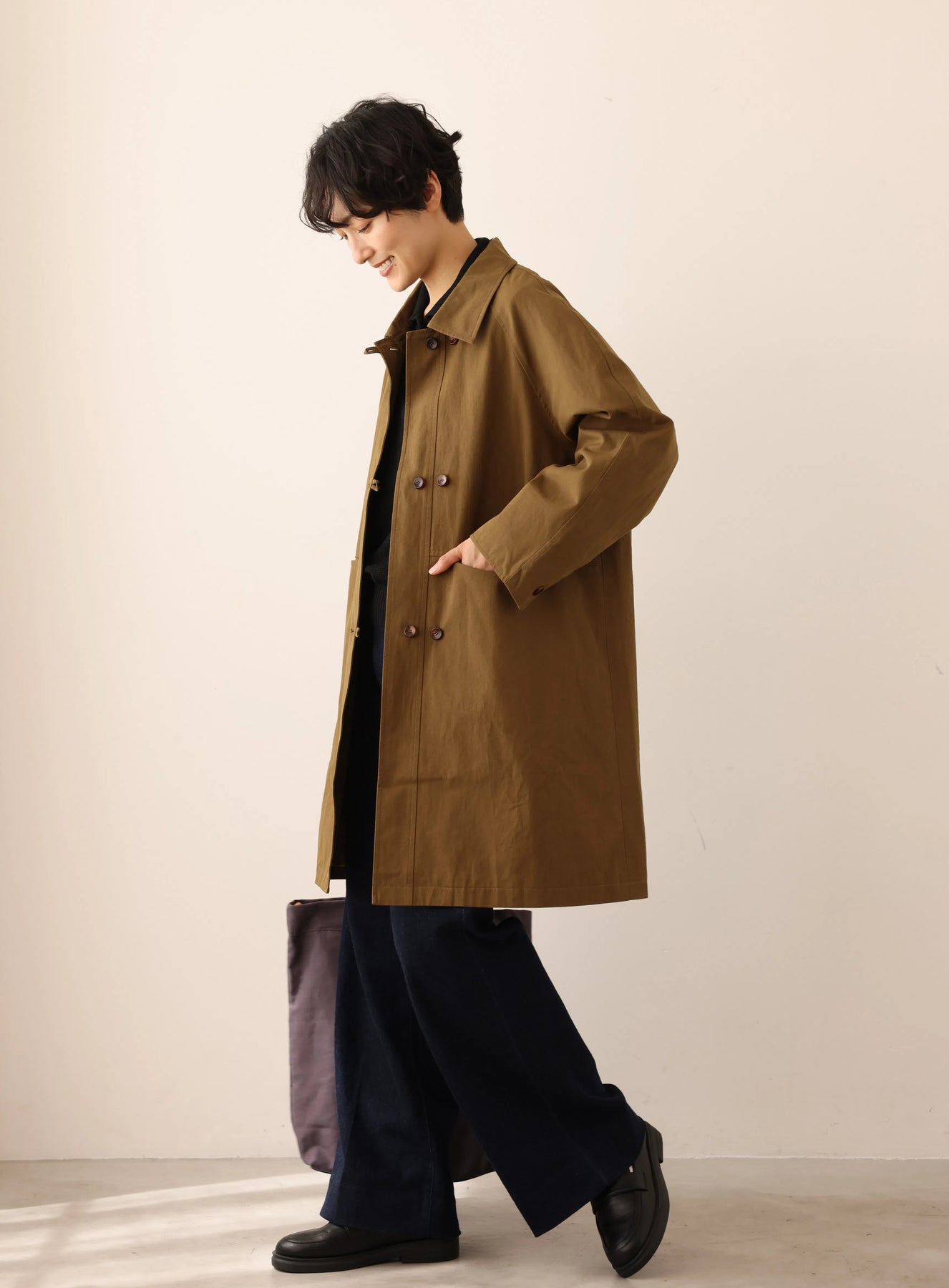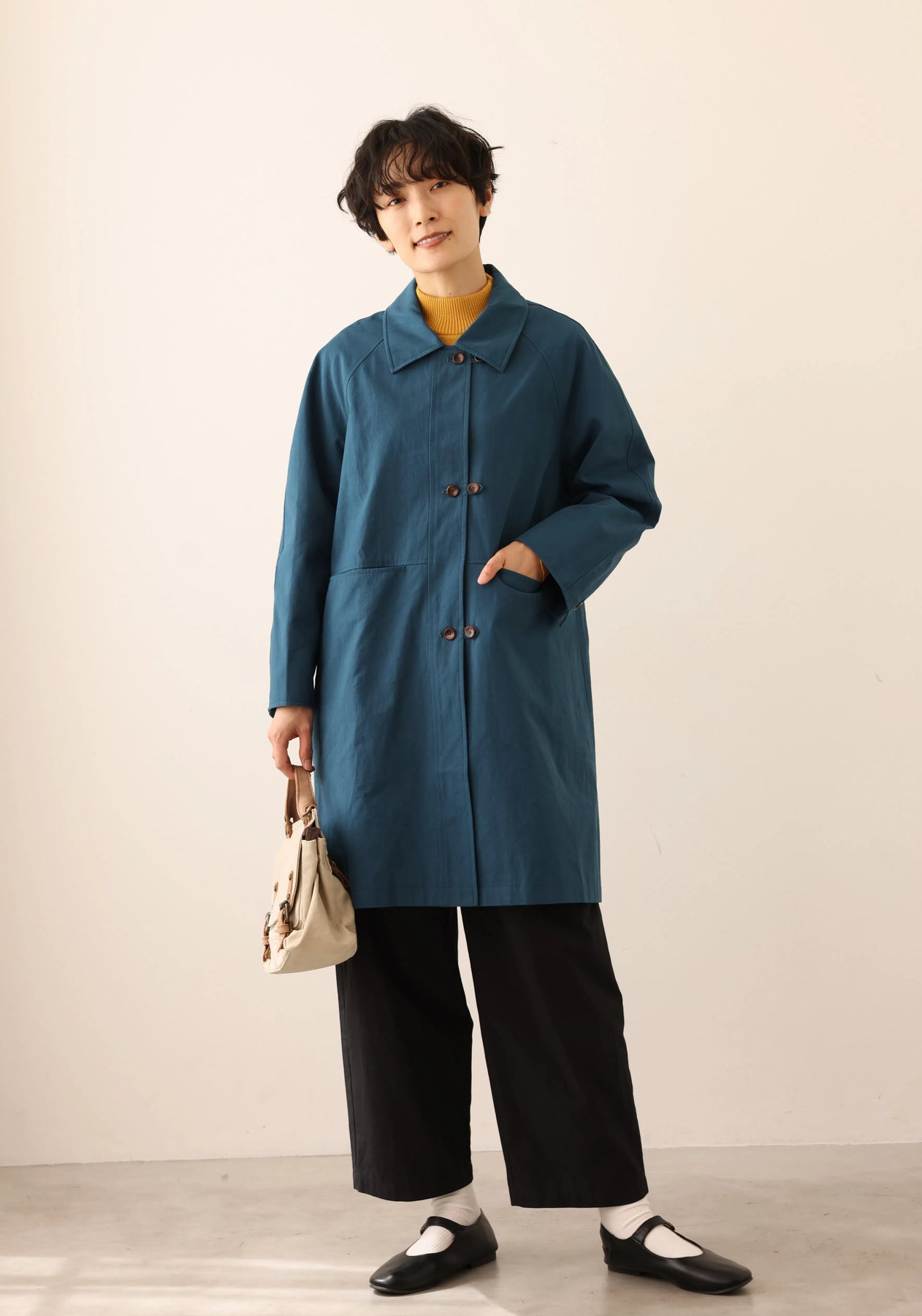 秋の着こなしの主役になるコート ミドル丈コート 240928★高密度のコットン生地で作ったミドル丈コート。★きれいめにもカジュアルにも似合う定番のステンカラー。★中にニットやパーカなどの厚手のインナーを着てもごわつかないのもポイント。★ボリュームのあるワンピースやボトムともバランスよく着こなせます。★袖口はボタンで留められるので、風の侵入を防いでくれます。★さらっと羽織るだけでおしゃれな雰囲気がまとえる一枚です。素材:表地:コットン100%裏地:ポリエステル55% レーヨン45%サイズ:身丈89cmバスト115cm桁丈77cm裾158cmモデルさんの身長:163cm透け感:なし裏地:ありポケット:あり伸縮性:なし光沢感:なしシーズン:春、秋、冬