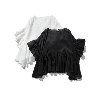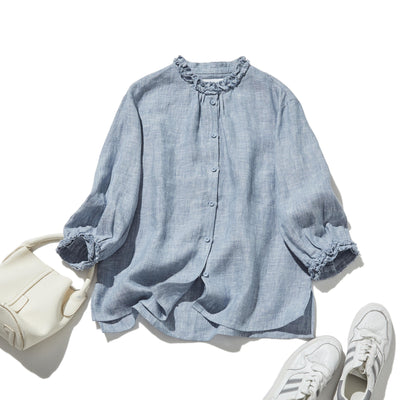 フリルデティールの立体裁断シャツ 長袖 リネンシャツブラウス 250809