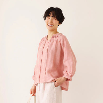 ハンドメイド感たっぷりのチュックドブラウス リネン100% リネンブラウス ピンク 250810