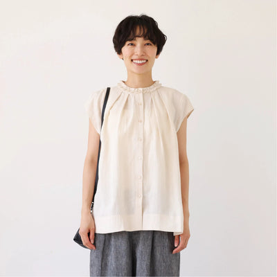 夏の快適さと上品さを兼ね備えた リネン フリル襟ブラウス ベージュ 250716-1