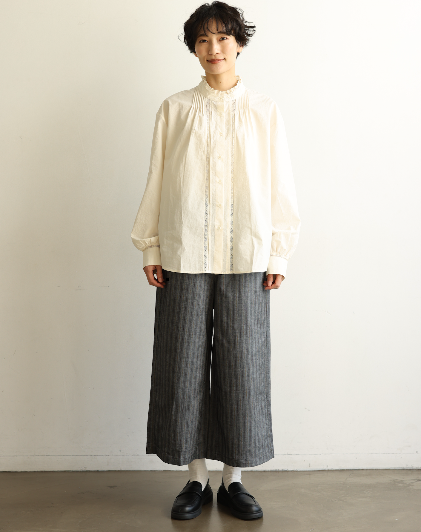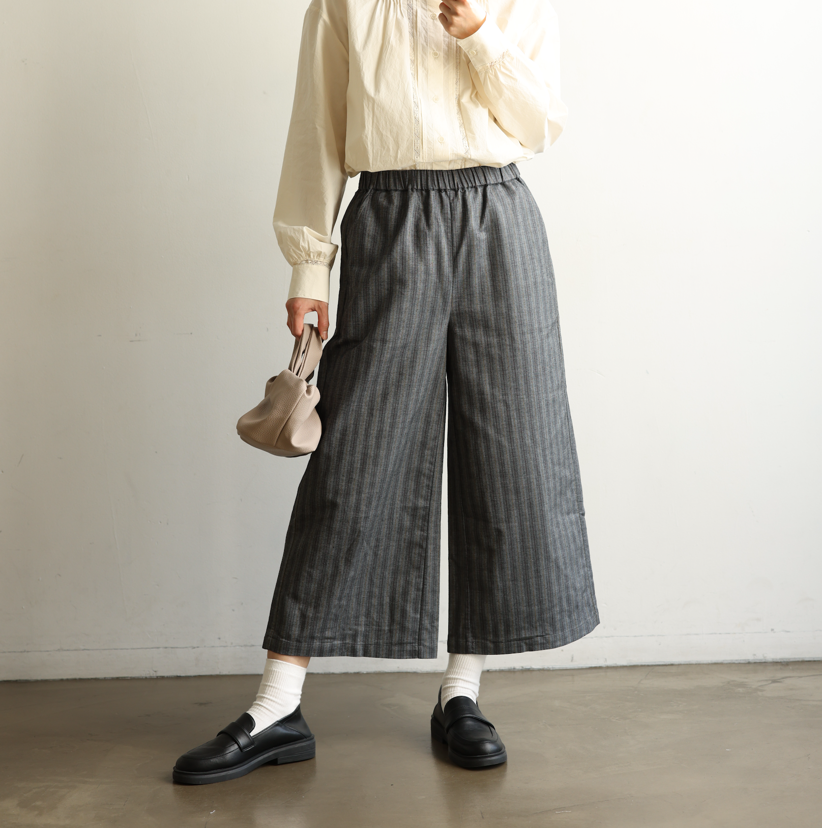 ニュアンスのある生地感が楽しめる、先染めストライプ生地ワイドパンツ コットンリネン   240401