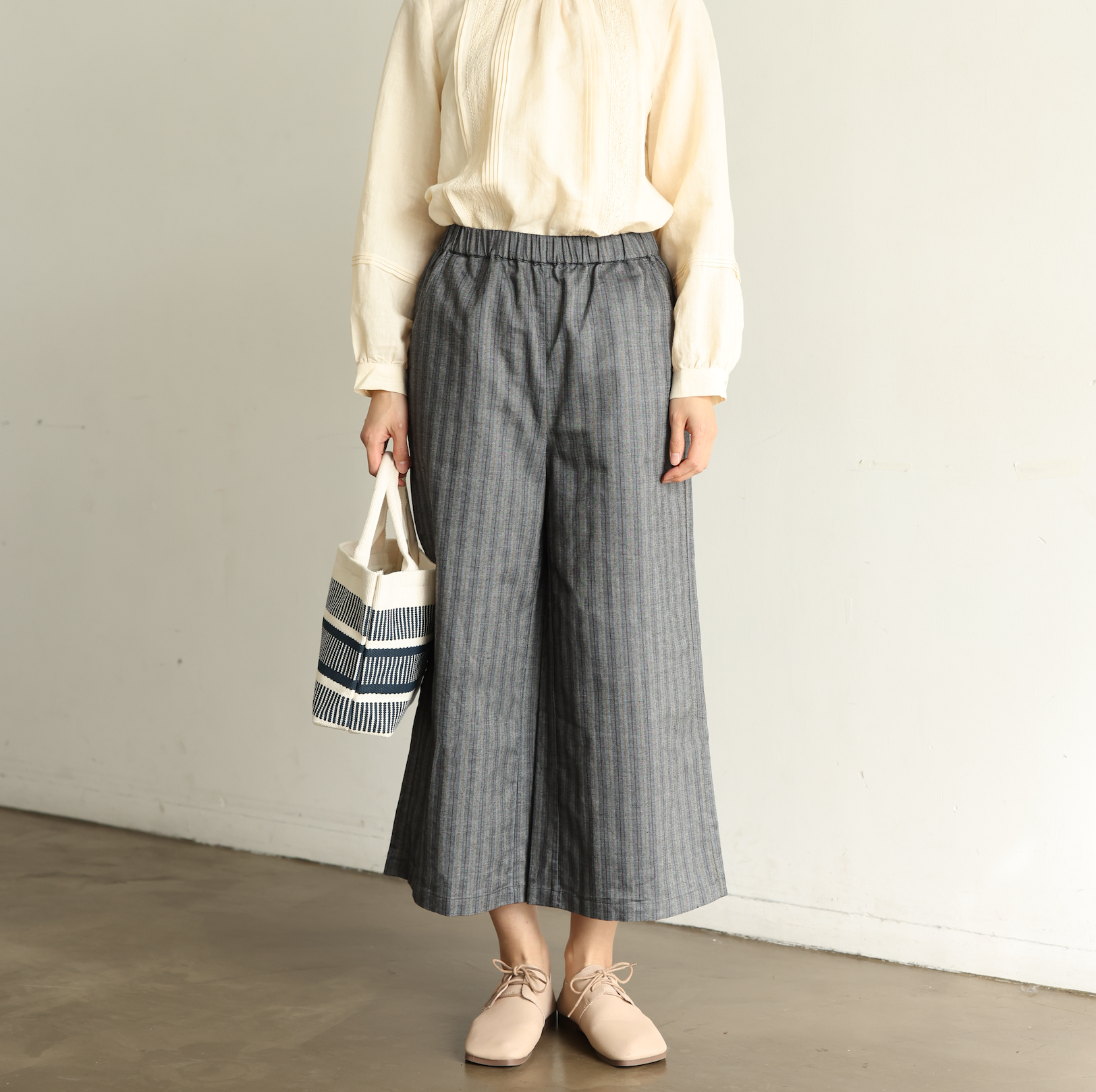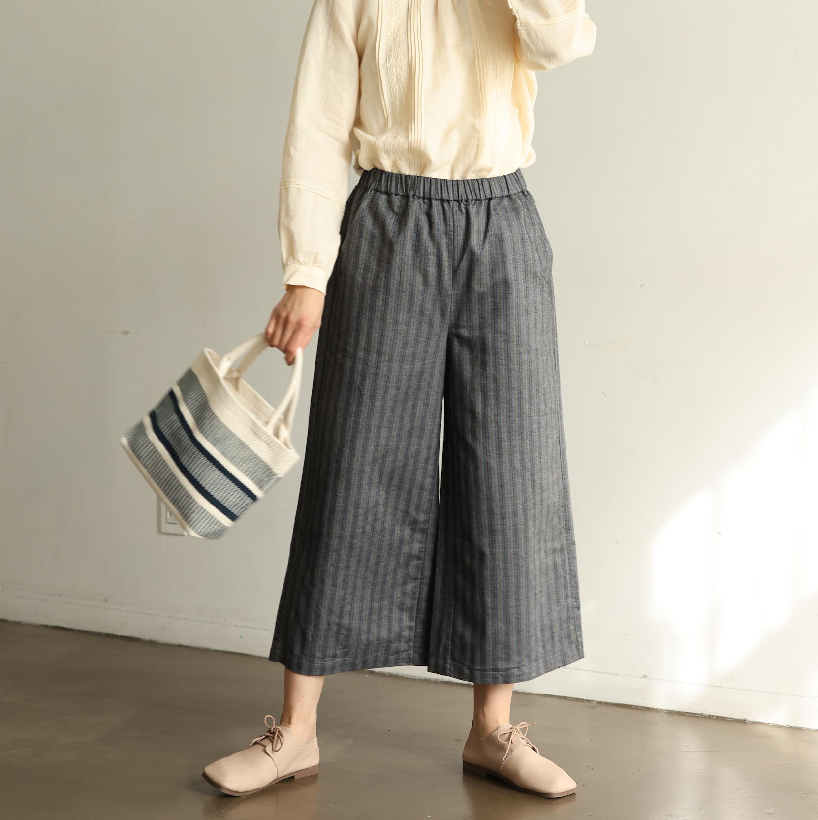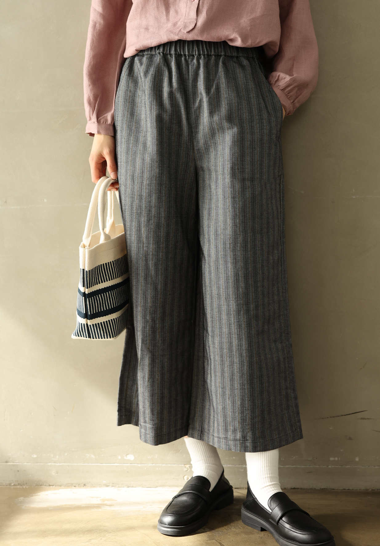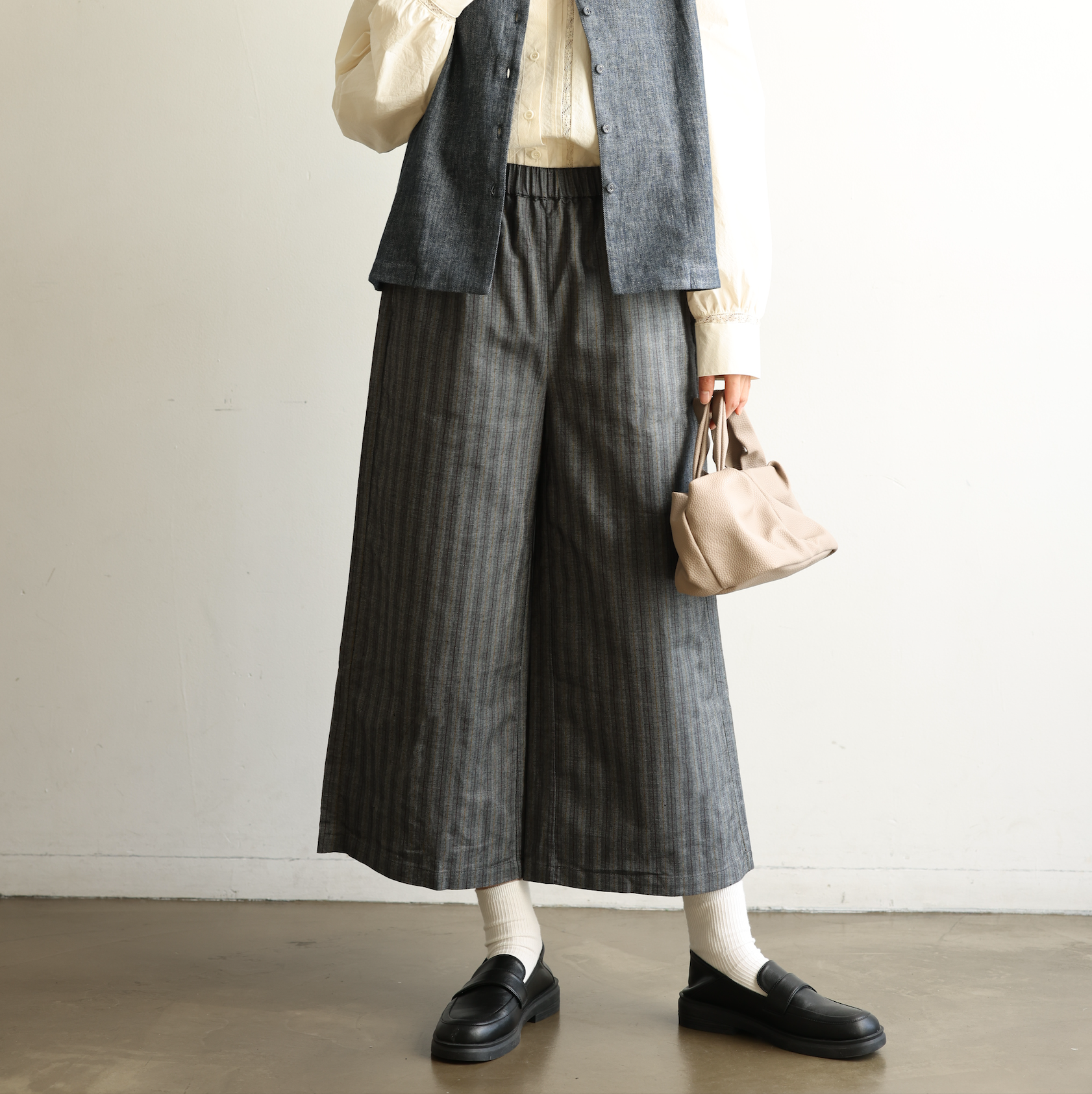 ニュアンスのある生地感が楽しめる、先染めストライプ生地ワイドパンツ コットンリネン    240401
