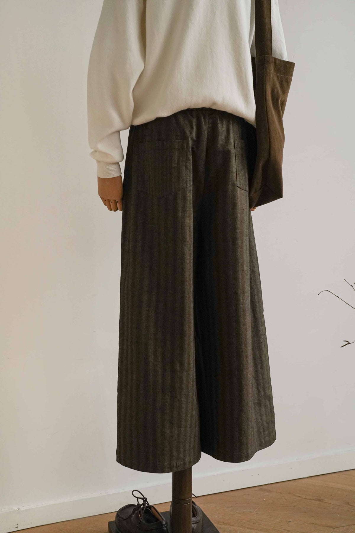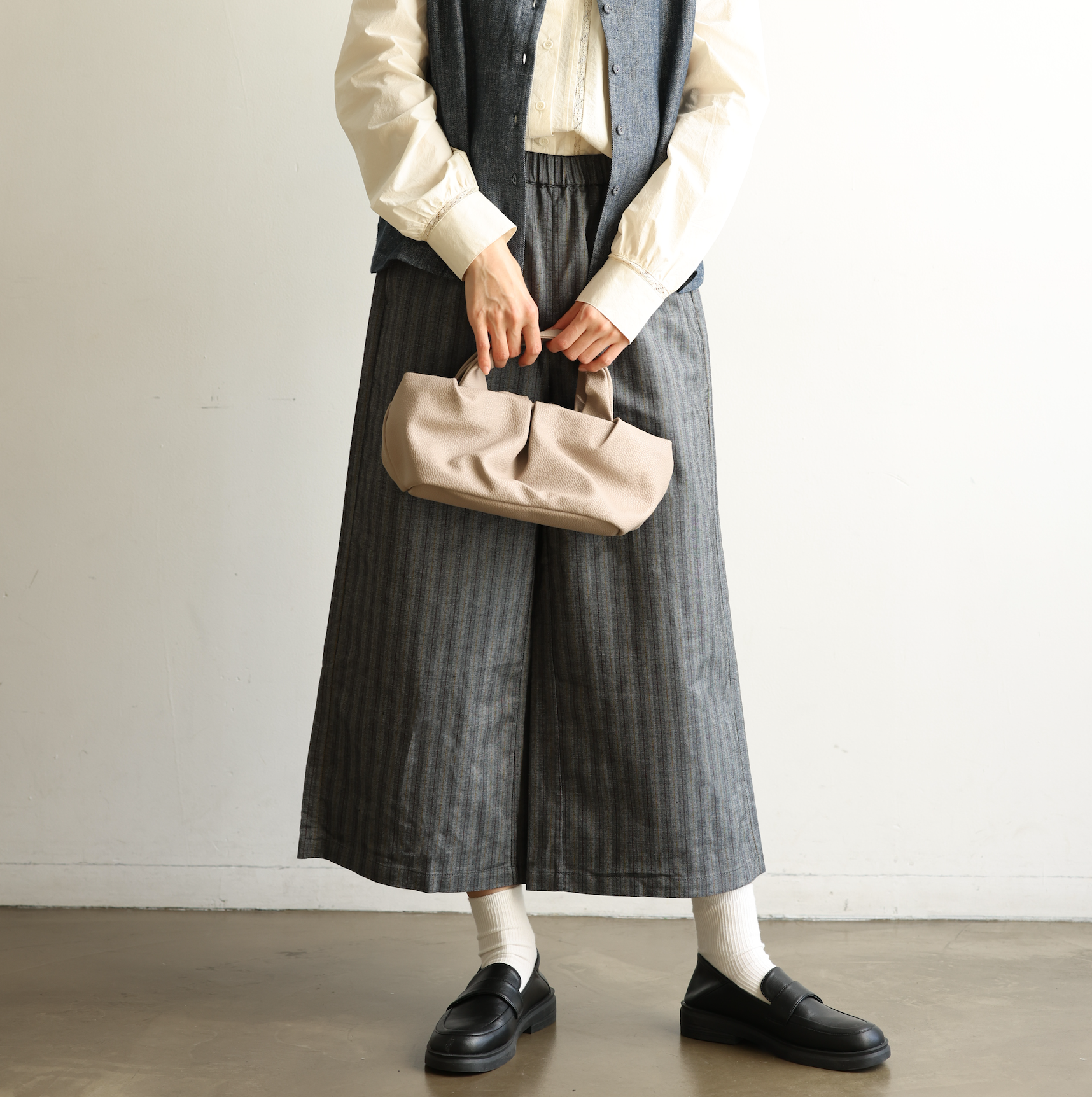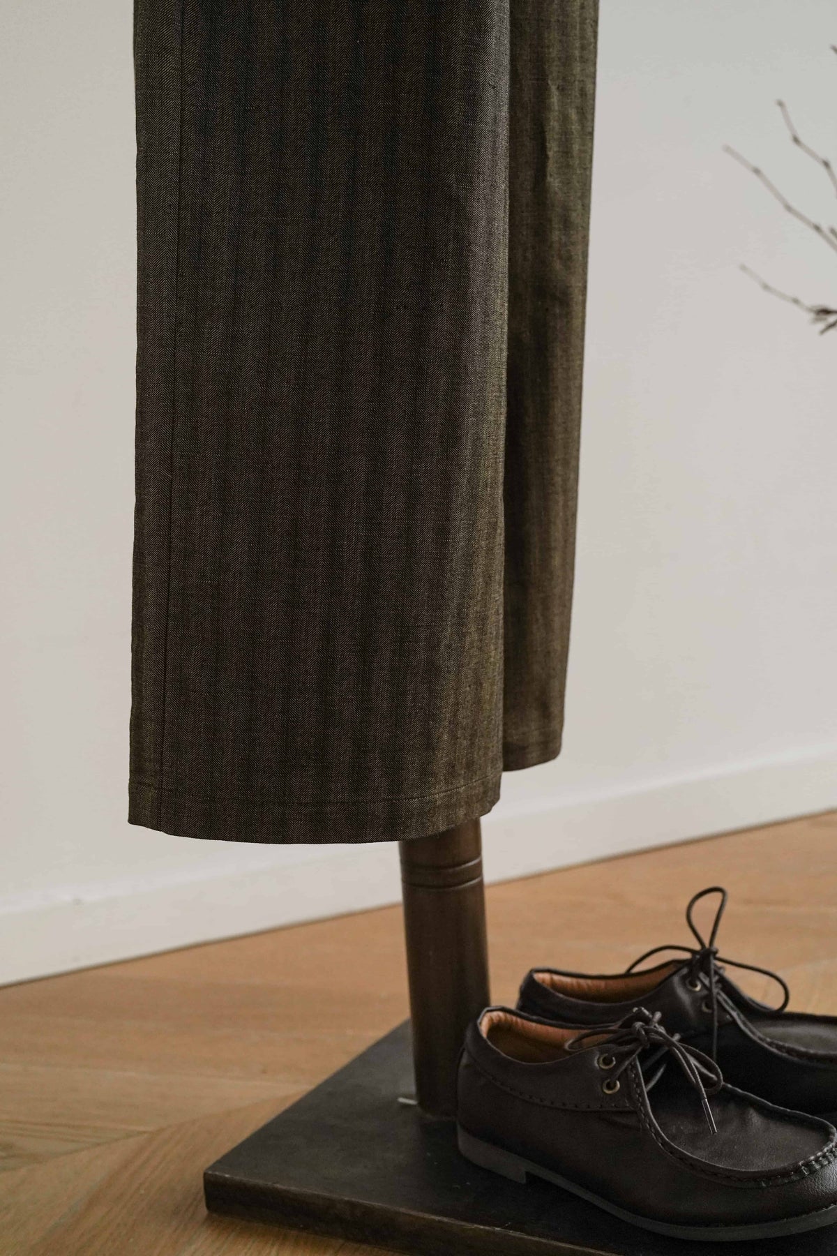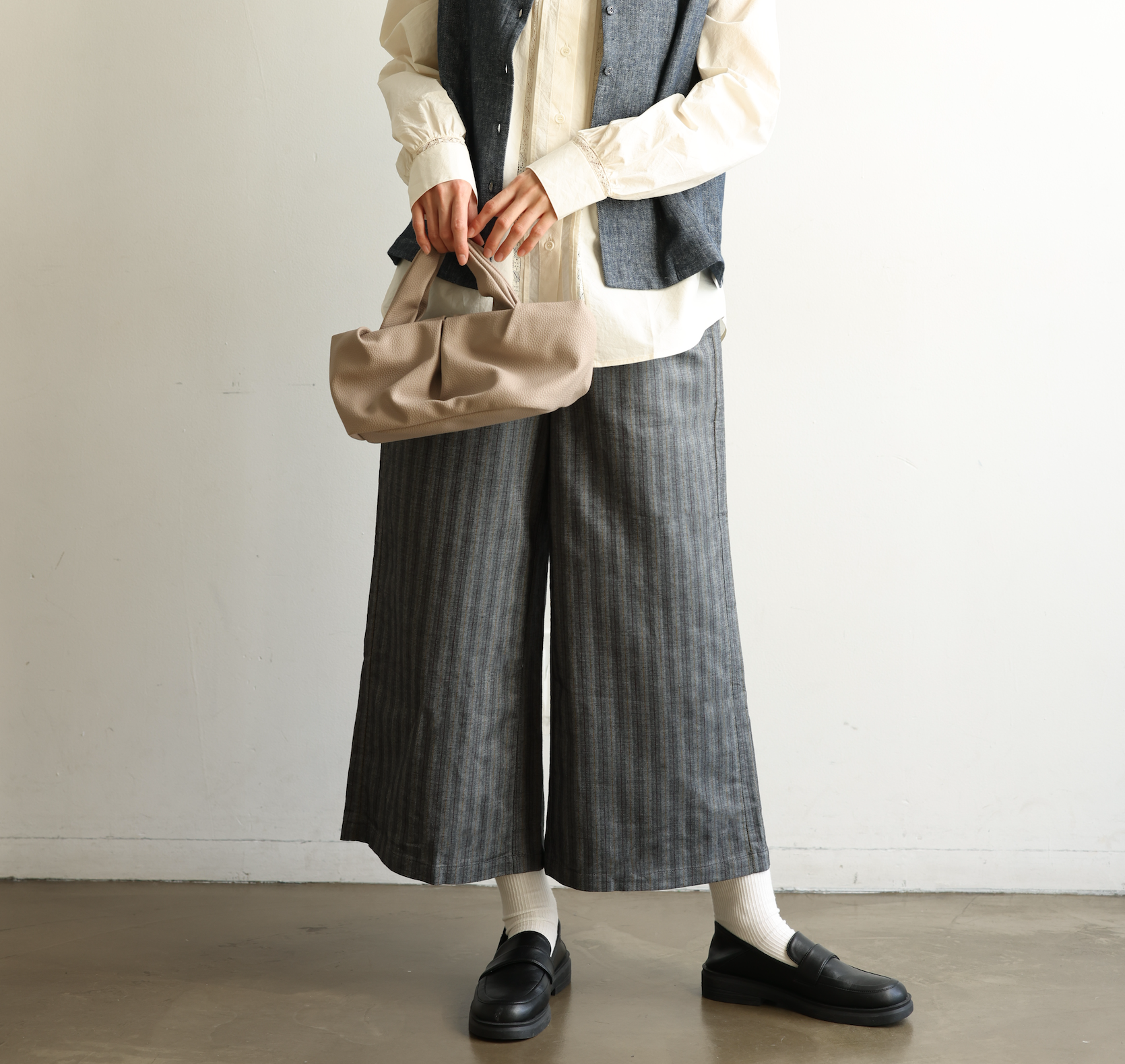 ニュアンスのある生地感が楽しめる、先染めストライプ生地ワイドパンツ コットンリネン    240401