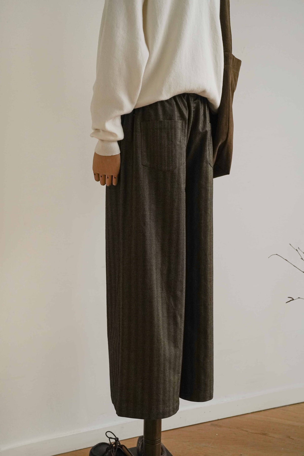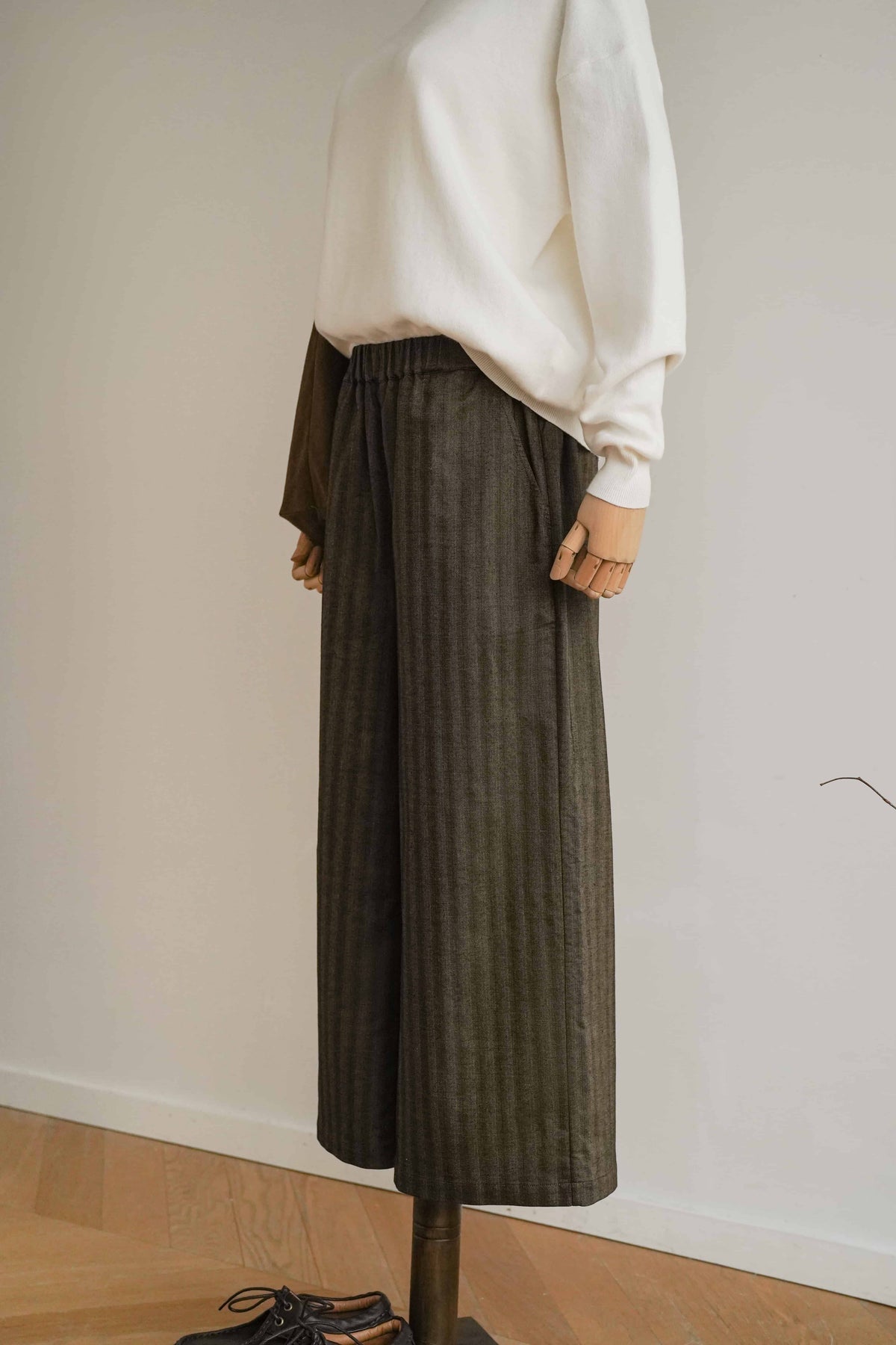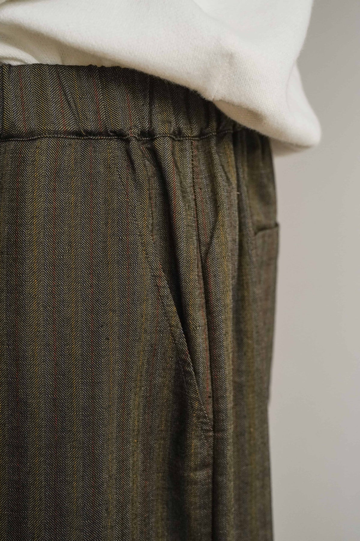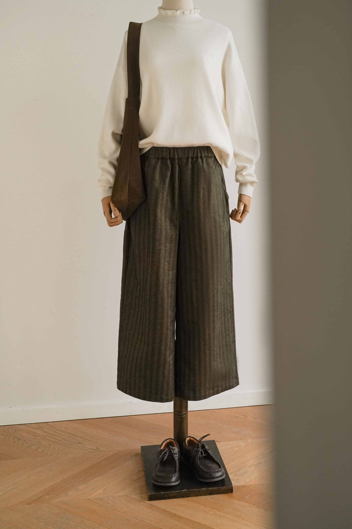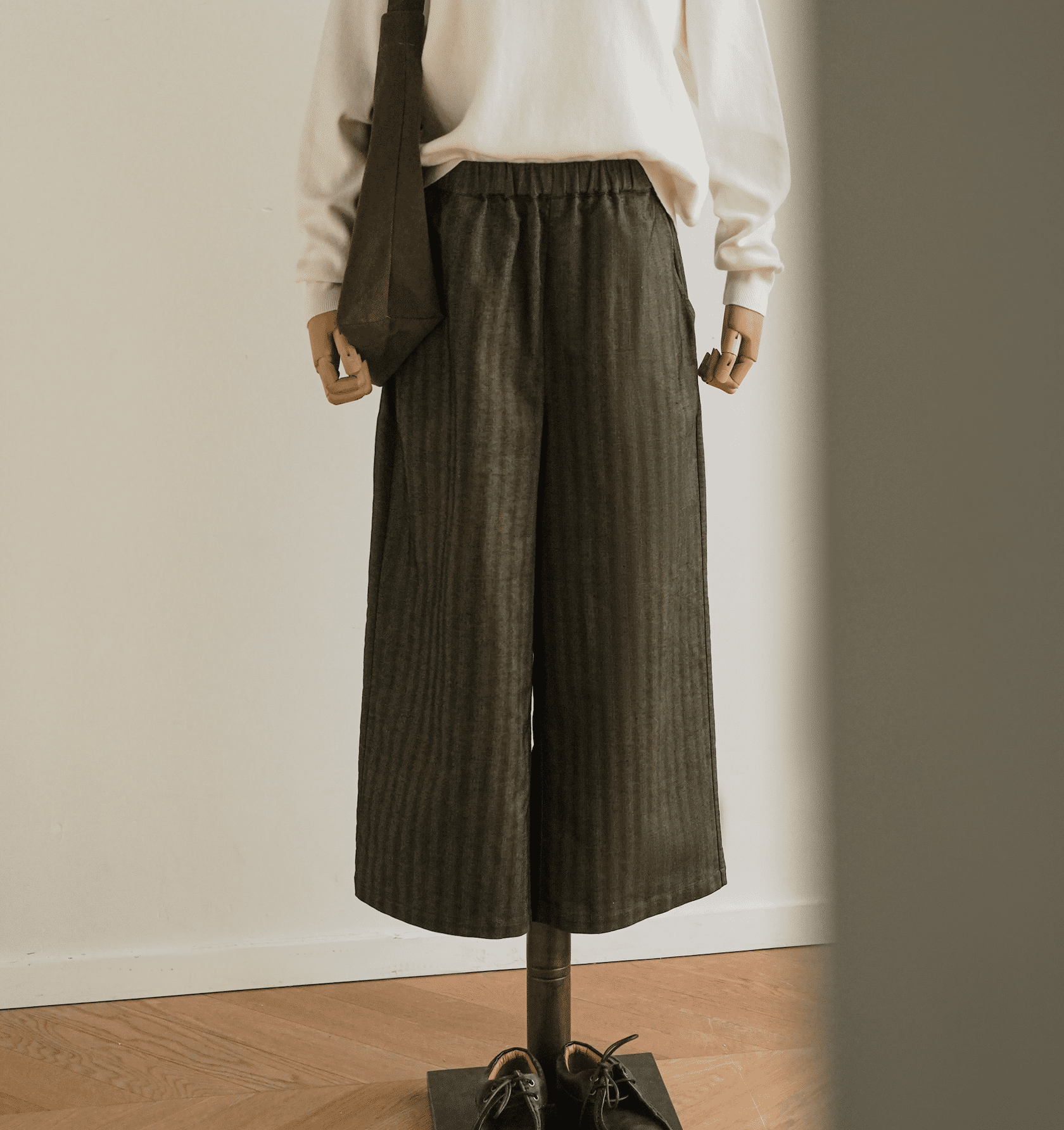 ニュアンスのある生地感が楽しめる、先染めストライプ生地ワイドパンツ コットンリネン    240401