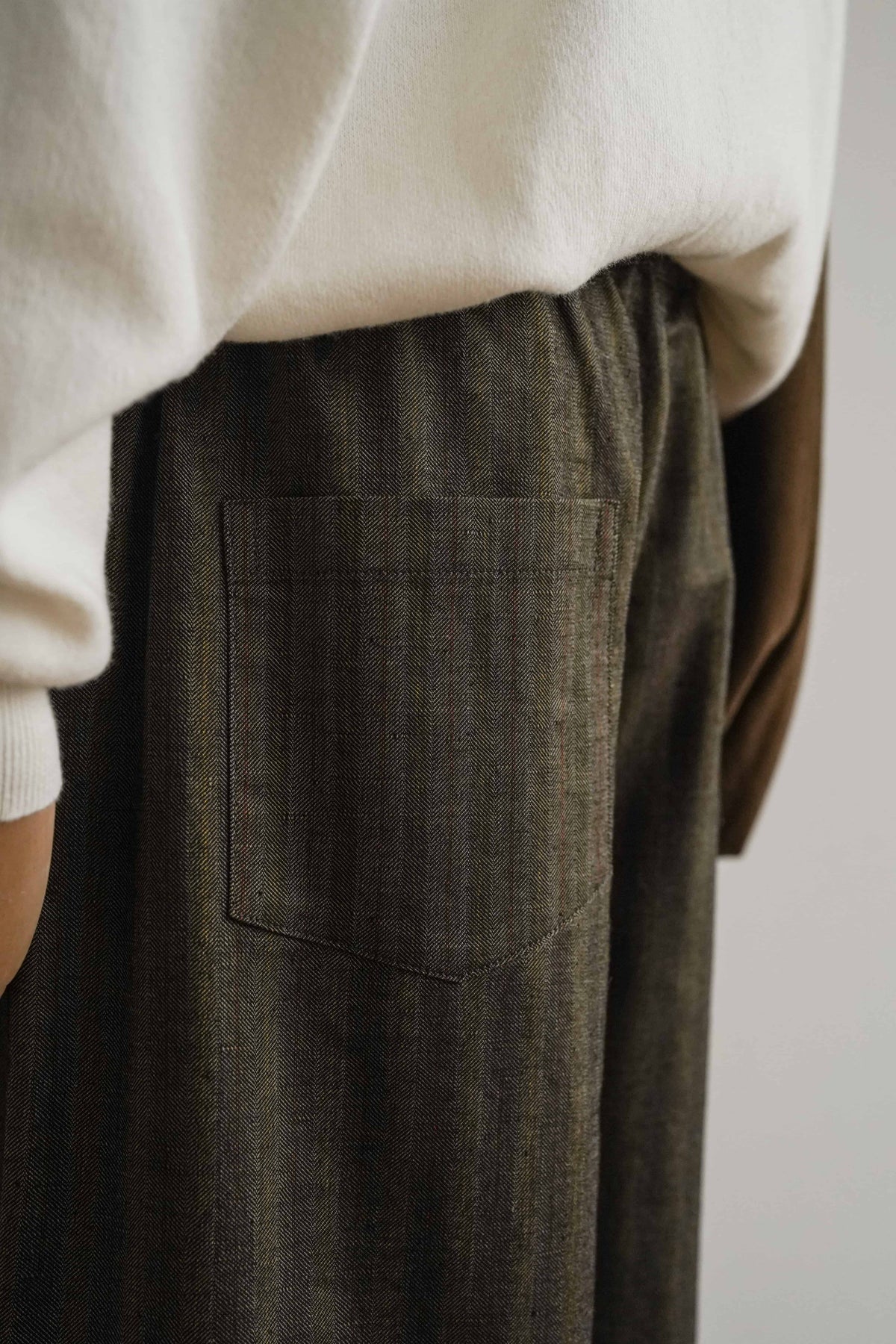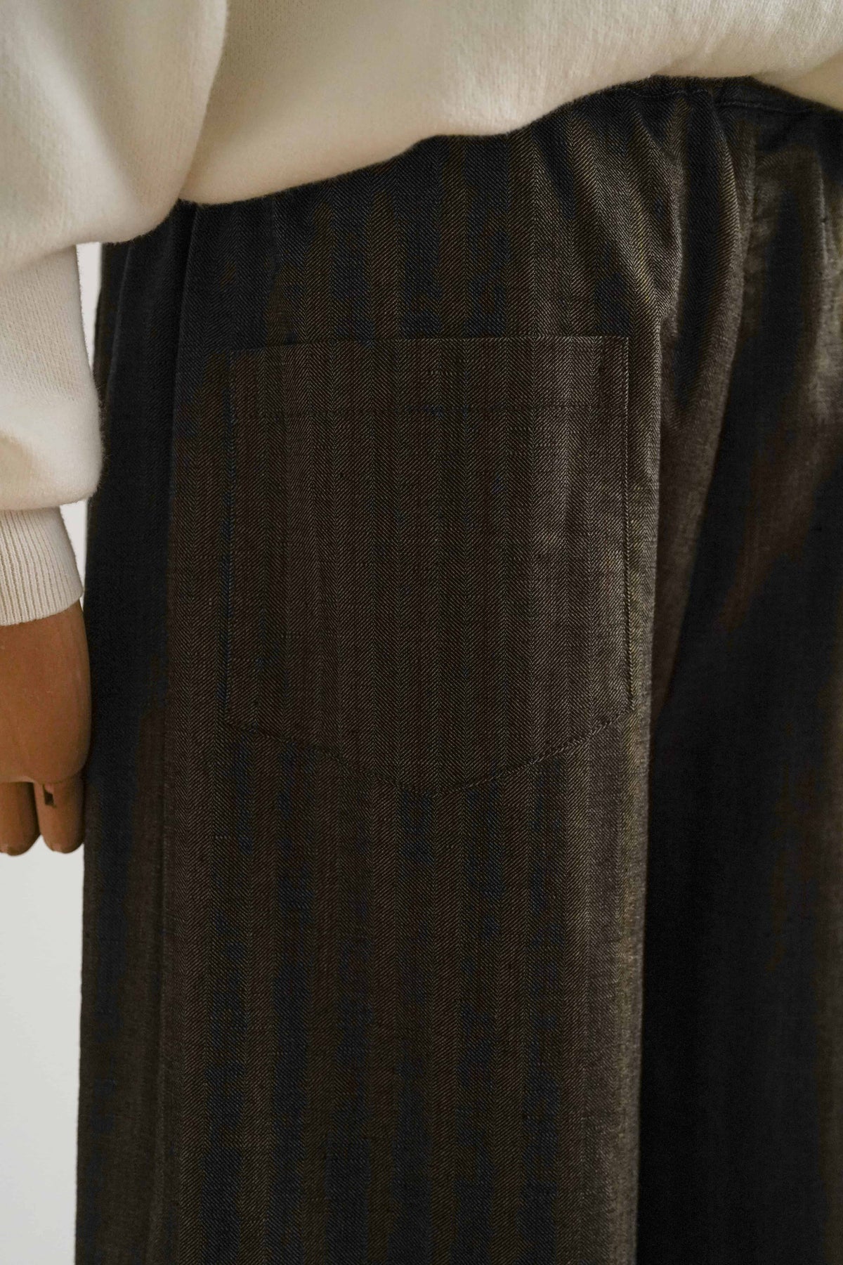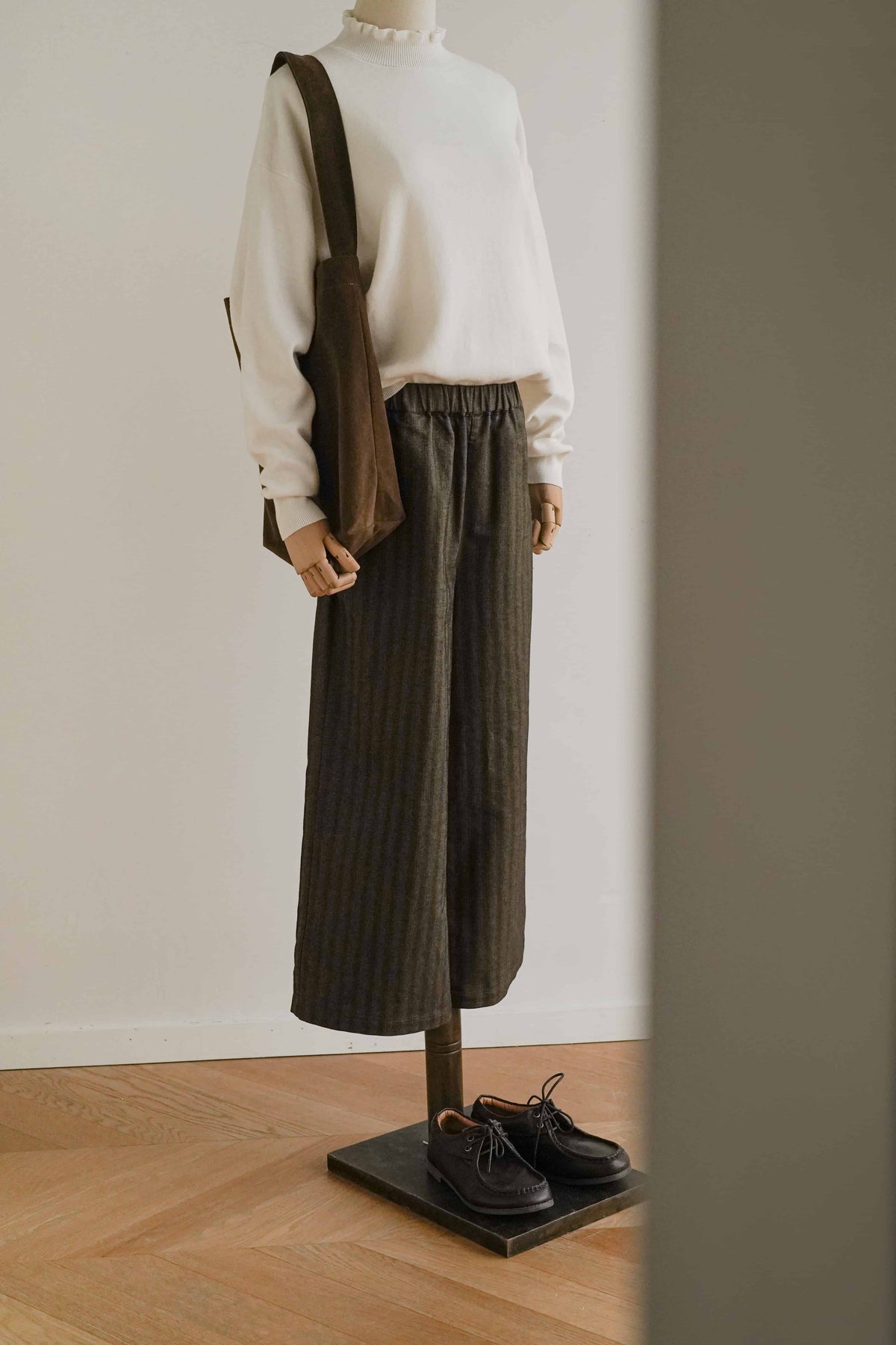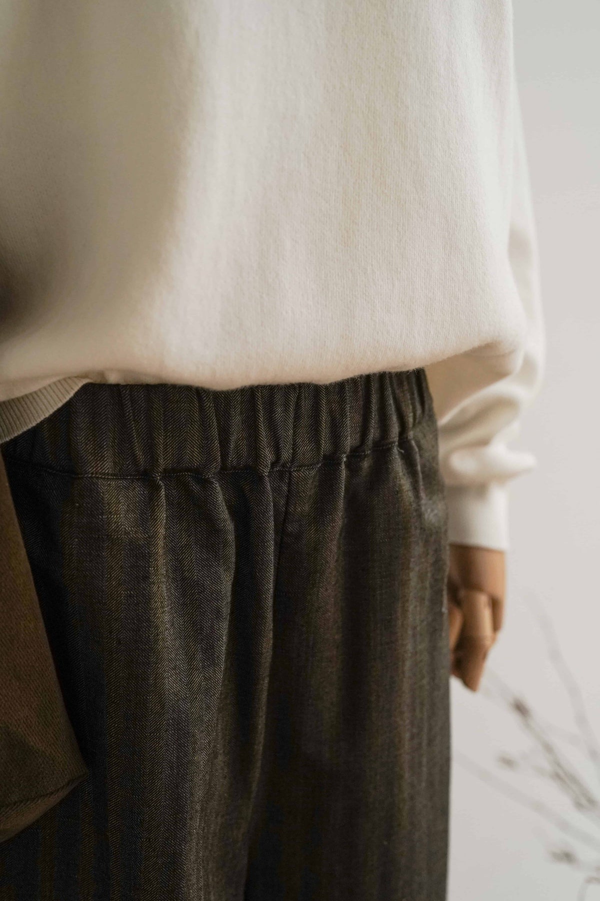 ニュアンスのある生地感が楽しめる、先染めストライプ生地ワイドパンツ コットンリネン    240401