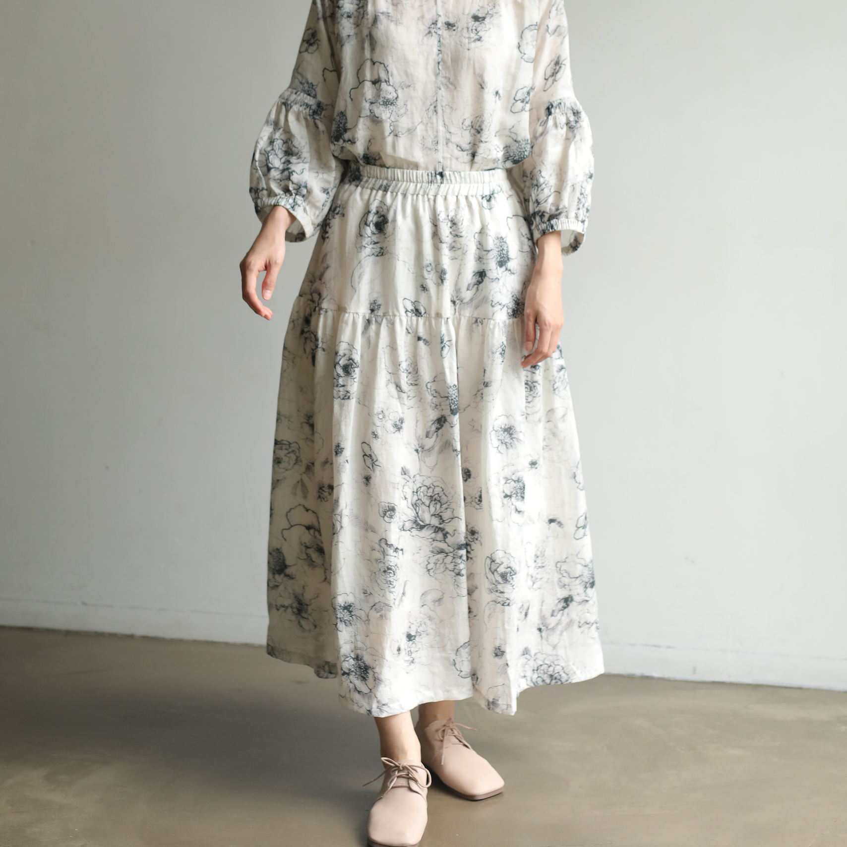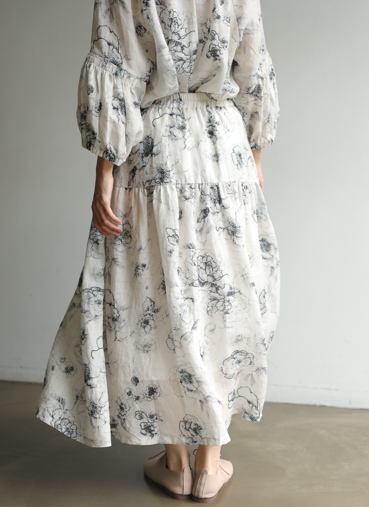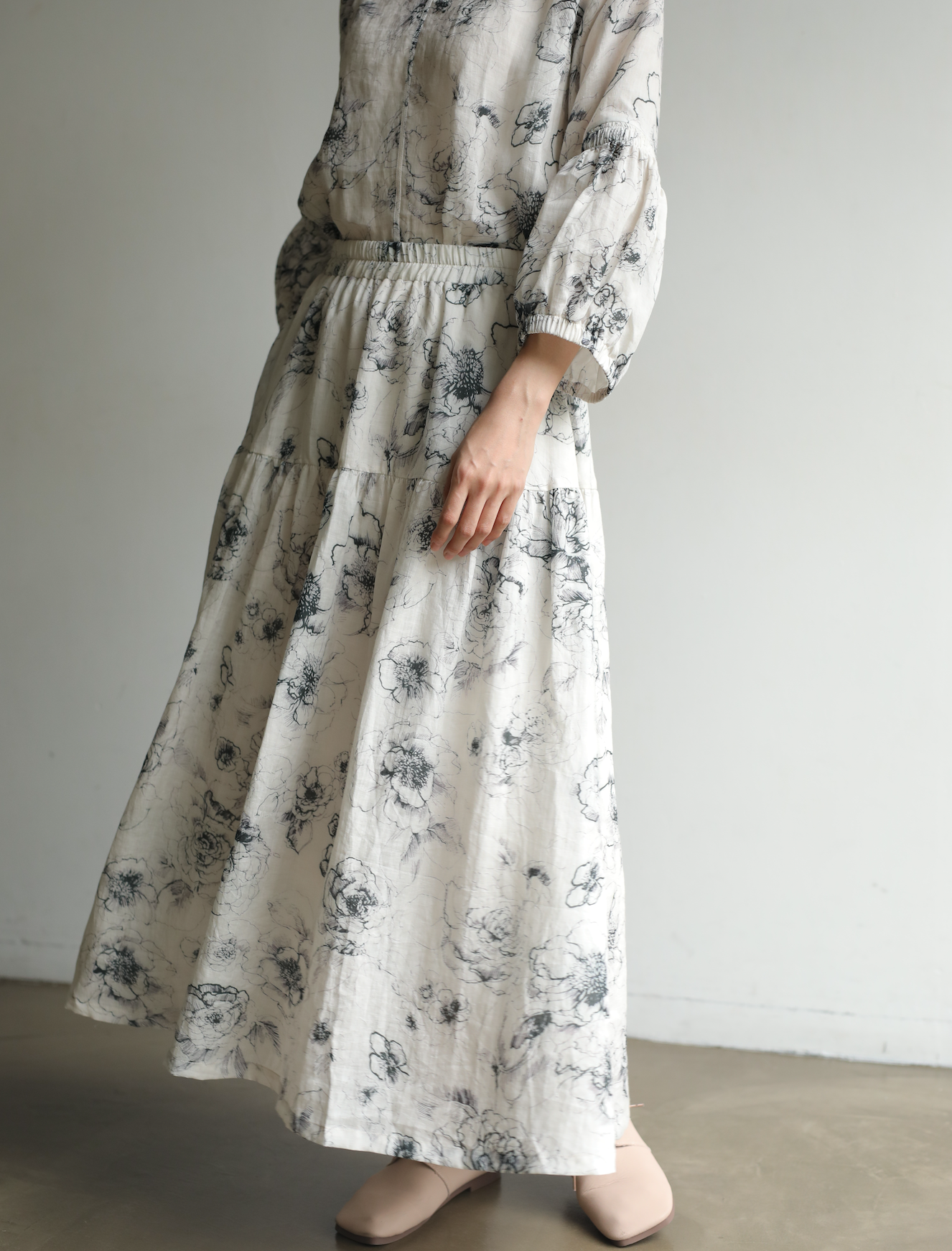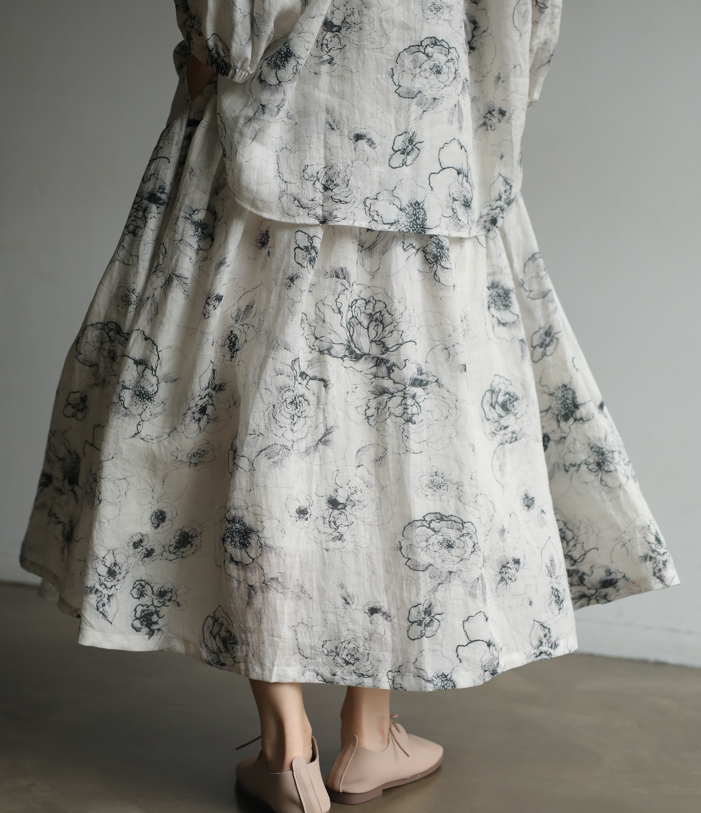 優しく揺れる、ゆるふわギャザースカート バラー柄 麻のロングスカート 裏地付き 230610-1