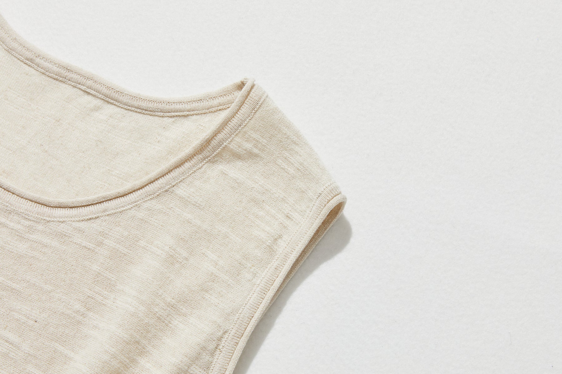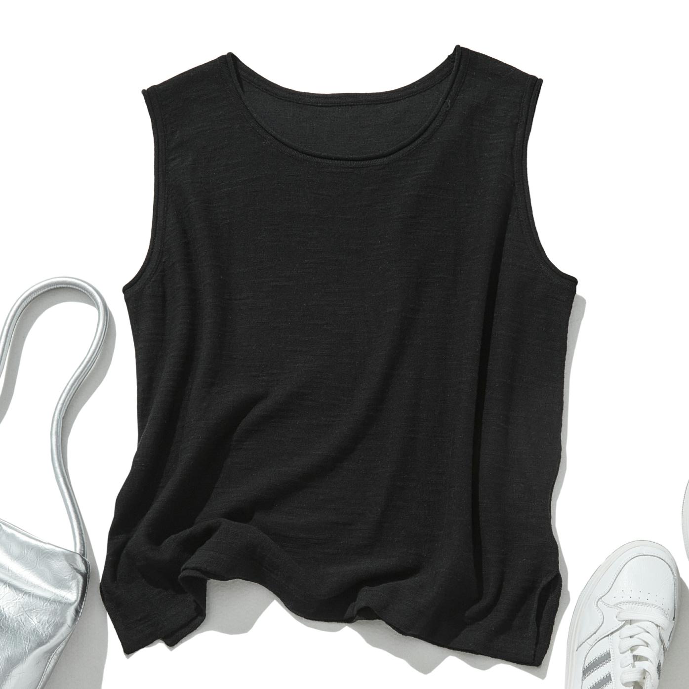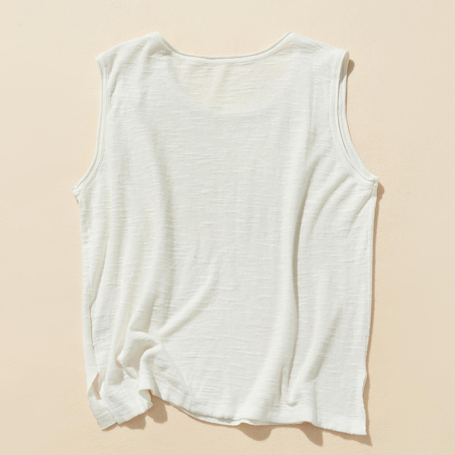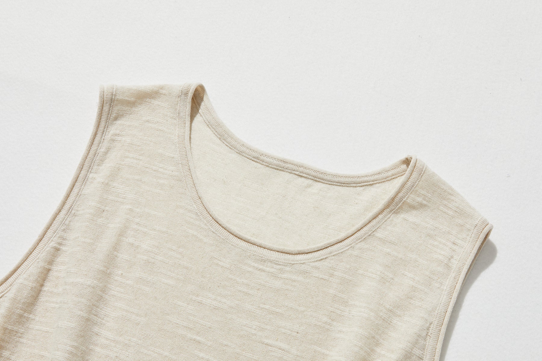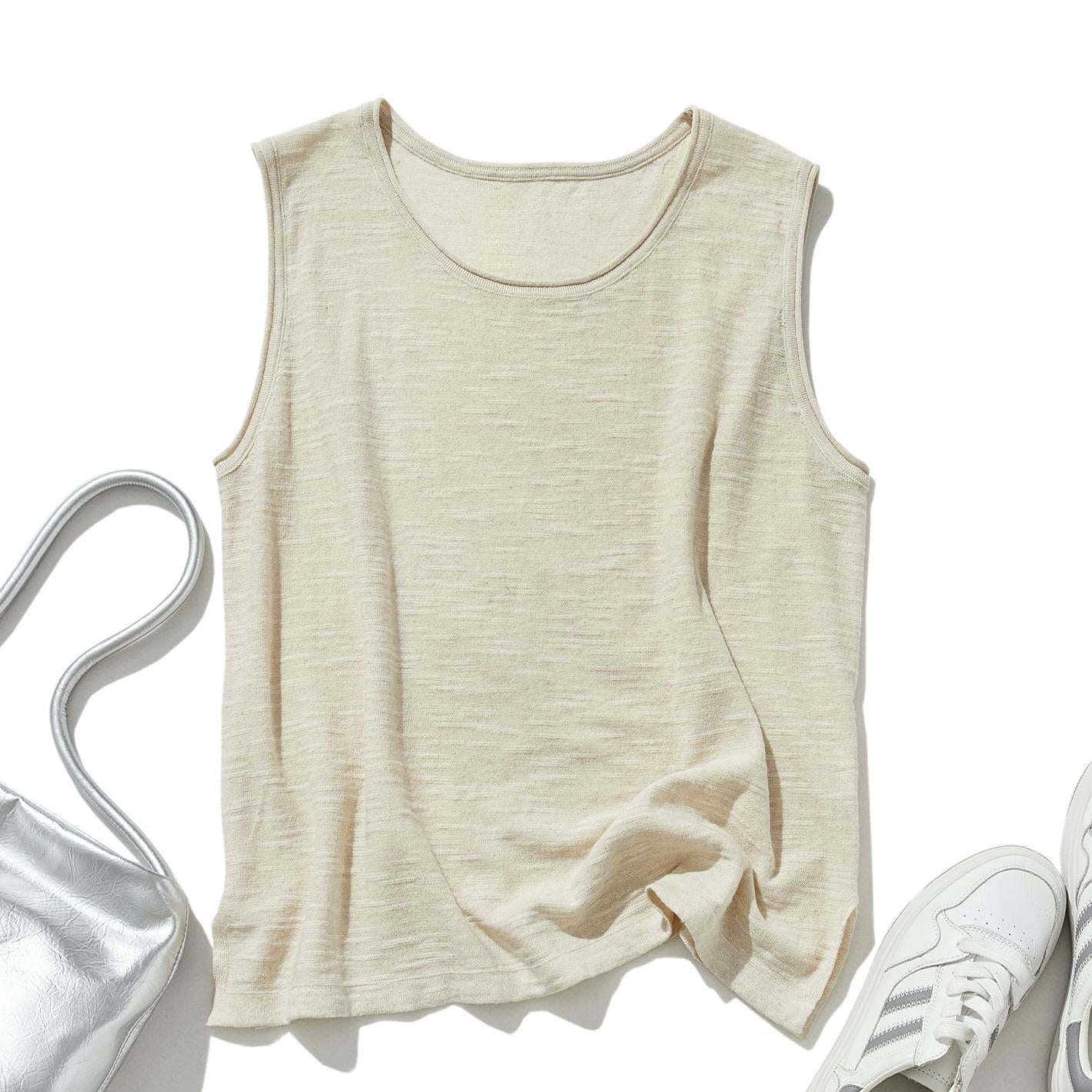 毎日、心地よく着られる実力派タンクトップ コットンリネントップス 240702★素肌に触れて心地良い、ソフトで伸びやかなコットンリネン 。★厚すぎず薄すぎず、インナーユースでも着ぶくれしにくい厚み★ゆったりと着られる、締めつけの少ないシルエット★やや裾広がりでウエストまわりのもたつきを回避★さらりとした着心地で、インナーやアウターと合わせることでレイヤードスタイルも楽しめます。素材:コットン45% リネン55%サイズ:身丈61cmバスト98cm裾104cmアームホール46cm首回り62cm透け感:若干あり裏地:なしポケット:なし伸縮性:あり光沢感:なしシーズン:春、夏、秋