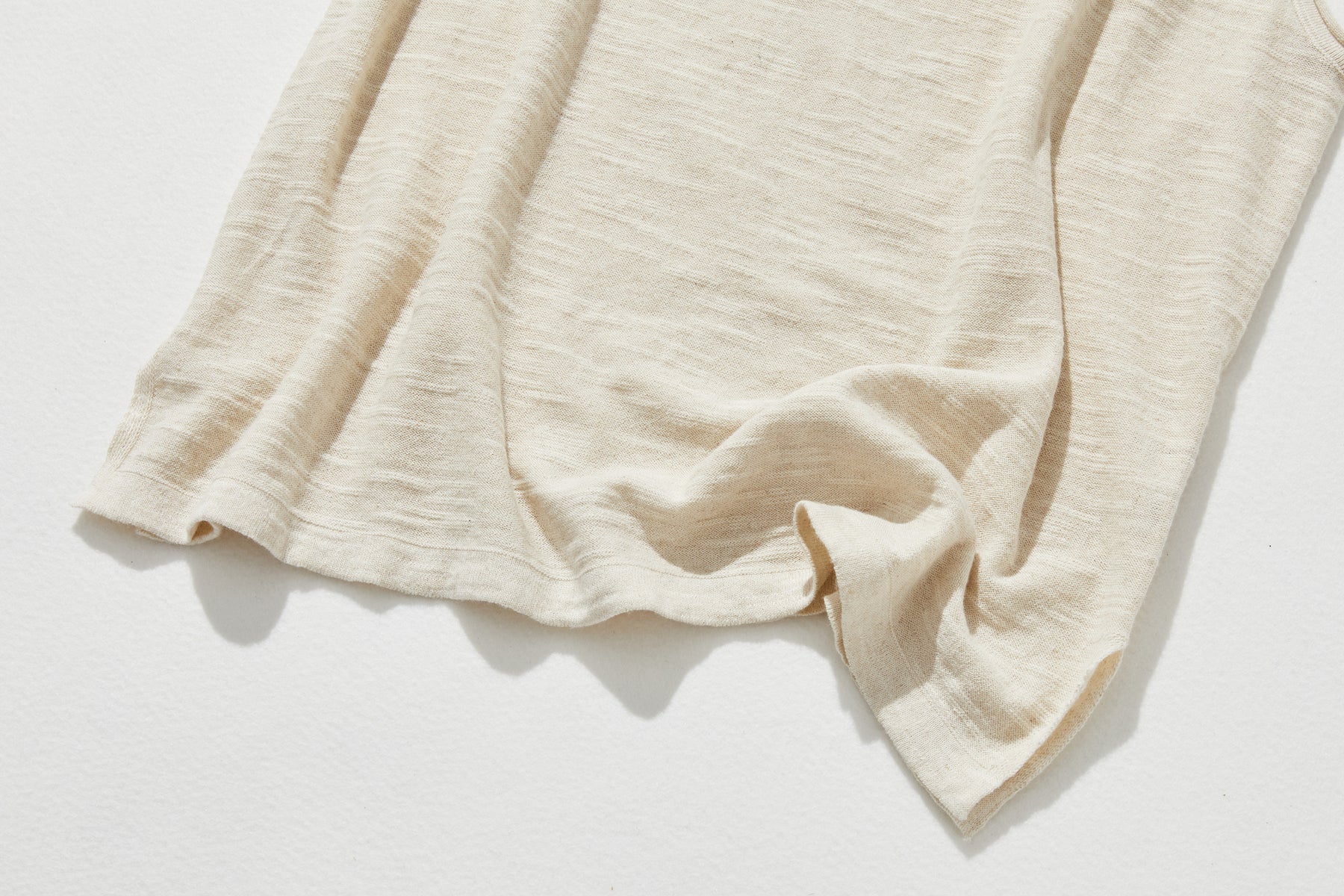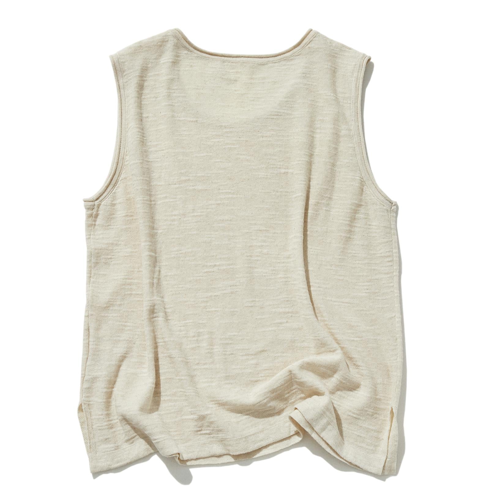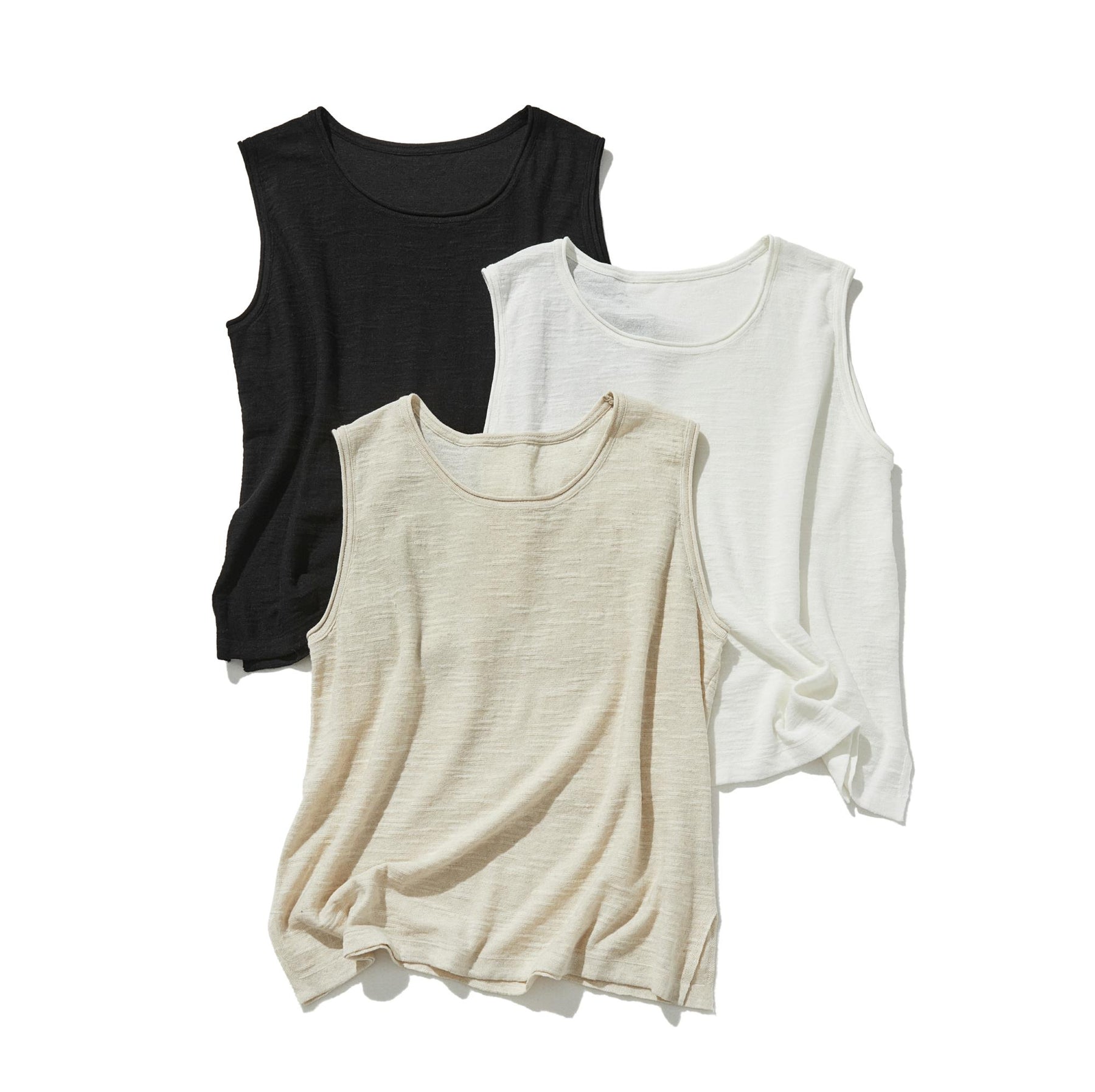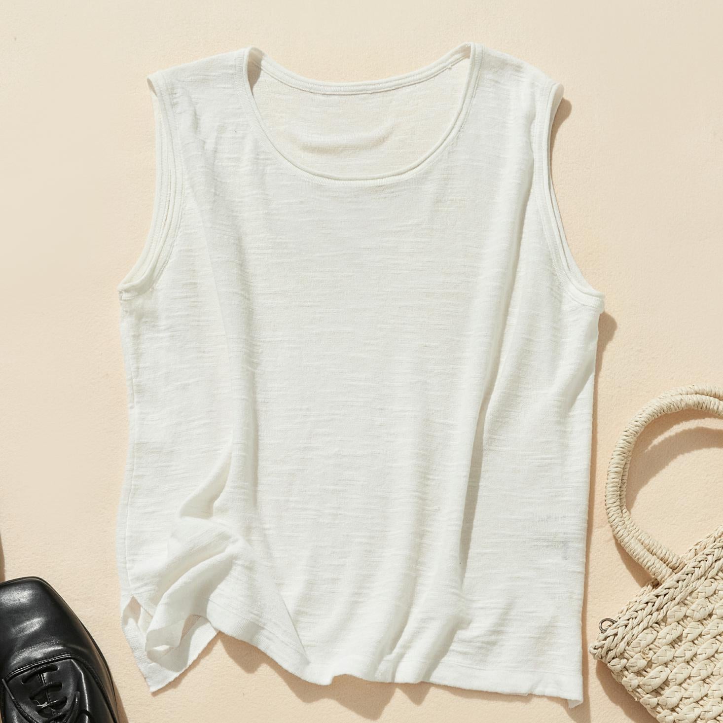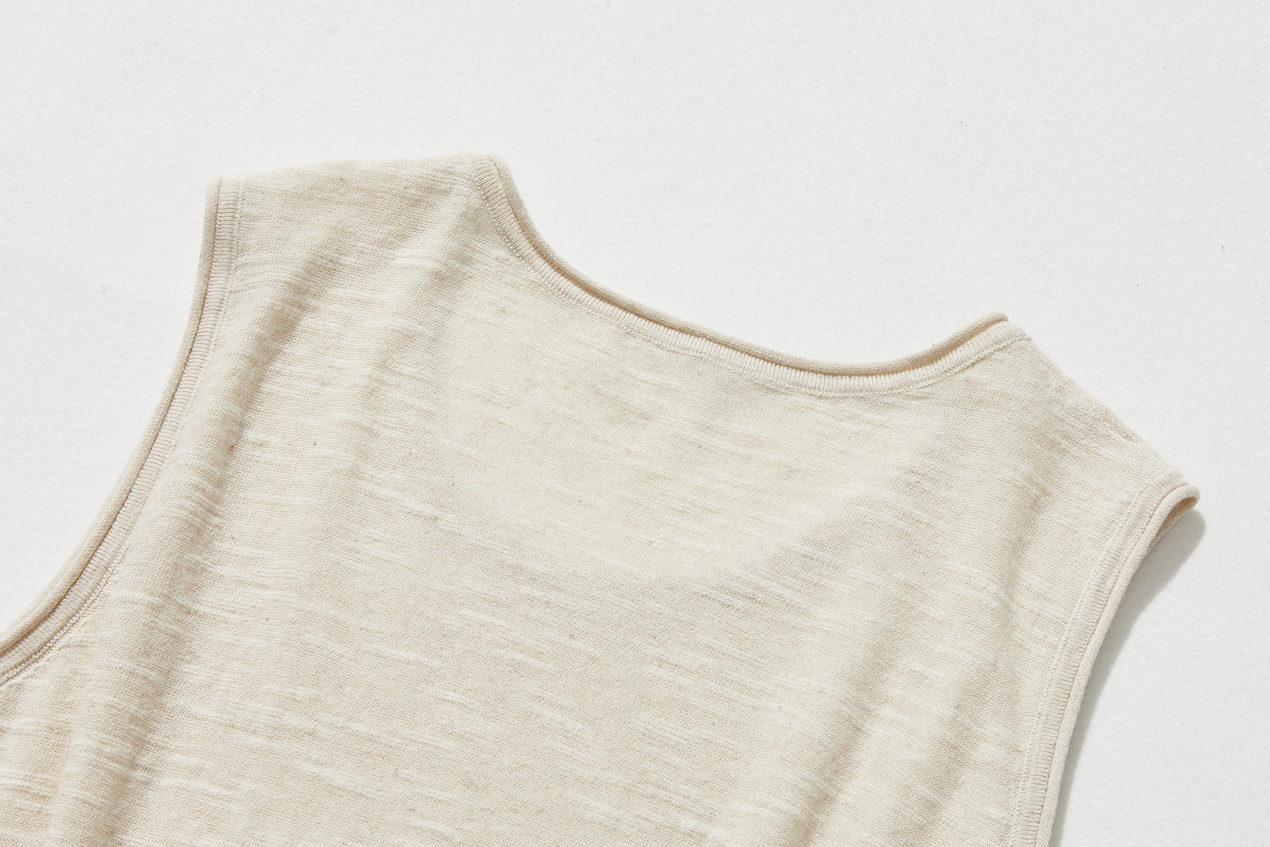 毎日、心地よく着られる実力派タンクトップ コットンリネントップス 240702★素肌に触れて心地良い、ソフトで伸びやかなコットンリネン 。★厚すぎず薄すぎず、インナーユースでも着ぶくれしにくい厚み★ゆったりと着られる、締めつけの少ないシルエット★やや裾広がりでウエストまわりのもたつきを回避★さらりとした着心地で、インナーやアウターと合わせることでレイヤードスタイルも楽しめます。素材:コットン45% リネン55%サイズ:身丈61cmバスト98cm裾104cmアームホール46cm首回り62cm透け感:若干あり裏地:なしポケット:なし伸縮性:あり光沢感:なしシーズン:春、夏、秋