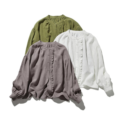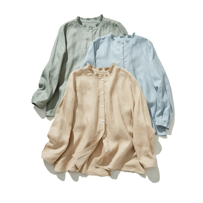 さり気ない大人の可愛さを感じられるリネンブラウス フリルネック リネン100% 240323
