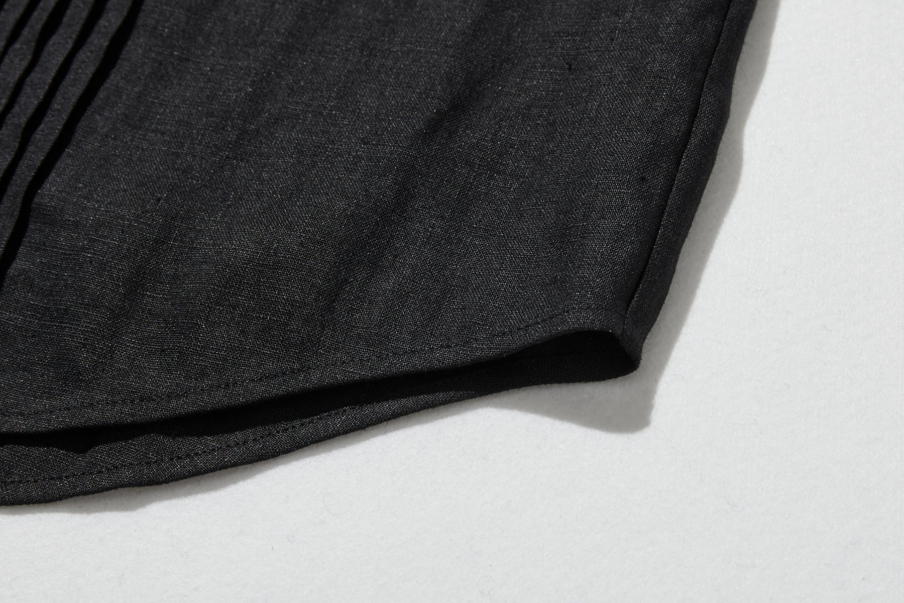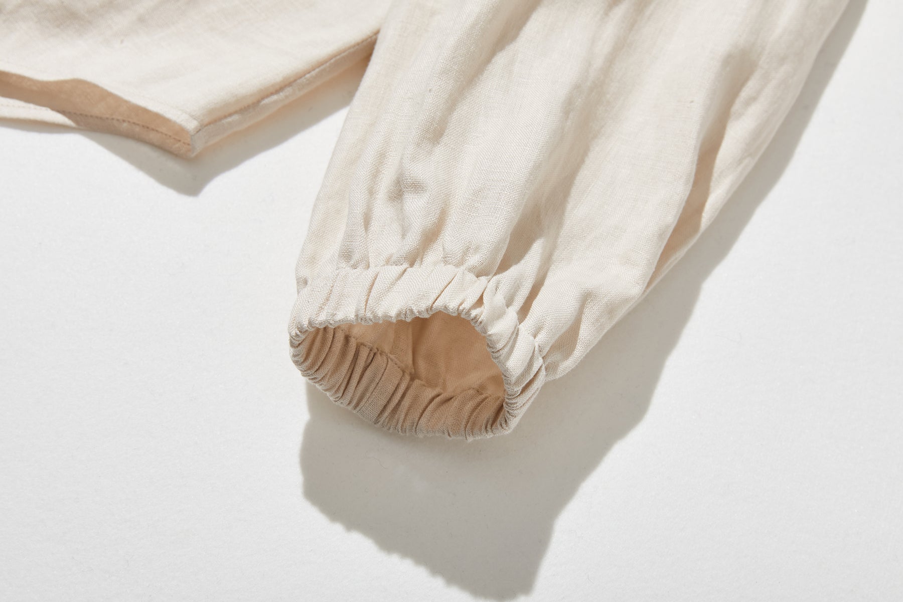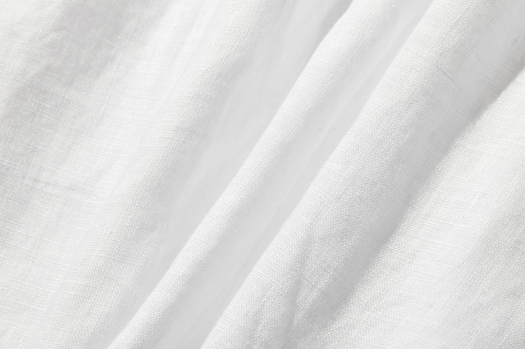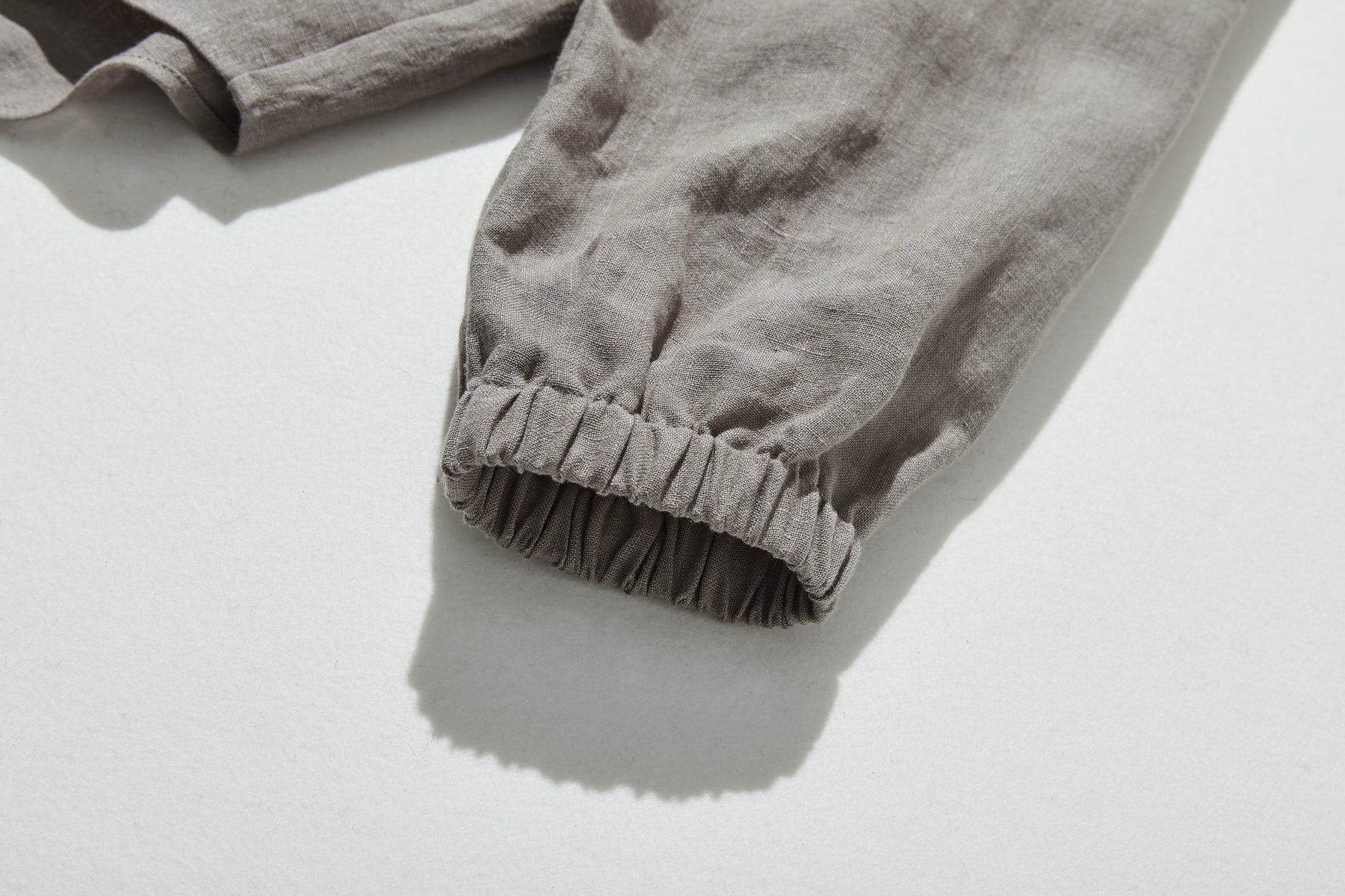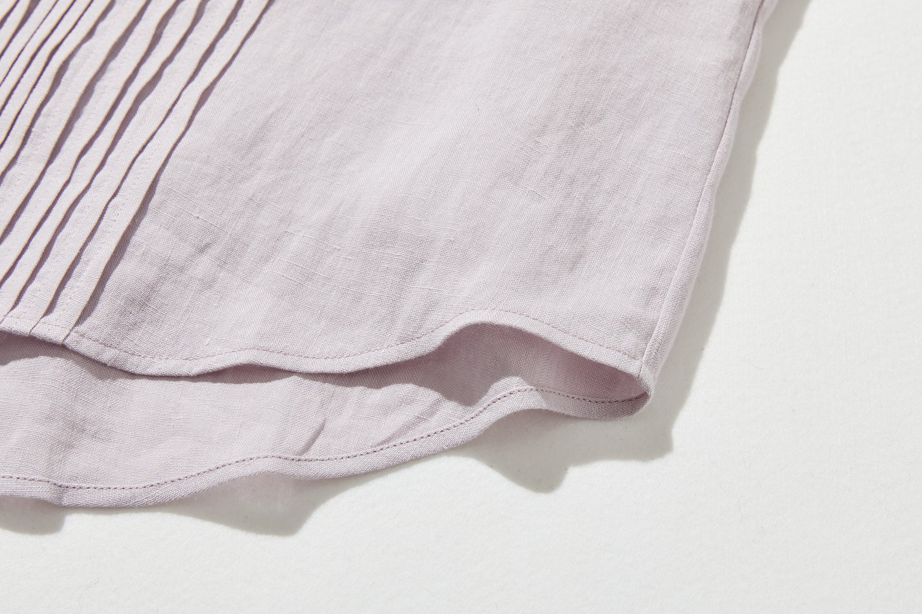 素材の風合い: フレンチリネンならではの、なめらかでやや光沢のある質感が、シンプルなデザインをさらに引き立てます。洗いを重ねるほどに味わい深くなる素材の特性も魅力です。