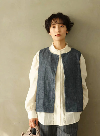 いつものスタイリングのマンネリ化を解消します。2wayヘリンボン織り生地 デニムベスト コットン 240913-1