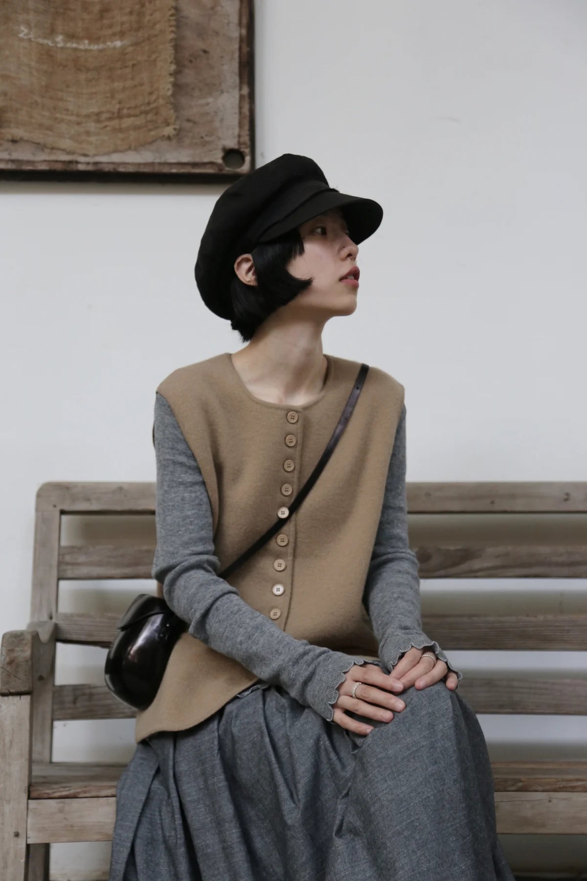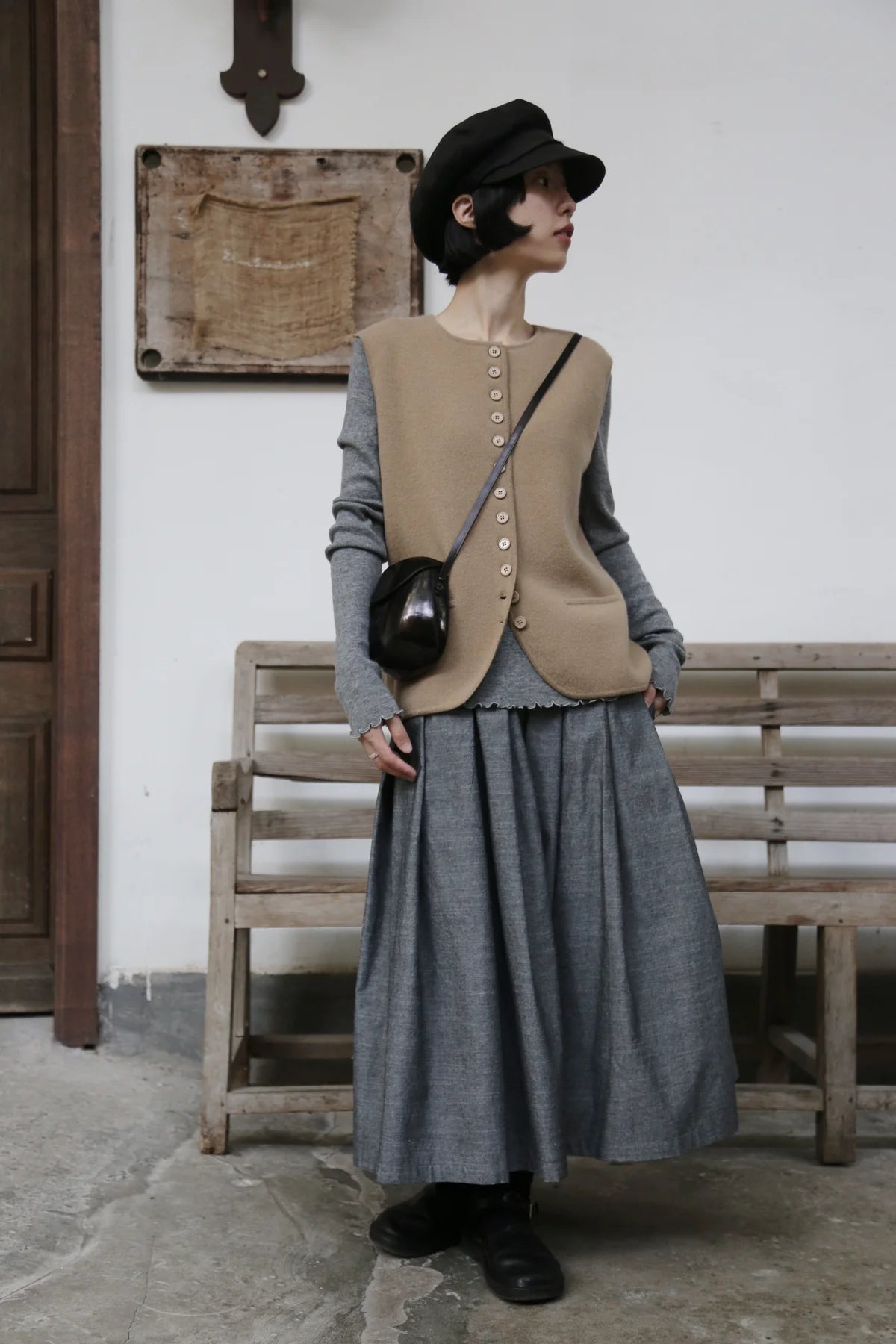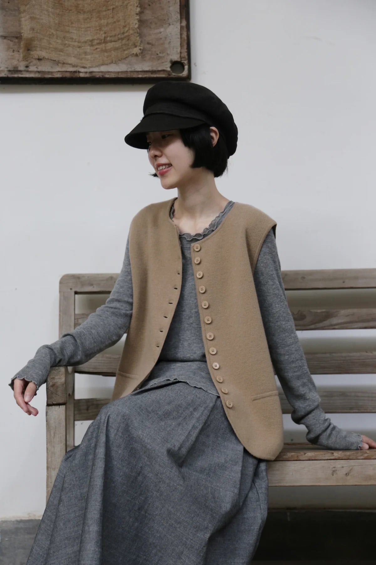 • 12粒揃えた同系色のボタンを留めて着れば、クラシックで落ち着いた雰囲気に