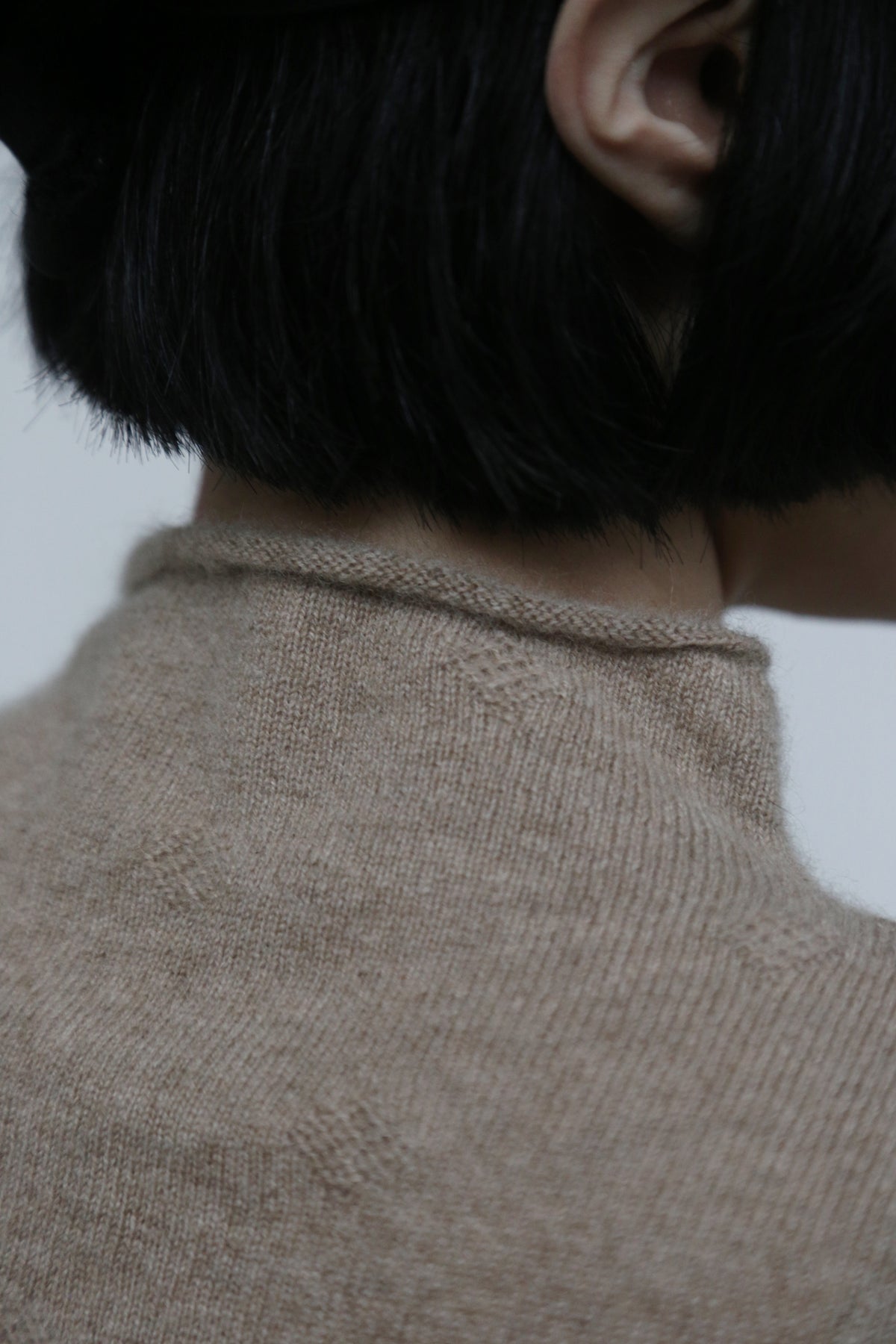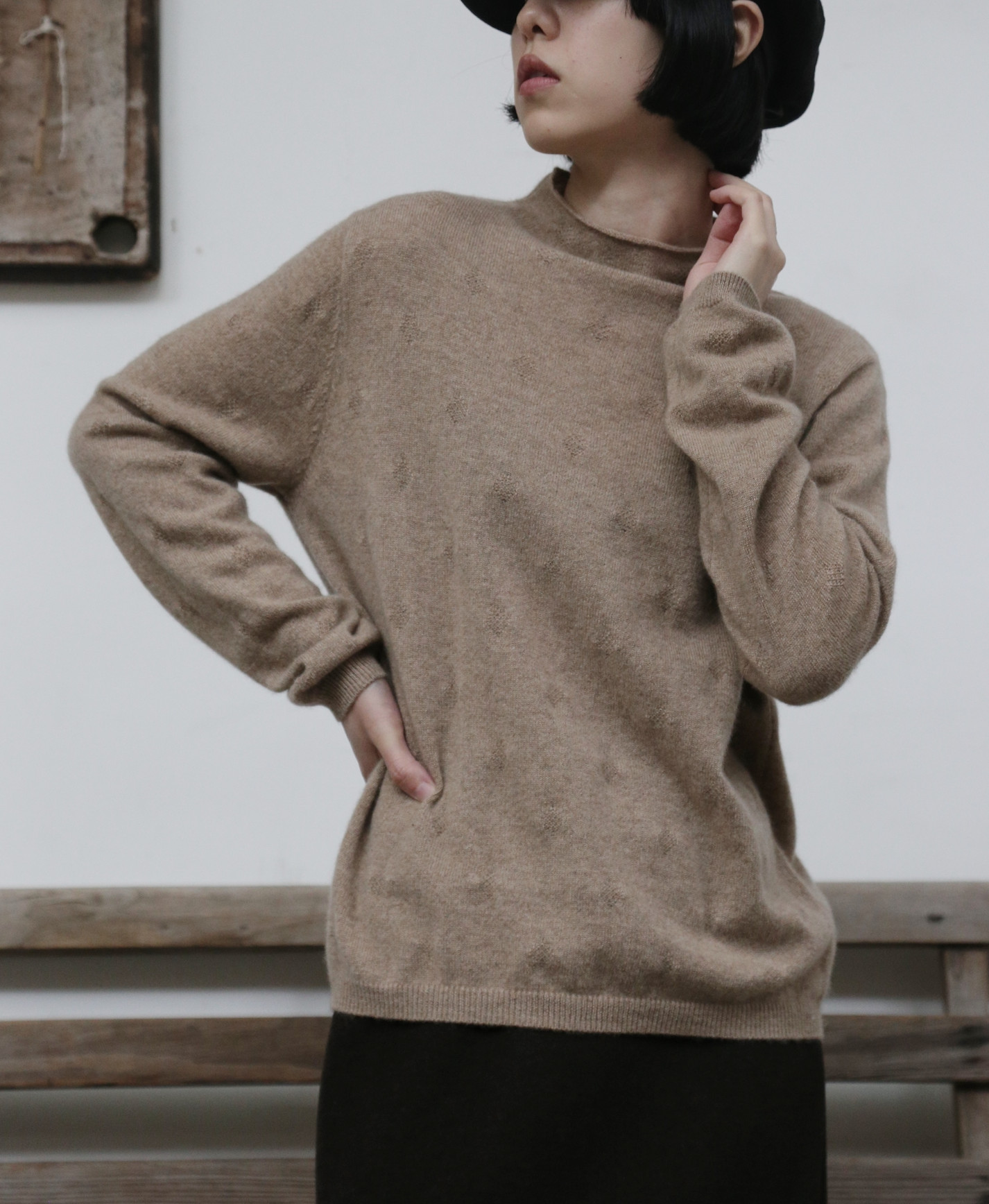 首元をきりりと引き締めながらも、詰まりすぎない程よい高さ。タートルネックが苦手な方でも、すっきりと快適に着こなせます。この愛らしい立体的な首元が、どんなコーディネートにも遊び心とオリジナリティを添えます。