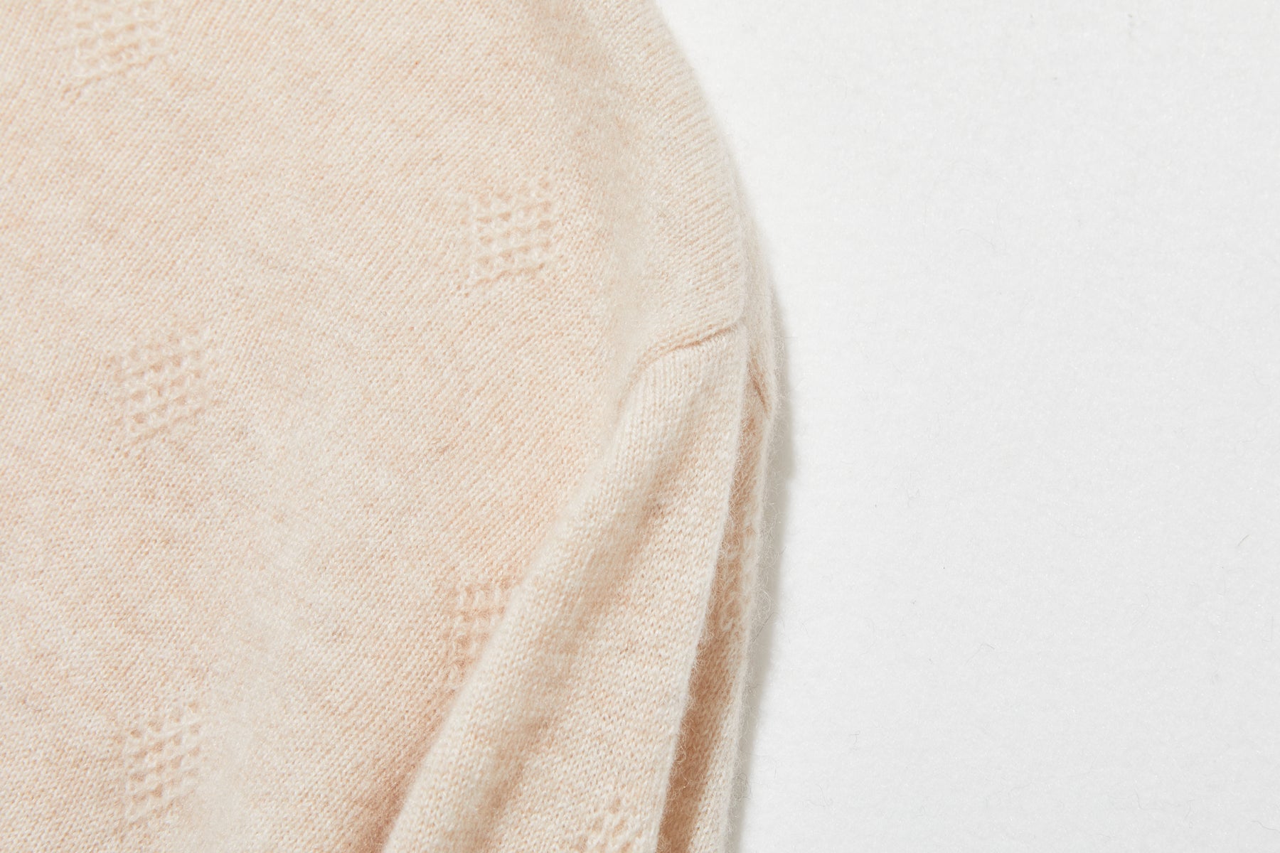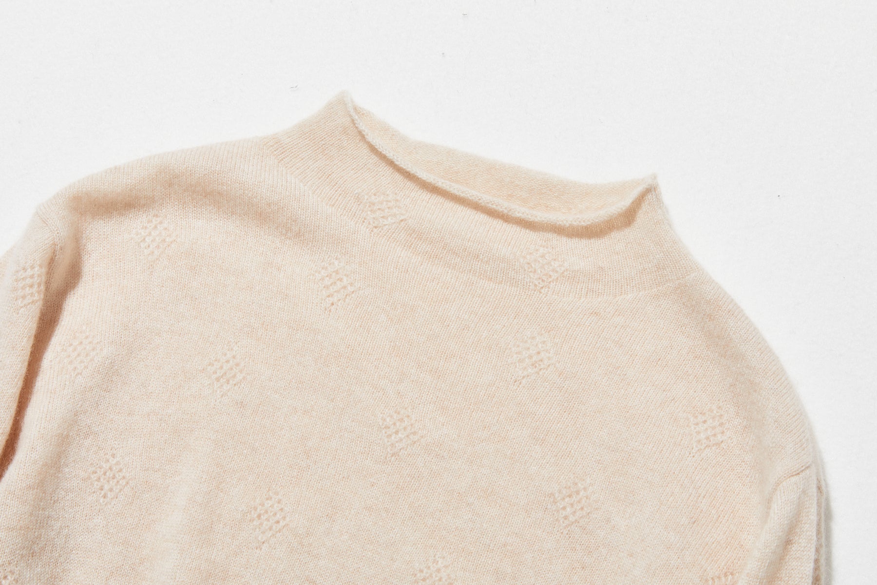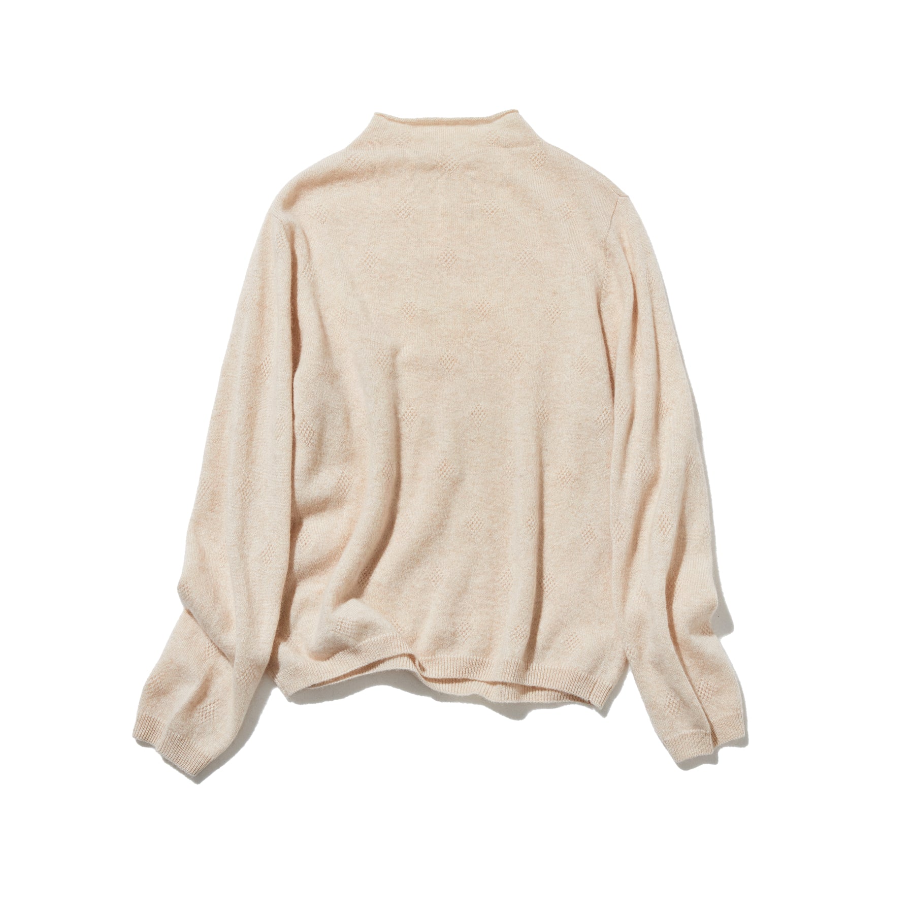 ゆったりとした身幅のシンプルなシルエットに施されたのは、全身に広がる立体的なひし形のジャカード模様です。光の加減で陰影が変化し、無地のカシミヤにはない上品な奥行きと精巧さをプラス。着るだけで自然と立体感が生まれ、洗練された印象を与えます。