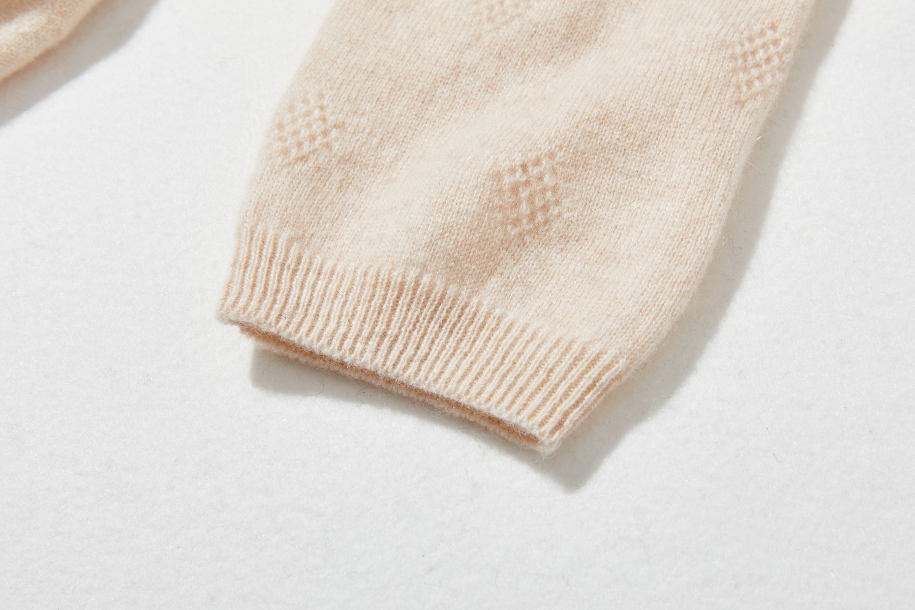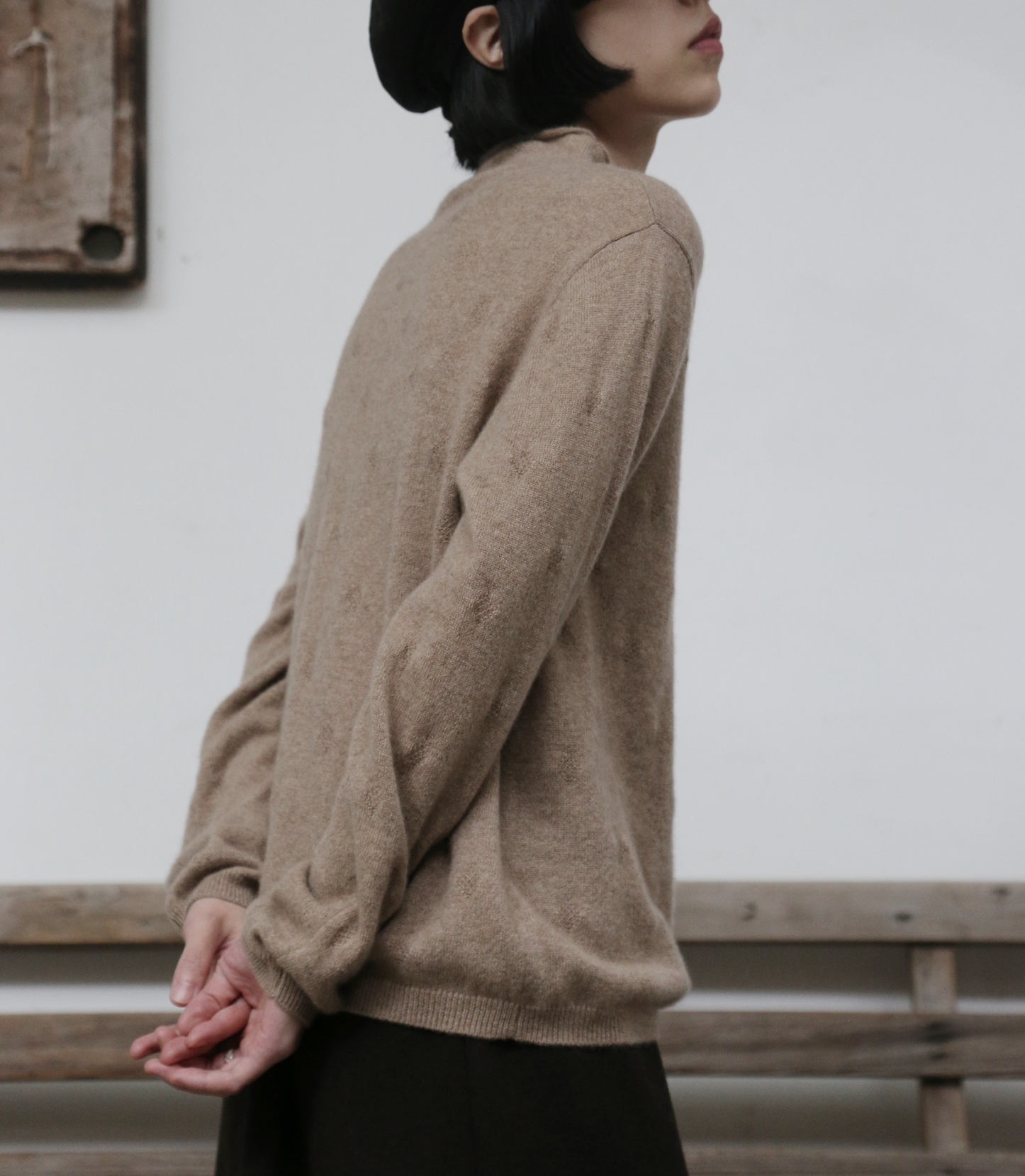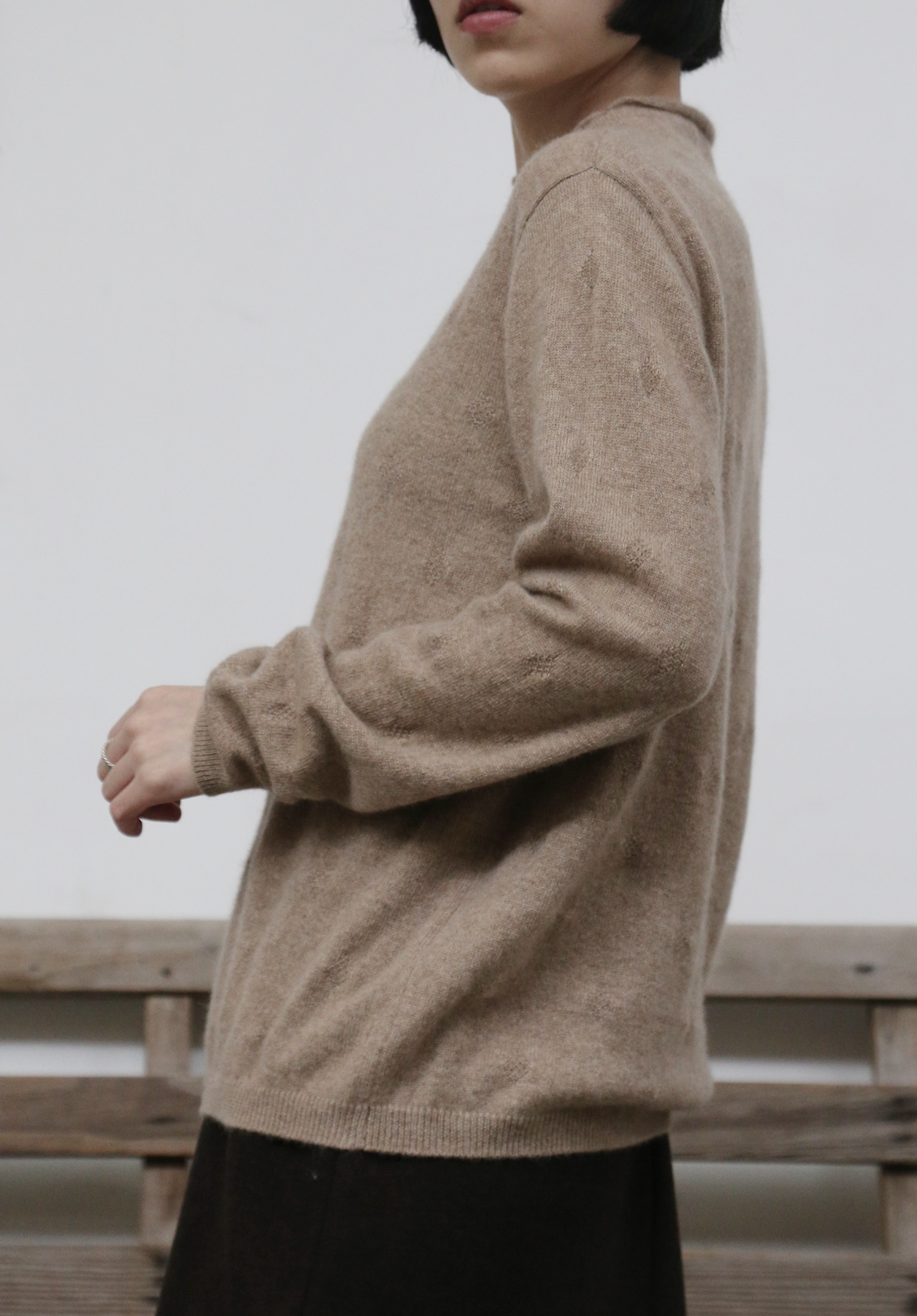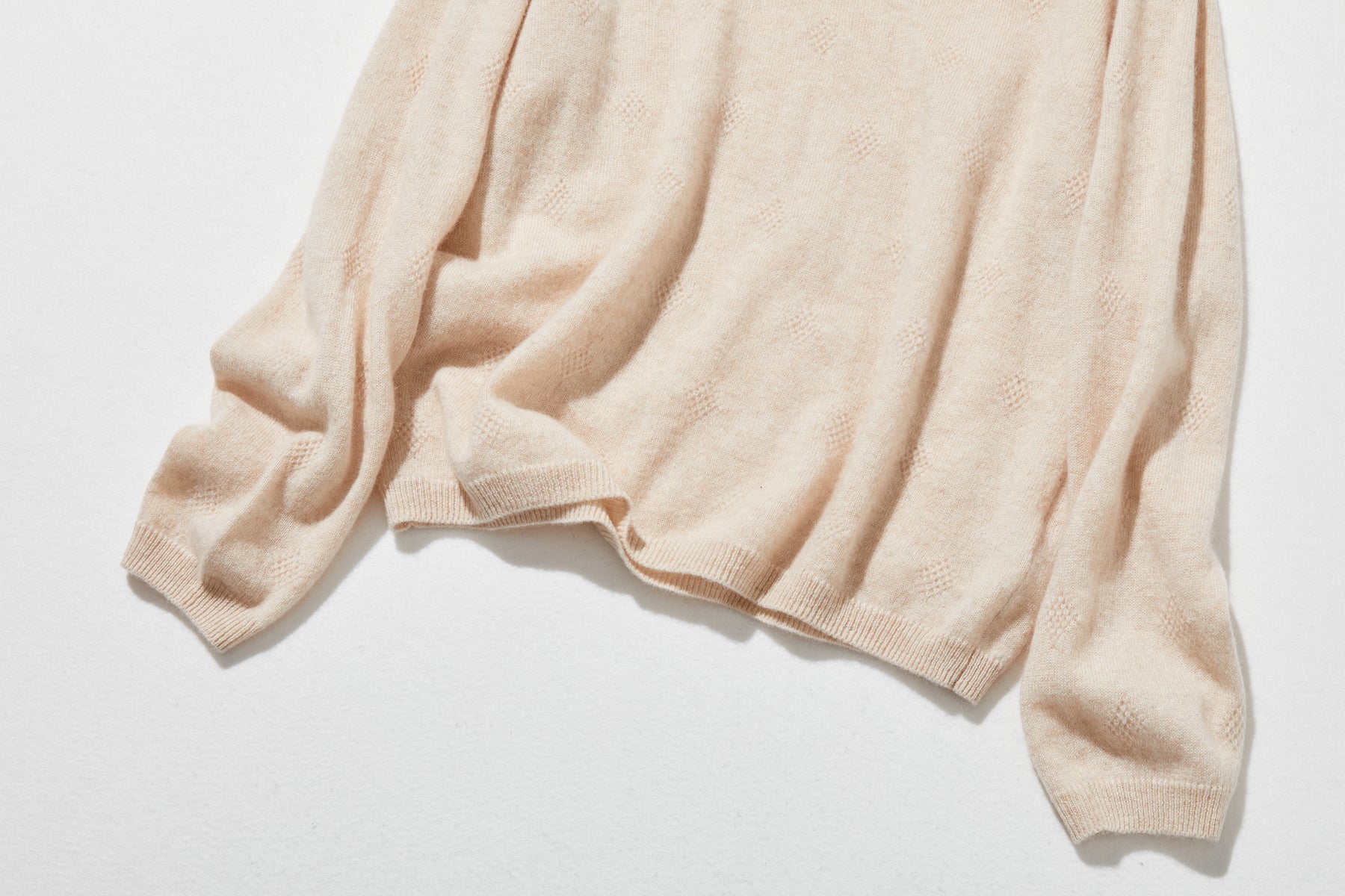 ゆったりとした身幅のシンプルなシルエットに施されたのは、全身に広がる立体的なひし形のジャカード模様です。光の加減で陰影が変化し、無地のカシミヤにはない上品な奥行きと精巧さをプラス。着るだけで自然と立体感が生まれ、洗練された印象を与えます。
