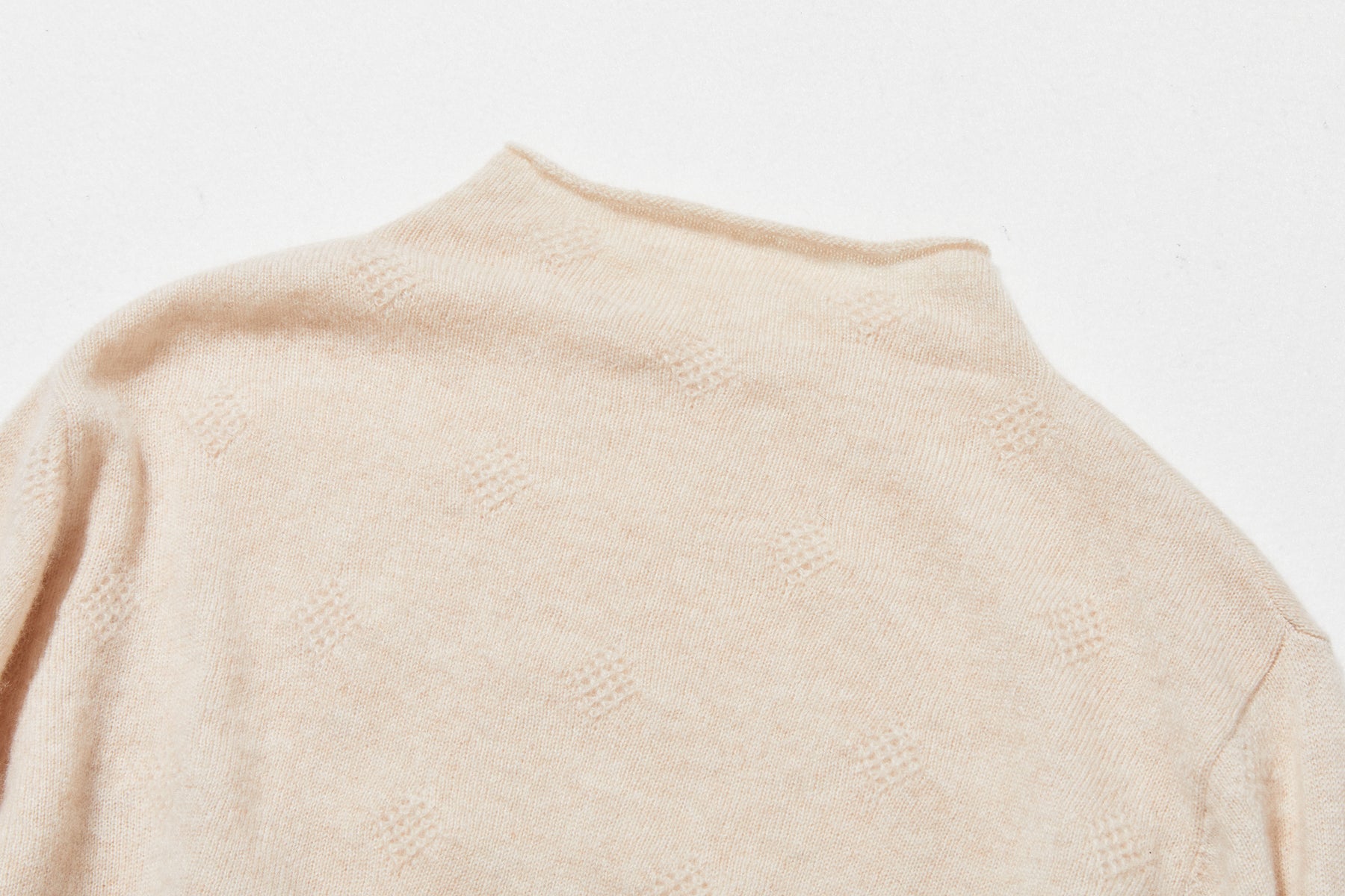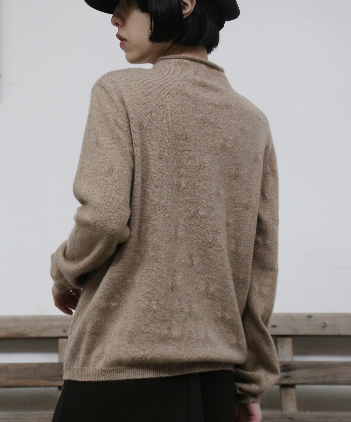 くるんと可愛いボルトネックが遊び心を添える。立体ひし形ジャカードニット カシミヤ100% 251128