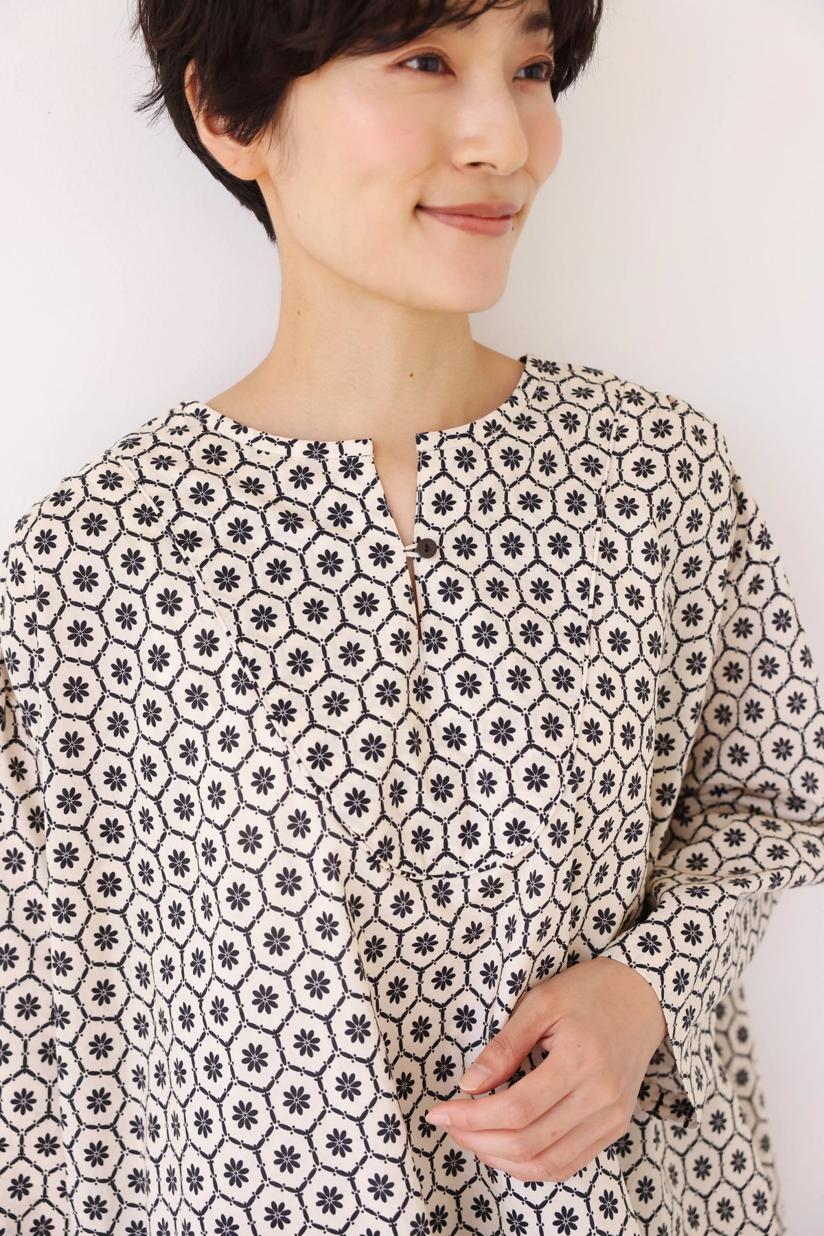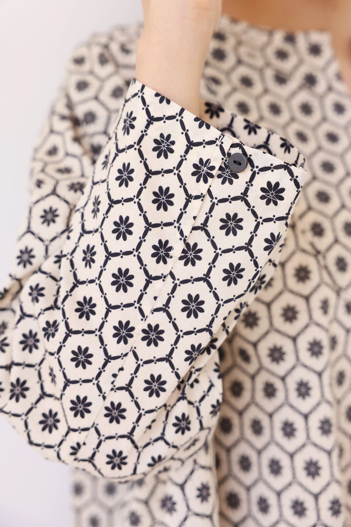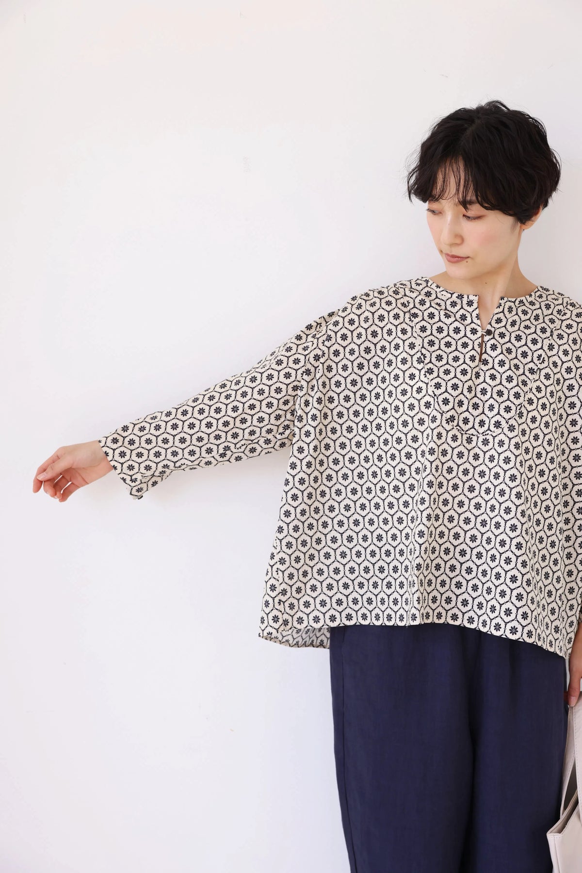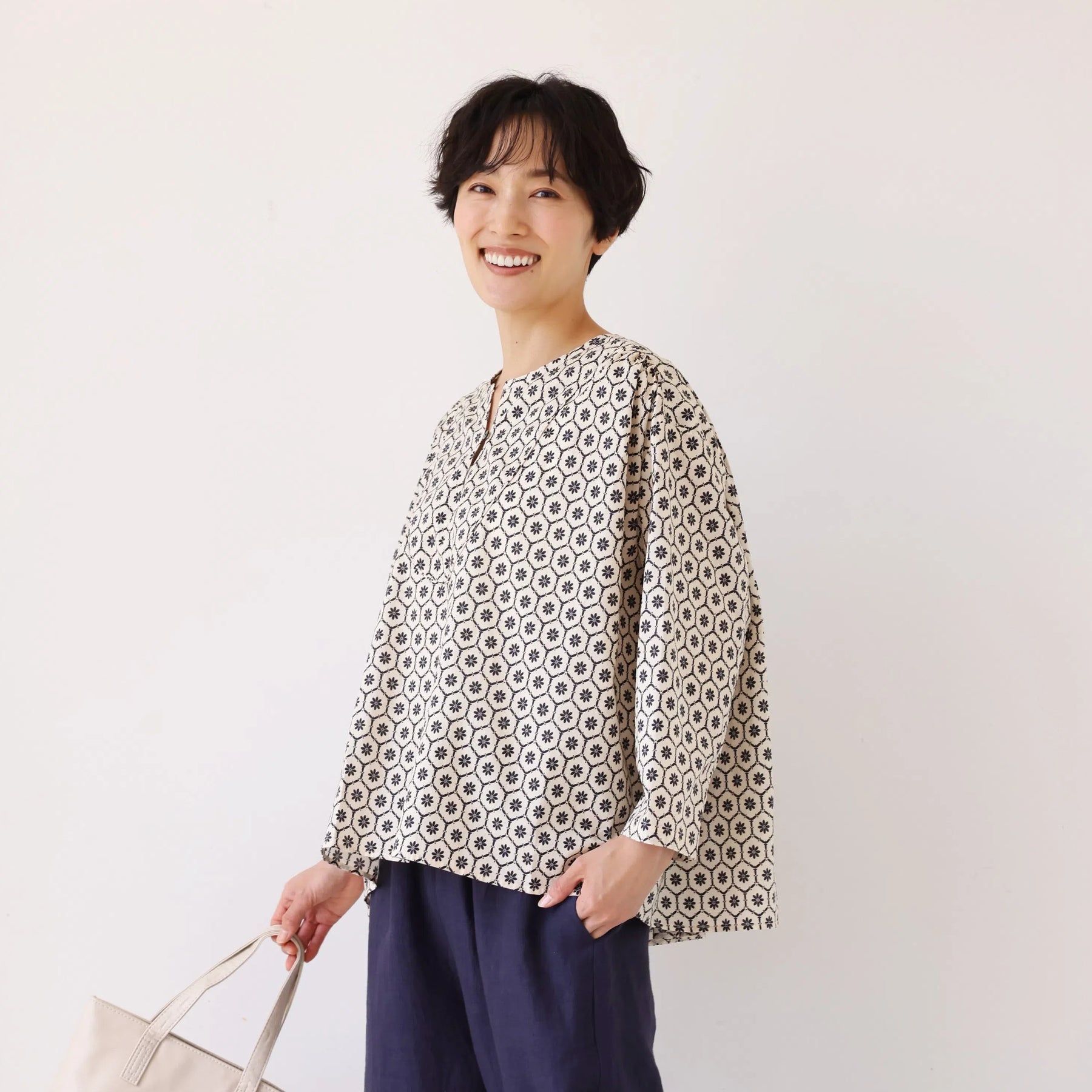 【季節を繋ぐ着こなし】 幾何学模様プリント スキッパーシャツ ブラウス コットン100% 250903-1