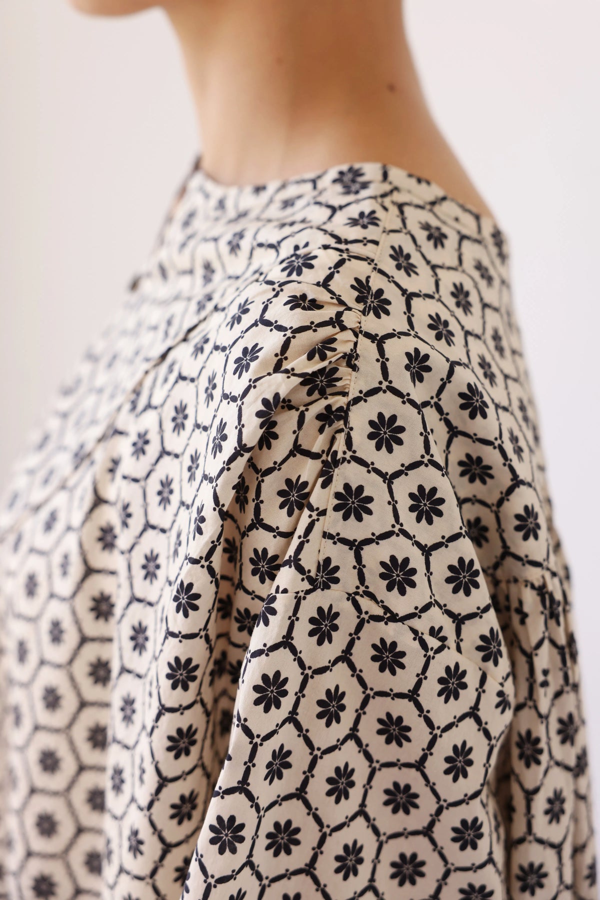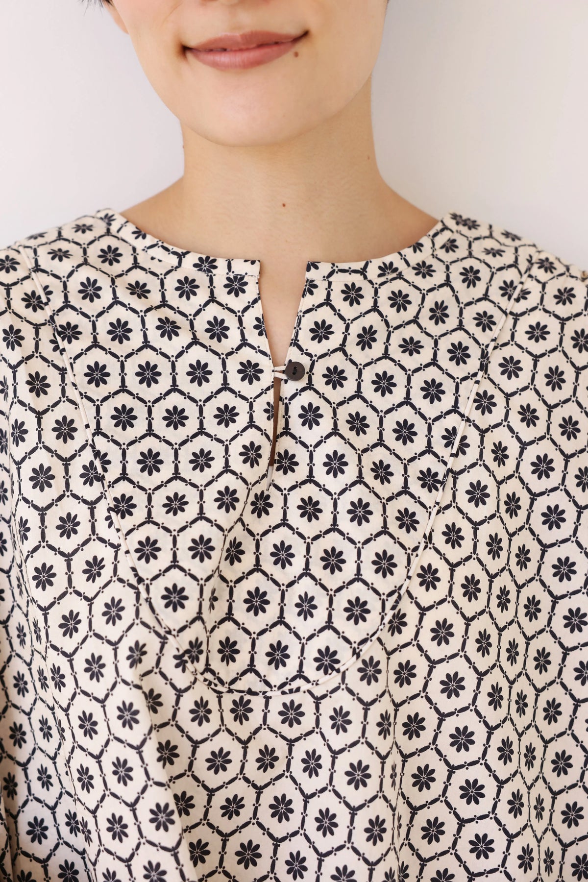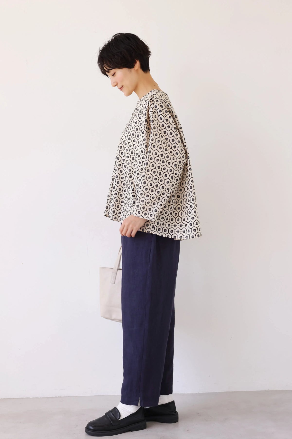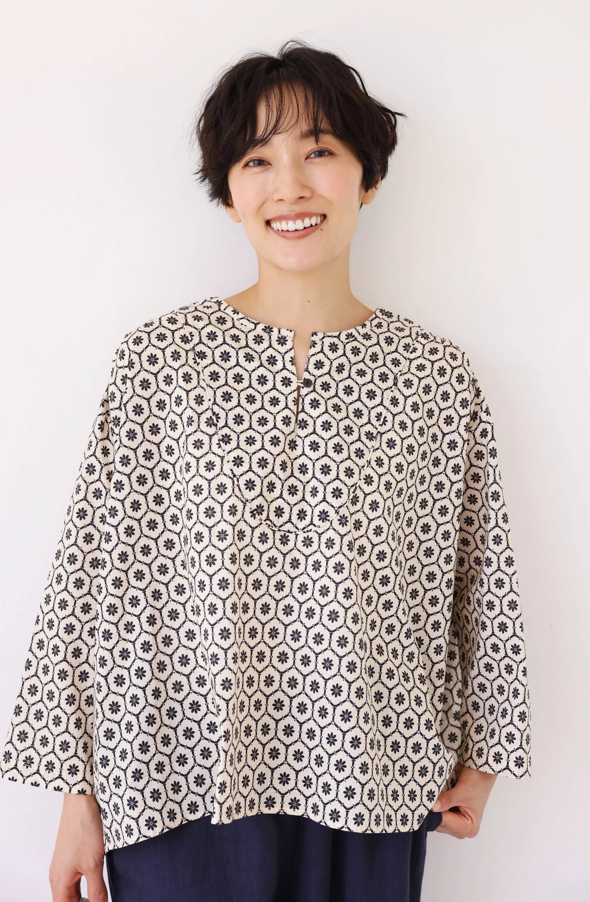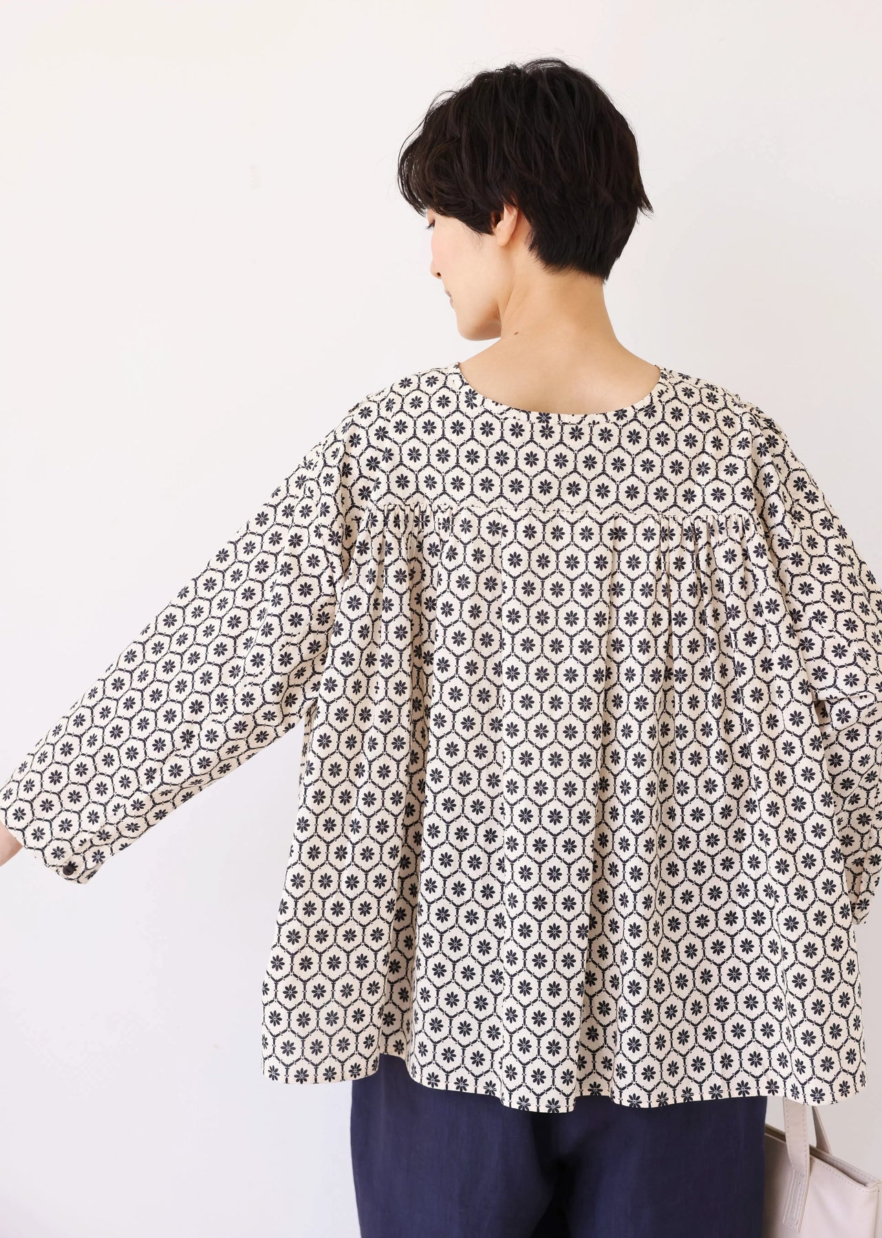 【季節を繋ぐ着こなし】 幾何学模様プリント スキッパーシャツ ブラウス コットン100% 250903-1
