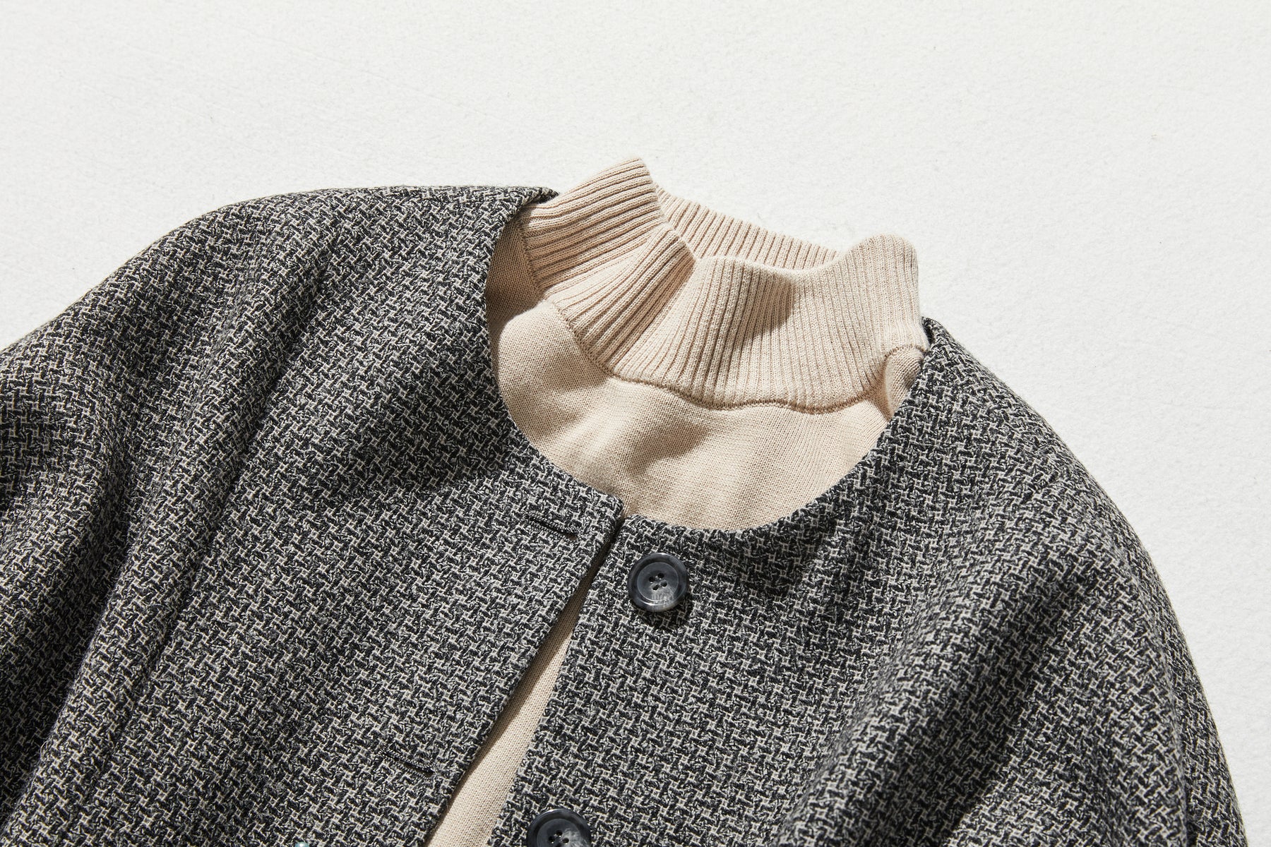 ★襟なしなのでハイネックやマフラーとのコーディネートがきれいに決まります。