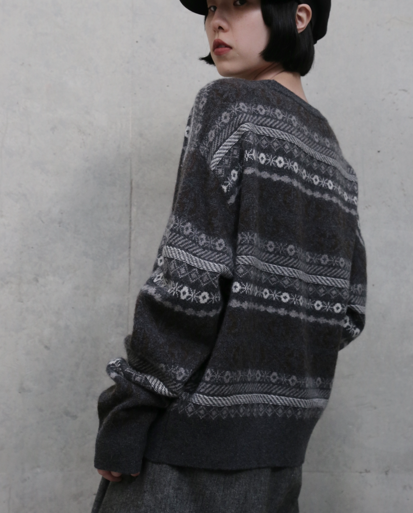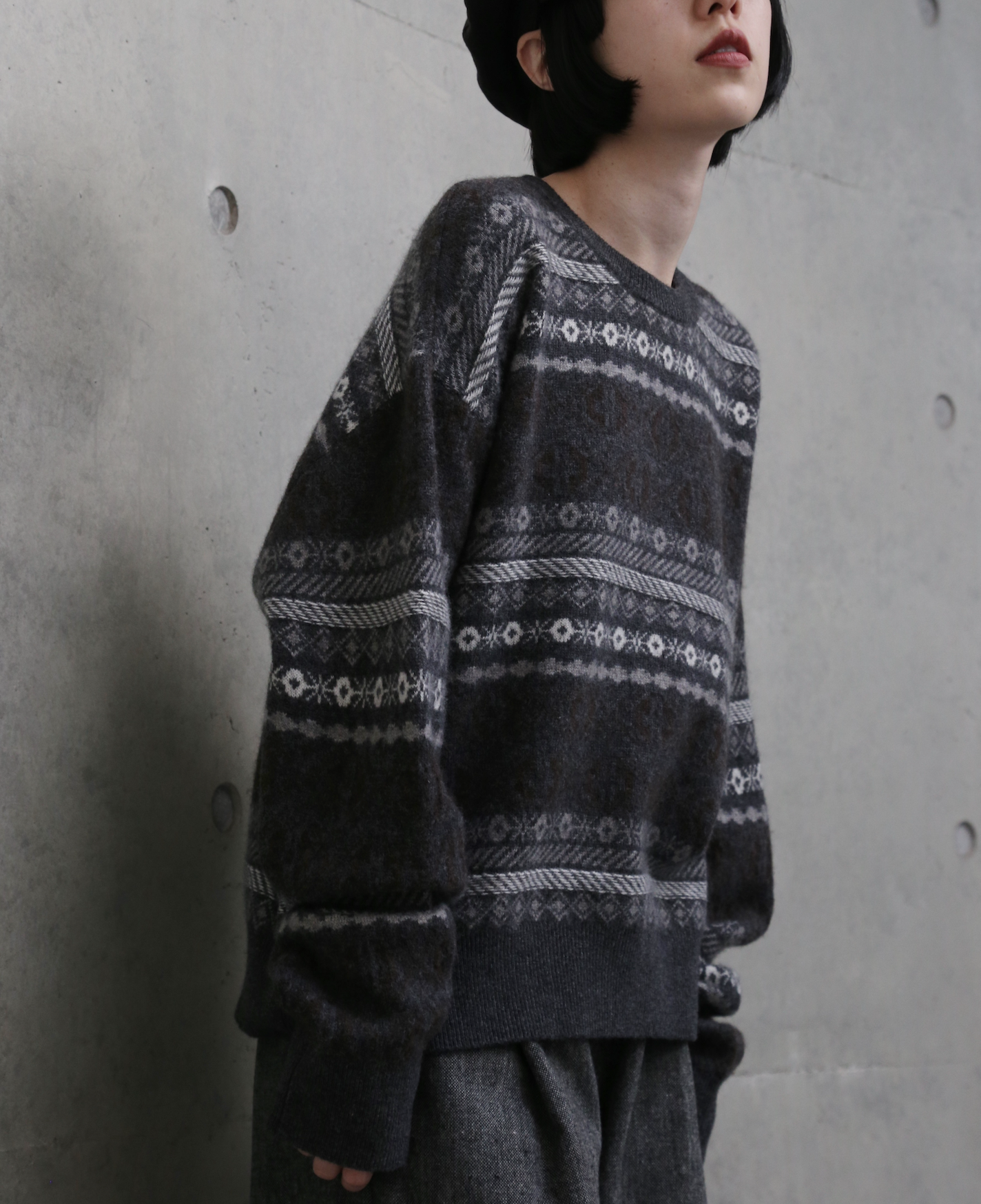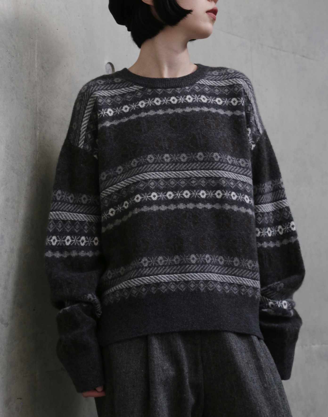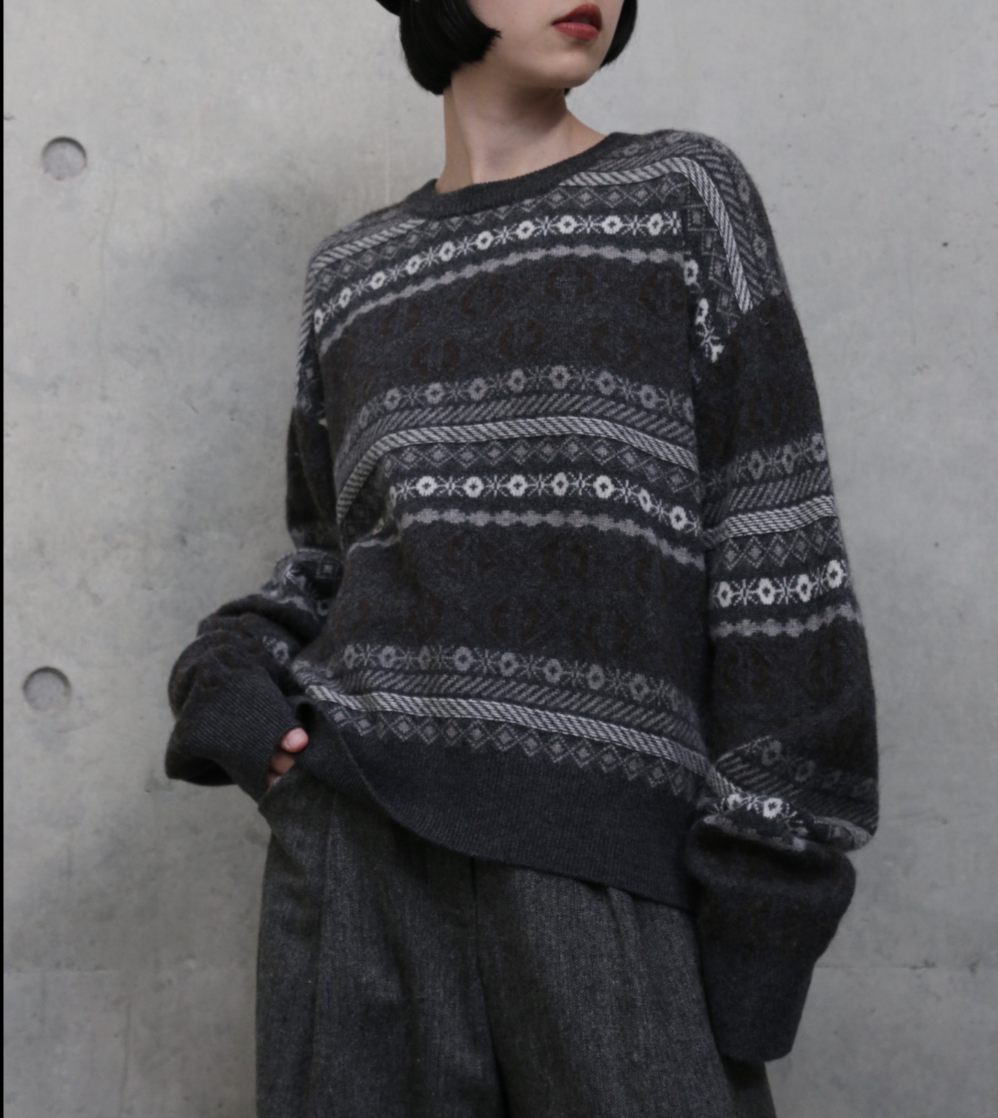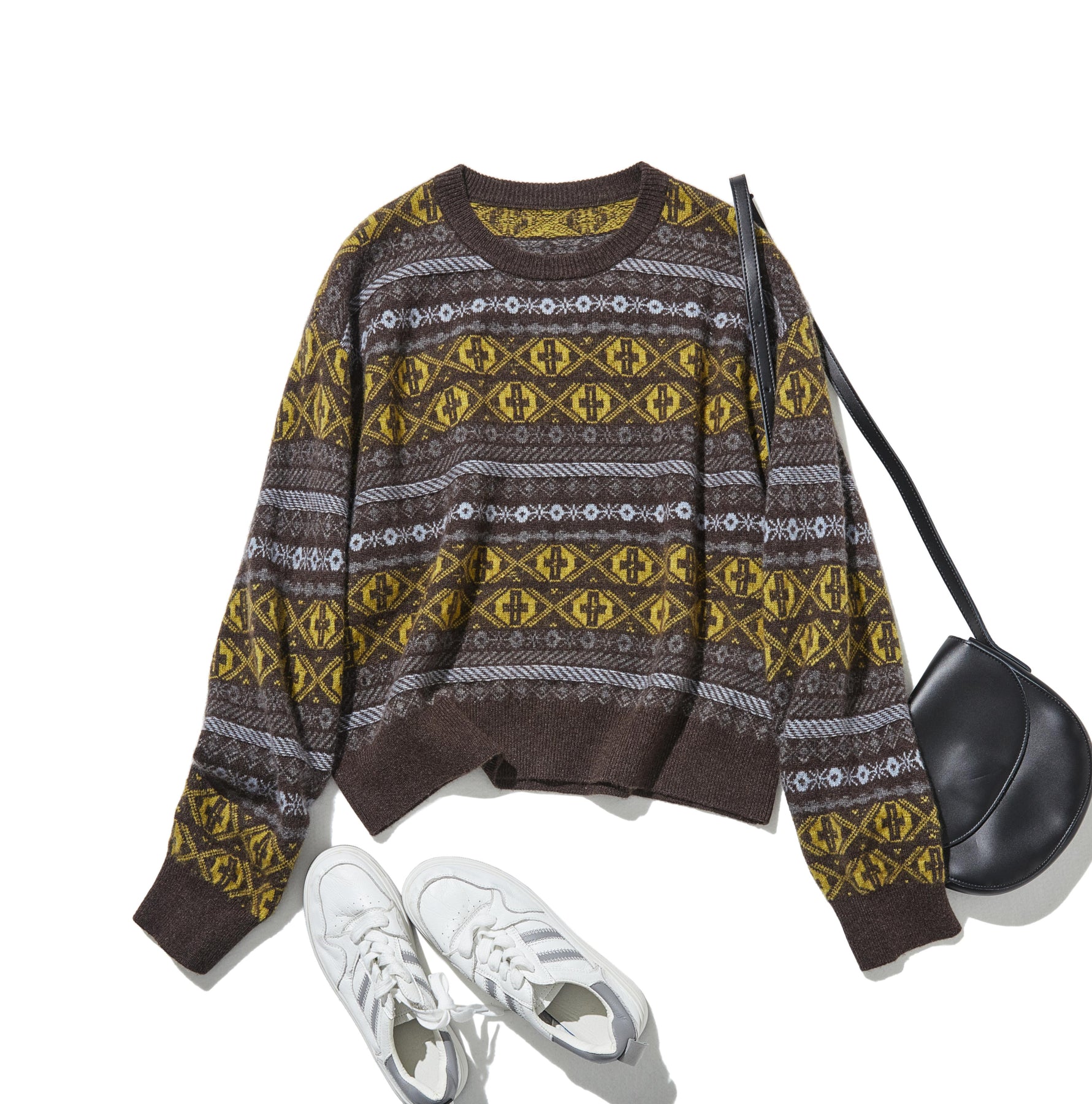 一枚であたたかく、華やか。北欧風ジャガードが彩る、ウールとカシミヤ混紡ニット セーター 251205寒い季節に、あたたかさと上質な「着映え」を一枚で叶えてくれる、特別なニットをご紹介します。クラシックで洗練された北欧風のフェアアイル柄が、日常にほんのりとした華やぎと温もりをプラスします。◆ クラシックで上品な「ジャガード・ボーダー柄」一目を引くのは、色とりどりの糸で織りなされる北欧風のフェアアイルボーダー柄です。一つひとつの配色にこだわり、古風すぎずモダンな印象に仕上げました。シンプルなコーディネートにさりげなく加えれば、それだけで華やかなアクセントに。どこか懐かしく、どこか新しい、特別感のあるデザインです。◆ 着るだけでこなれ感が生まれる、リラックスシルエット肩の力が抜けたこなれた印象を生むのは、ゆったりとしたドロップショルダーデザイン。柔らかな風合いの糸が、ふっくらとした柔らかなボリューム感を作り出し、身体を優しく包み込みます。適度な厚みで保温性も抜群。着込むほどに味わいが増す、愛着のわく一枚です。◆ 着回しを考えた、絶妙なデザインバランスやや短めの丈:ボトムスのウエストラインをすっきり見せ、バランスの良いプロポーションを作ります。重ね着にも対応:シャツの襟元を覗かせたり、スカートの上から着るなど、季節に合わせたレイヤードスタイルも自由自在。◆ スタイリング提案:あなたの「日常」を少し特別にナチュラルで優しい雰囲気にデニムやコーデュロイのパンツ、Aラインのスカートと合わせると、柔らかで親しみやすい日常スタイルが完成。ナチュラルカラーの小物を合わせて、ほっこりとした印象に。こなれたスマートカジュアルにレザースカートやスラックス、ウールのストレートパンツと組み合わせれば、きれいめになりすぎない、洗練された大人のカジュアルスタイルが叶います。少しモードな小物を加えると、さらに印象的です。レイヤードのアクセントにシャツやブラウスの上から着て、襟や袖口を出せば、立体感と彩りが加わり、重ね着の面白さが広がります。アウターの下に着込んでも、首元の華やかさがアクセントになります。素材の柔らかさ、シルエットのこなれ感、そしてどこか懐かしい特別な柄。この冬、あなたの「普段着」に新しい彩りとあたたかさを届ける、頼もしい一枚です。素材:ウール58.5%カシミヤ10.3%ナイロン31.2%サイズ:身丈56cm肩幅55cm袖丈59cmバスト118cm首回り52cm袖口20cm裾92cmモデルさんの身長:155cm透け感:なし裏地:なしポケット:なし伸縮性:あり光沢感:なしシーズン:春、秋、冬