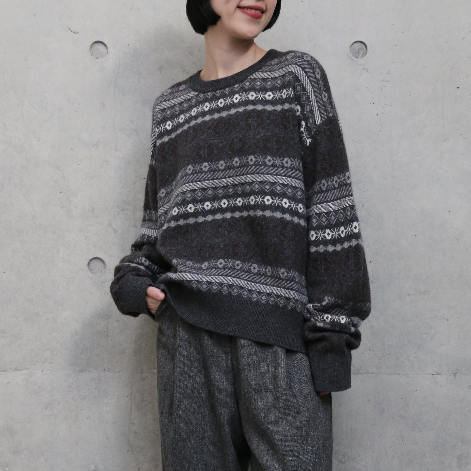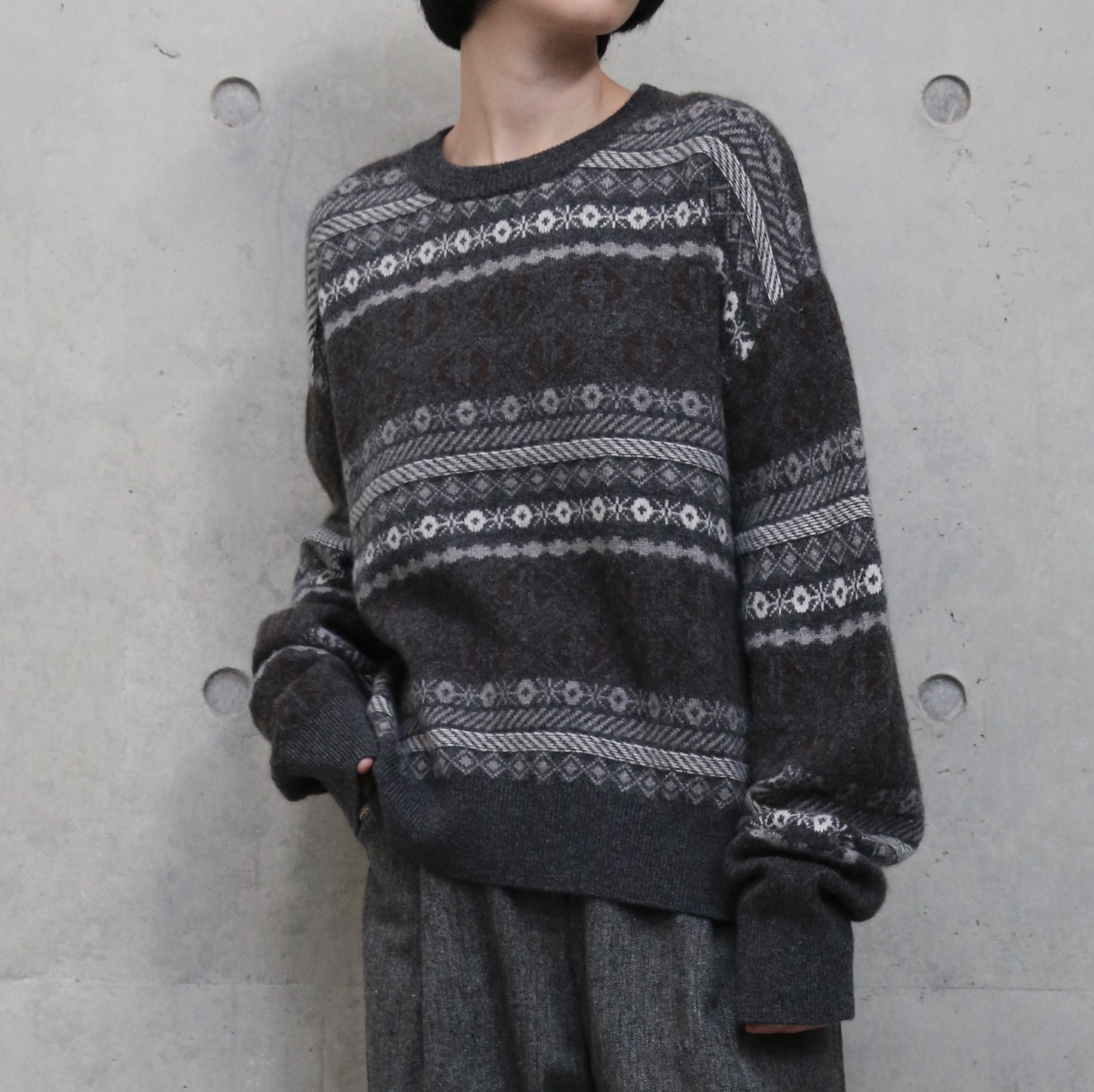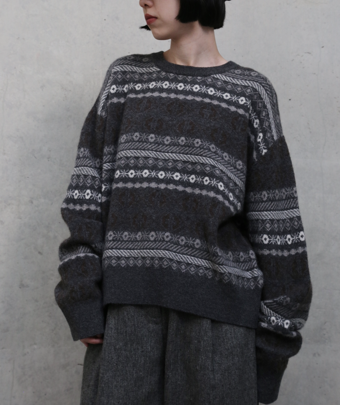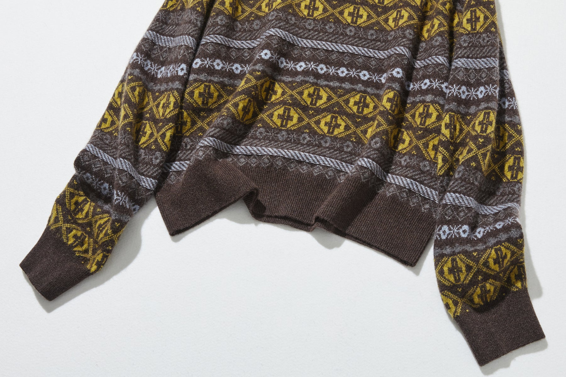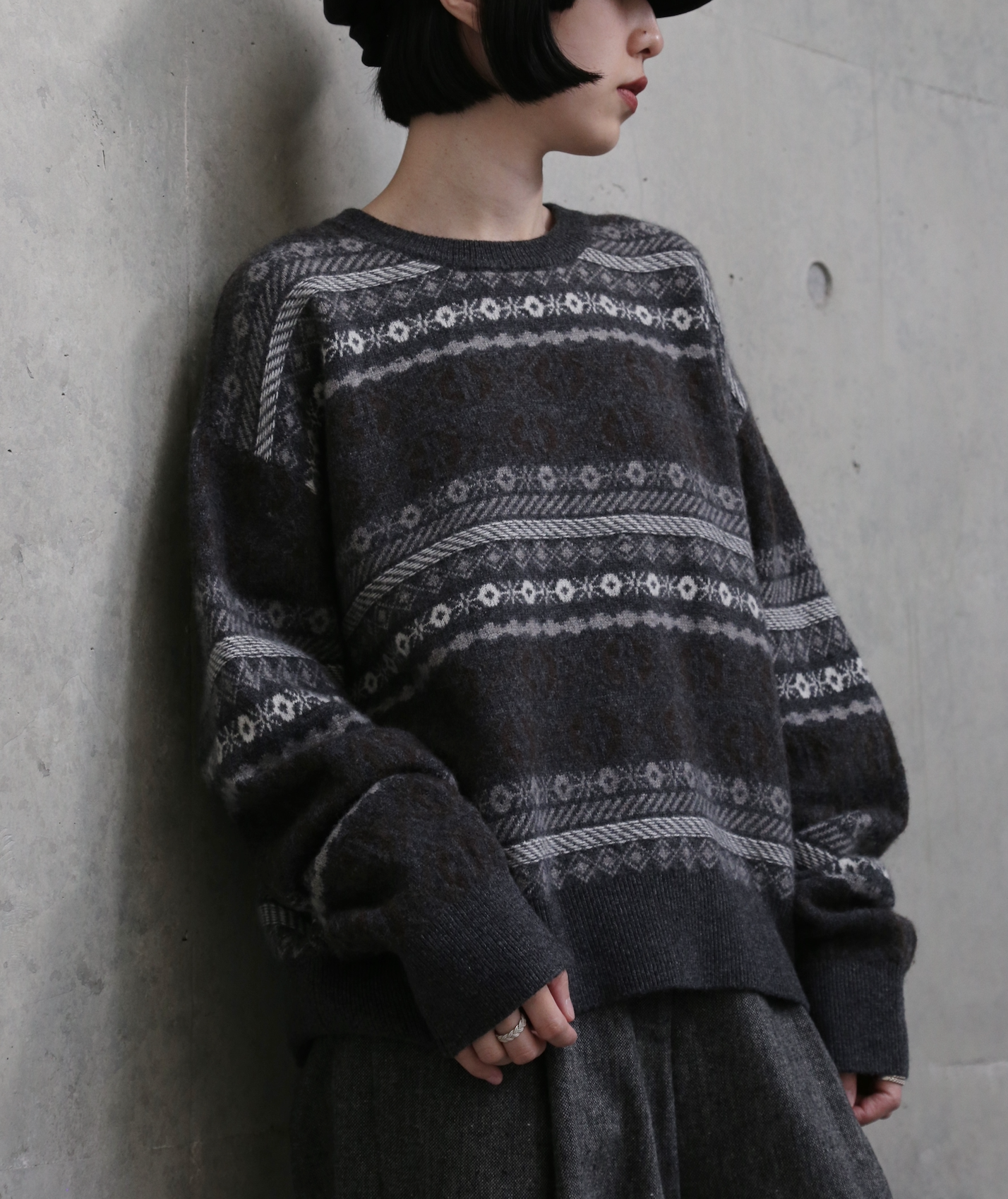一枚であたたかく、華やか。北欧風ジャガードが彩る、ウールとカシミヤ混紡ニット セーター 251205寒い季節に、あたたかさと上質な「着映え」を一枚で叶えてくれる、特別なニットをご紹介します。クラシックで洗練された北欧風のフェアアイル柄が、日常にほんのりとした華やぎと温もりをプラスします。◆ クラシックで上品な「ジャガード・ボーダー柄」一目を引くのは、色とりどりの糸で織りなされる北欧風のフェアアイルボーダー柄です。一つひとつの配色にこだわり、古風すぎずモダンな印象に仕上げました。シンプルなコーディネートにさりげなく加えれば、それだけで華やかなアクセントに。どこか懐かしく、どこか新しい、特別感のあるデザインです。◆ 着るだけでこなれ感が生まれる、リラックスシルエット肩の力が抜けたこなれた印象を生むのは、ゆったりとしたドロップショルダーデザイン。柔らかな風合いの糸が、ふっくらとした柔らかなボリューム感を作り出し、身体を優しく包み込みます。適度な厚みで保温性も抜群。着込むほどに味わいが増す、愛着のわく一枚です。◆ 着回しを考えた、絶妙なデザインバランスやや短めの丈:ボトムスのウエストラインをすっきり見せ、バランスの良いプロポーションを作ります。重ね着にも対応:シャツの襟元を覗かせたり、スカートの上から着るなど、季節に合わせたレイヤードスタイルも自由自在。◆ スタイリング提案:あなたの「日常」を少し特別にナチュラルで優しい雰囲気にデニムやコーデュロイのパンツ、Aラインのスカートと合わせると、柔らかで親しみやすい日常スタイルが完成。ナチュラルカラーの小物を合わせて、ほっこりとした印象に。こなれたスマートカジュアルにレザースカートやスラックス、ウールのストレートパンツと組み合わせれば、きれいめになりすぎない、洗練された大人のカジュアルスタイルが叶います。少しモードな小物を加えると、さらに印象的です。レイヤードのアクセントにシャツやブラウスの上から着て、襟や袖口を出せば、立体感と彩りが加わり、重ね着の面白さが広がります。アウターの下に着込んでも、首元の華やかさがアクセントになります。素材の柔らかさ、シルエットのこなれ感、そしてどこか懐かしい特別な柄。この冬、あなたの「普段着」に新しい彩りとあたたかさを届ける、頼もしい一枚です。素材:ウール58.5%カシミヤ10.3%ナイロン31.2%サイズ:身丈56cm肩幅55cm袖丈59cmバスト118cm首回り52cm袖口20cm裾92cmモデルさんの身長:155cm透け感:なし裏地:なしポケット:なし伸縮性:あり光沢感:なしシーズン:春、秋、冬