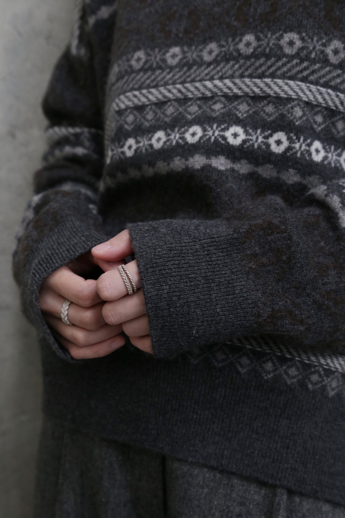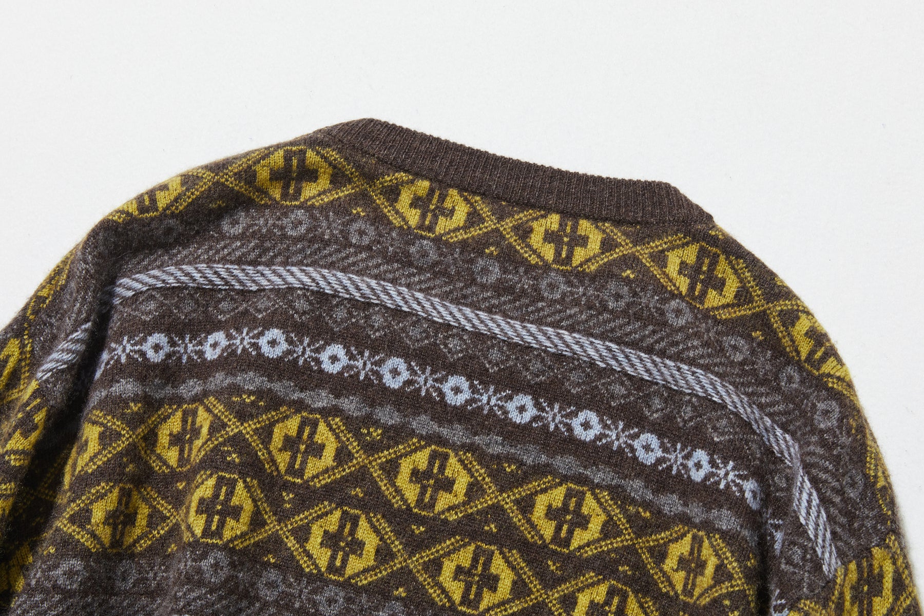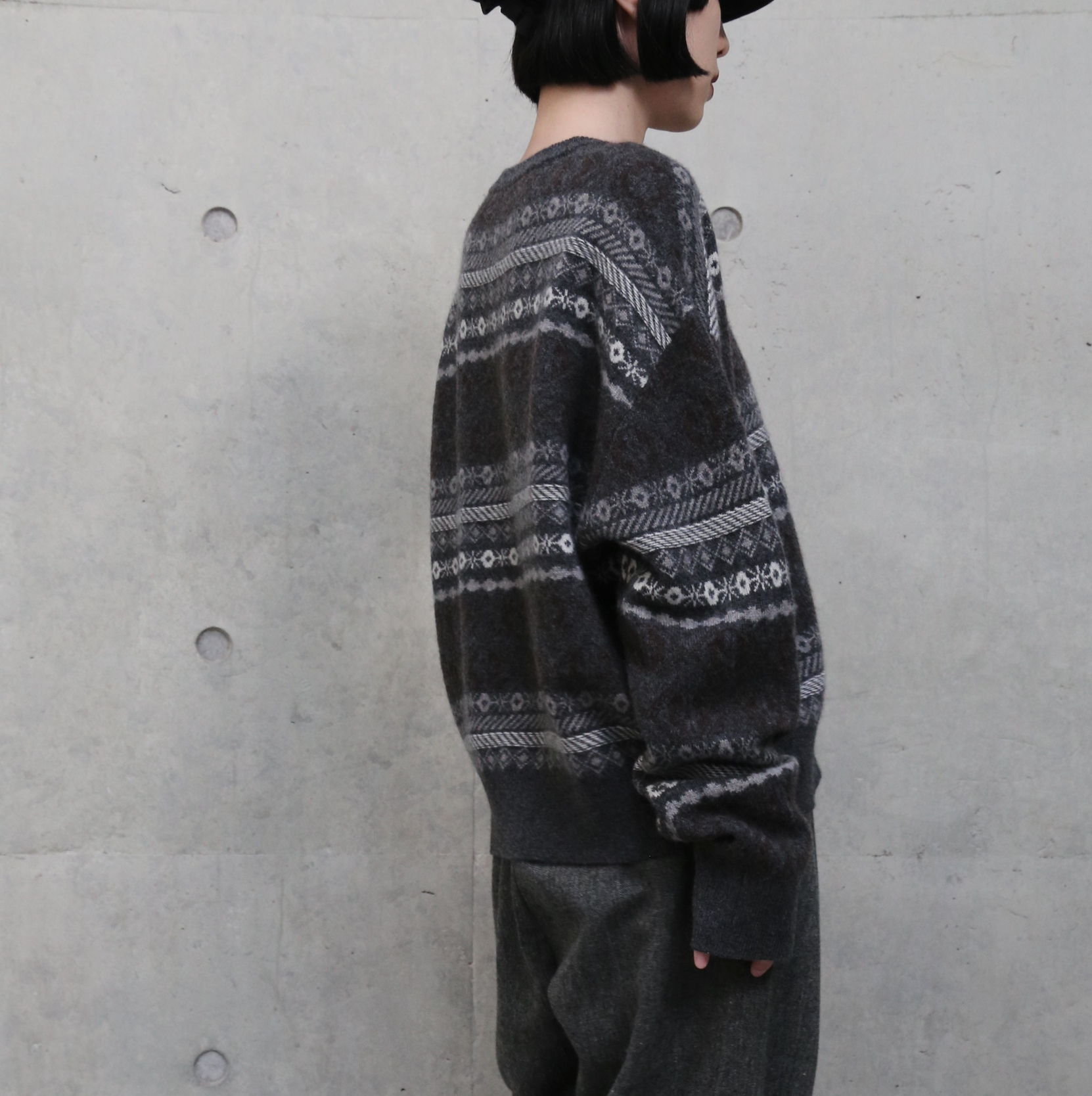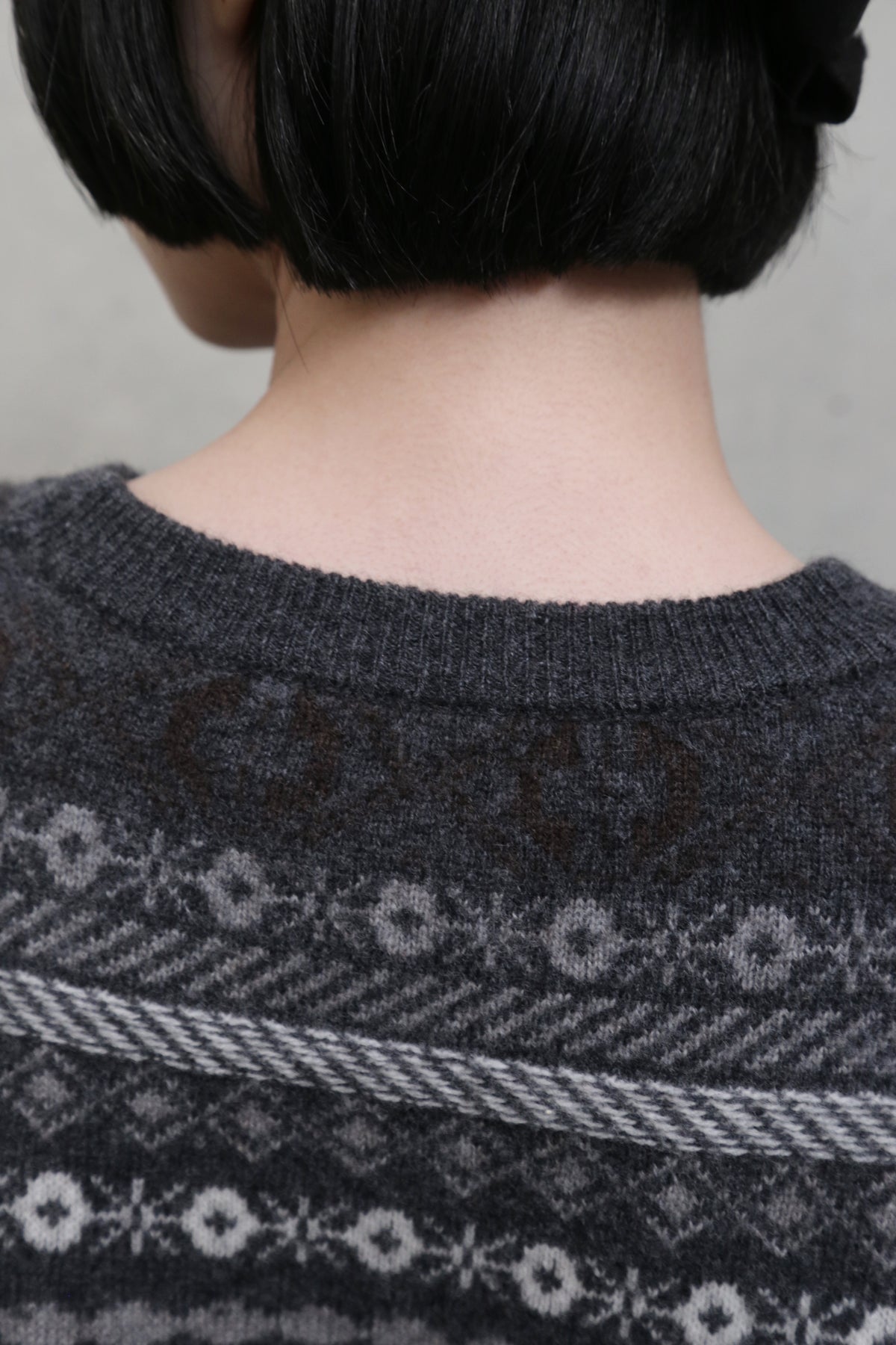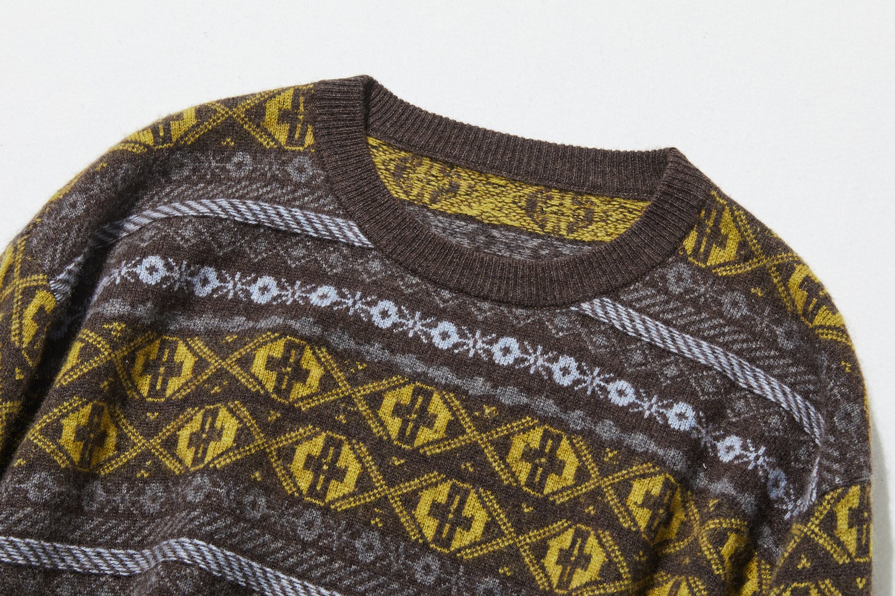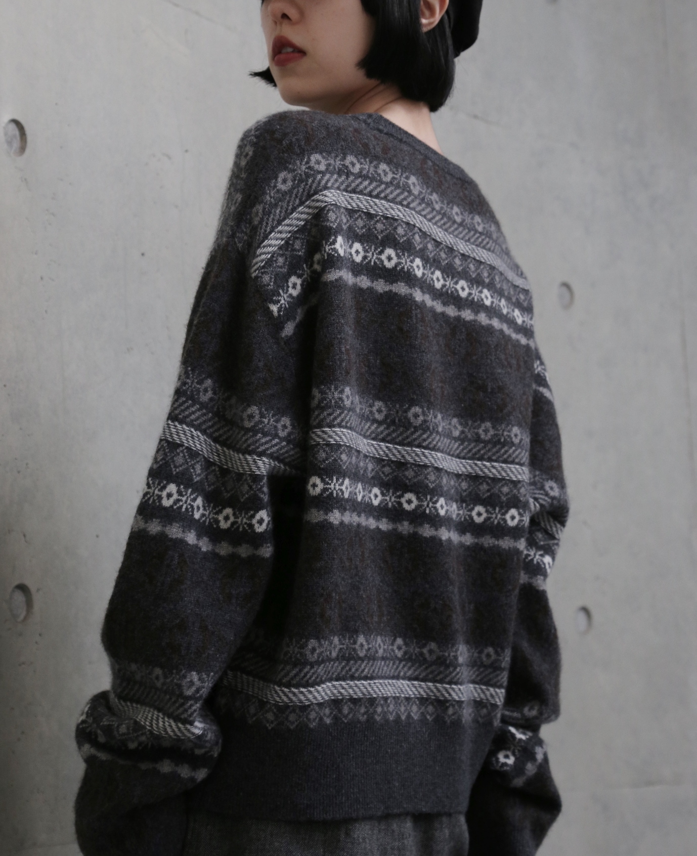一枚であたたかく、華やか。北欧風ジャガードが彩る、ウールとカシミヤ混紡ニット セーター 251205寒い季節に、あたたかさと上質な「着映え」を一枚で叶えてくれる、特別なニットをご紹介します。クラシックで洗練された北欧風のフェアアイル柄が、日常にほんのりとした華やぎと温もりをプラスします。◆ クラシックで上品な「ジャガード・ボーダー柄」一目を引くのは、色とりどりの糸で織りなされる北欧風のフェアアイルボーダー柄です。一つひとつの配色にこだわり、古風すぎずモダンな印象に仕上げました。シンプルなコーディネートにさりげなく加えれば、それだけで華やかなアクセントに。どこか懐かしく、どこか新しい、特別感のあるデザインです。◆ 着るだけでこなれ感が生まれる、リラックスシルエット肩の力が抜けたこなれた印象を生むのは、ゆったりとしたドロップショルダーデザイン。柔らかな風合いの糸が、ふっくらとした柔らかなボリューム感を作り出し、身体を優しく包み込みます。適度な厚みで保温性も抜群。着込むほどに味わいが増す、愛着のわく一枚です。◆ 着回しを考えた、絶妙なデザインバランスやや短めの丈:ボトムスのウエストラインをすっきり見せ、バランスの良いプロポーションを作ります。重ね着にも対応:シャツの襟元を覗かせたり、スカートの上から着るなど、季節に合わせたレイヤードスタイルも自由自在。◆ スタイリング提案:あなたの「日常」を少し特別にナチュラルで優しい雰囲気にデニムやコーデュロイのパンツ、Aラインのスカートと合わせると、柔らかで親しみやすい日常スタイルが完成。ナチュラルカラーの小物を合わせて、ほっこりとした印象に。こなれたスマートカジュアルにレザースカートやスラックス、ウールのストレートパンツと組み合わせれば、きれいめになりすぎない、洗練された大人のカジュアルスタイルが叶います。少しモードな小物を加えると、さらに印象的です。レイヤードのアクセントにシャツやブラウスの上から着て、襟や袖口を出せば、立体感と彩りが加わり、重ね着の面白さが広がります。アウターの下に着込んでも、首元の華やかさがアクセントになります。素材の柔らかさ、シルエットのこなれ感、そしてどこか懐かしい特別な柄。この冬、あなたの「普段着」に新しい彩りとあたたかさを届ける、頼もしい一枚です。素材:ウール58.5%カシミヤ10.3%ナイロン31.2%サイズ:身丈56cm肩幅55cm袖丈59cmバスト118cm首回り52cm袖口20cm裾92cmモデルさんの身長:155cm透け感:なし裏地:なしポケット:なし伸縮性:あり光沢感:なしシーズン:春、秋、冬