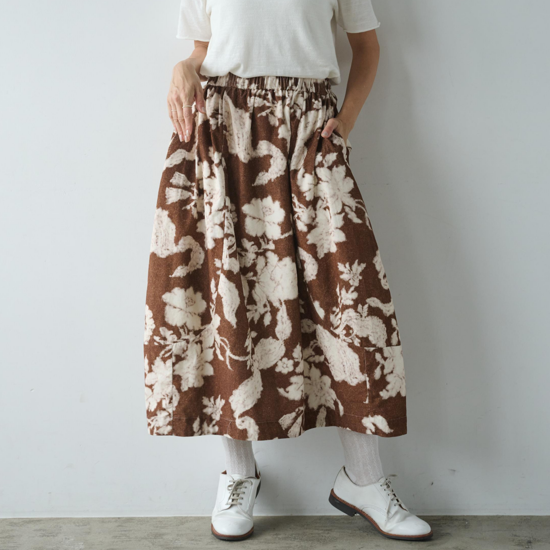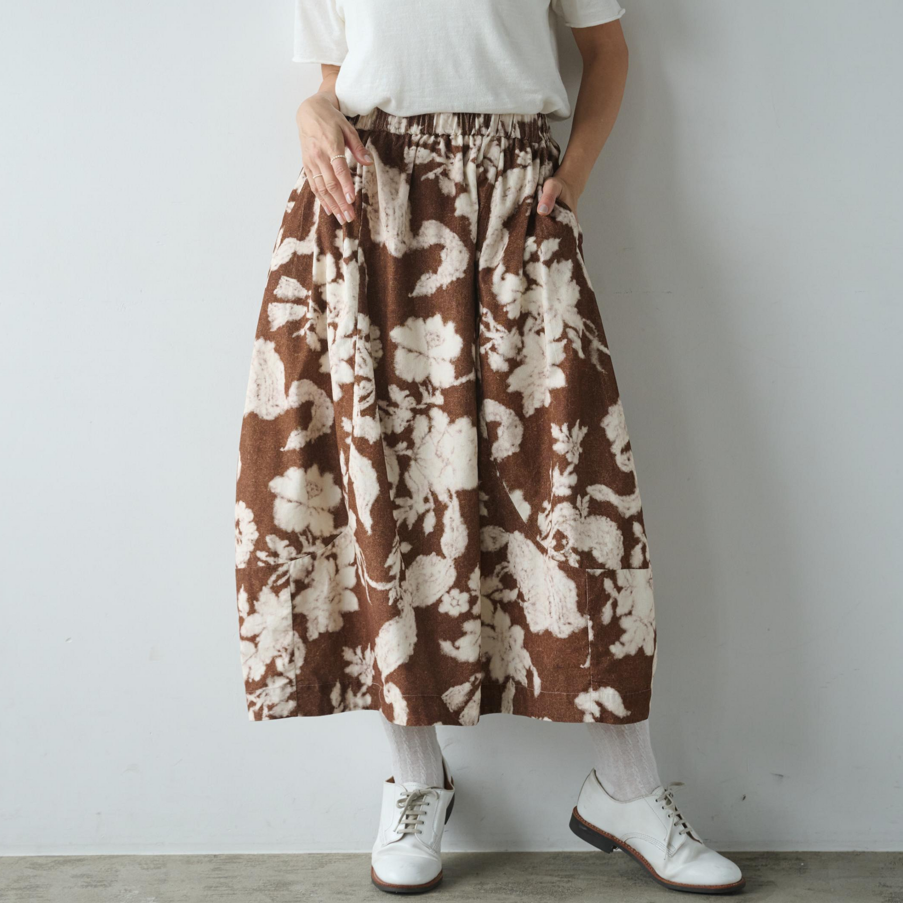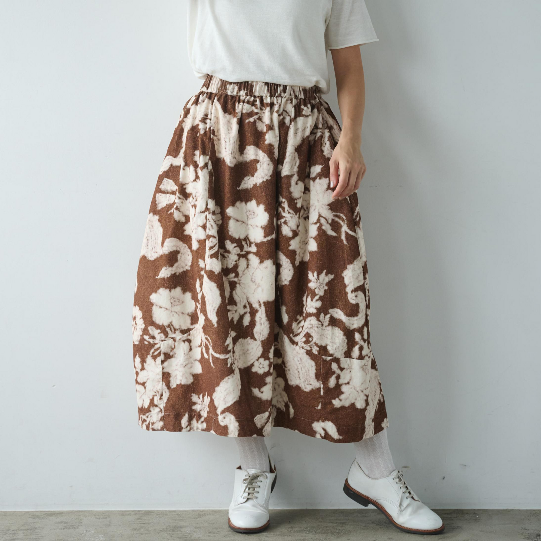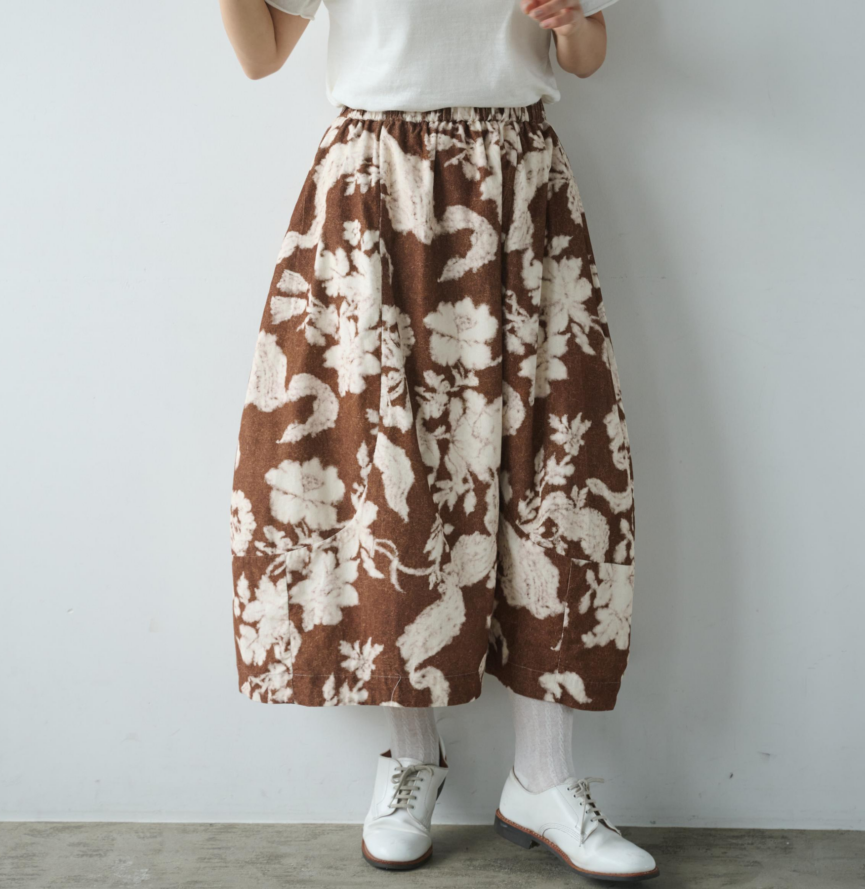 一段切り替えを入れて、ふんわりボリュームを出した贅沢なシルエットが魅力です。ウエストはゴム仕様で、ストレスフリーな穿き心地を実現します。