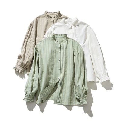 棉麻條紋手工隨機針褶襯衫 230913-1
