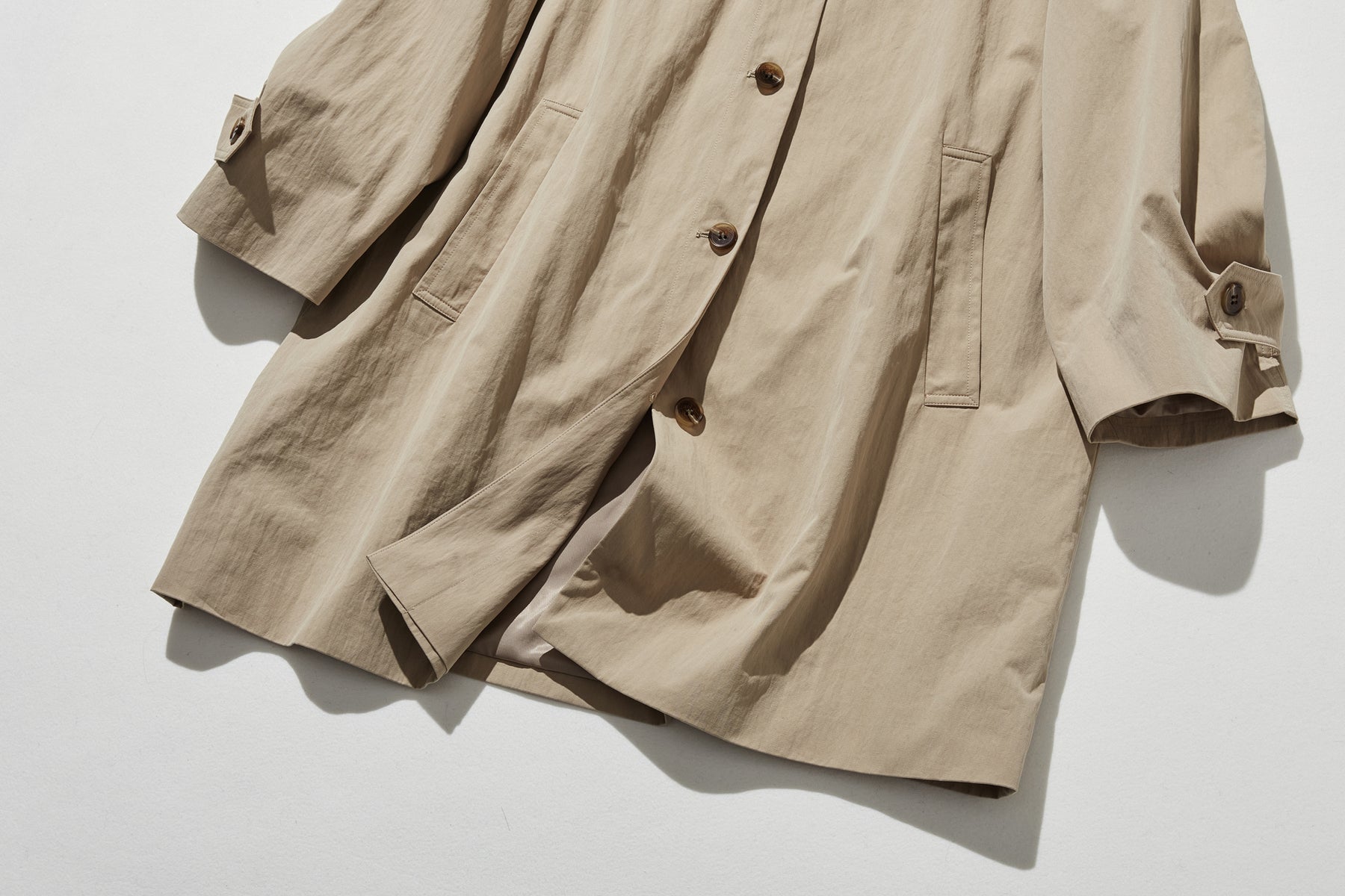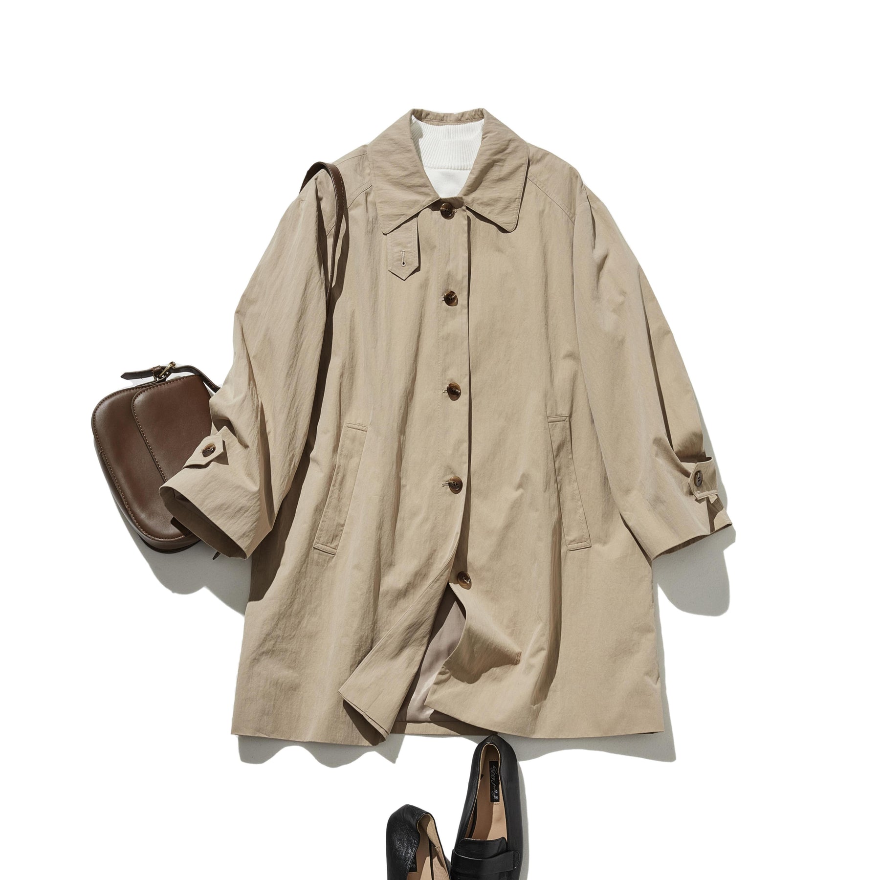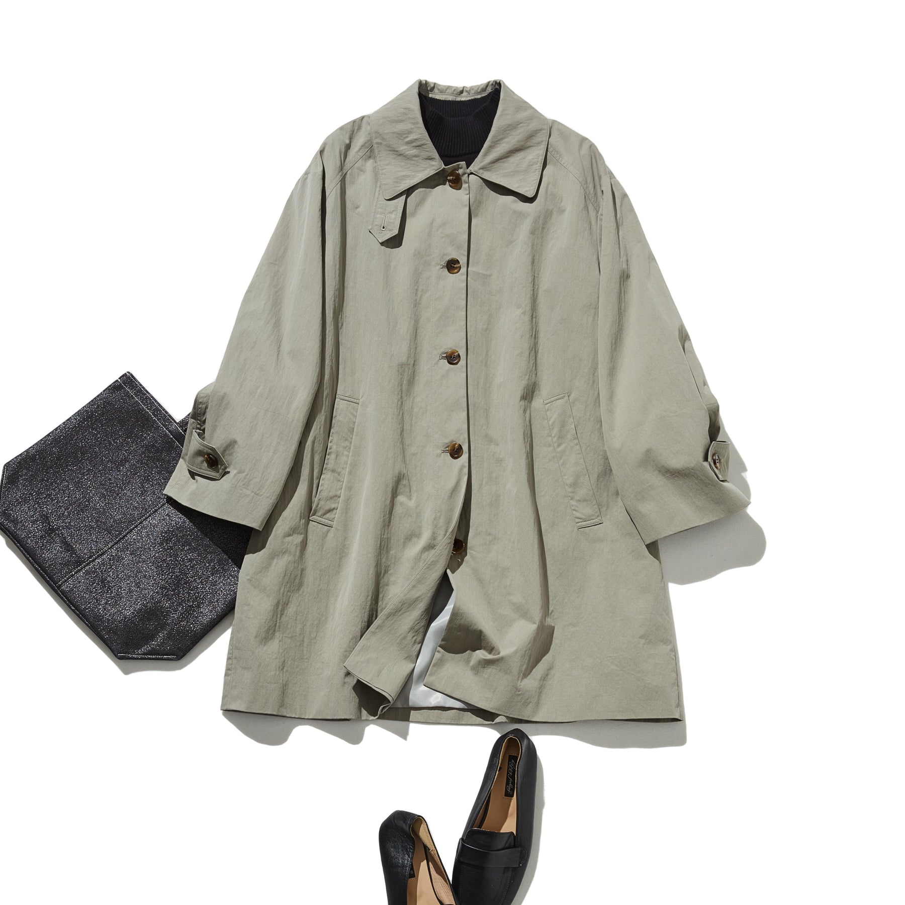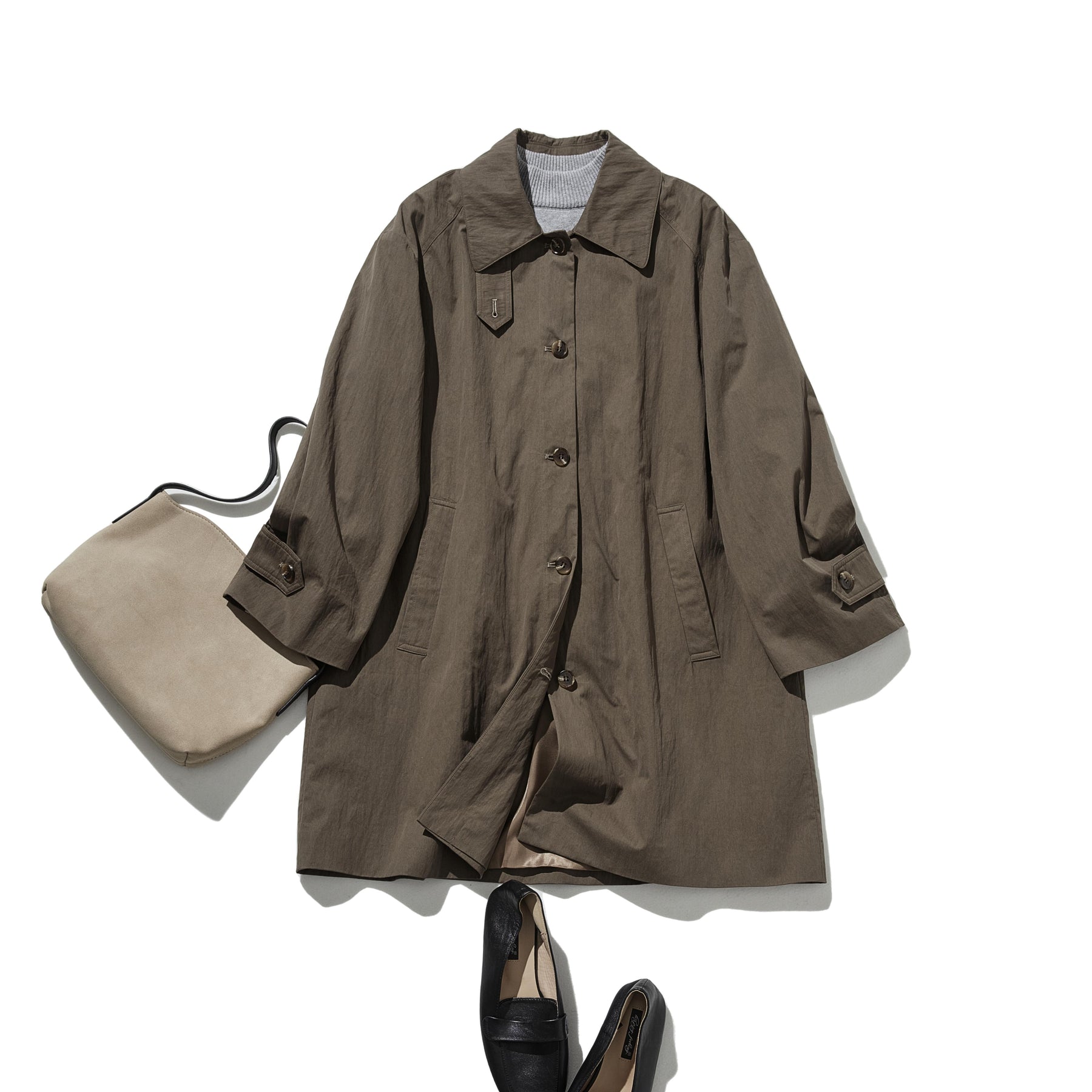 ロングシーズン着まわせる優秀アイテム トレンチコート ミドル丈コート 251003★シャリのあるドライな風合いでハリ感を出した、コットンの軽やかな着心地のコート。★ルーズになりすぎない絶妙なシルエットにこだわったミドル丈。★さらっとした滑りやすい裏地付き&襟はベーシックなステンカラーで、きれいめの着こなしにもぴったり。★首もとをそっと包み込むゆとりを持たせたスタンド襟も◎。★背中のタックでバックスタイルがすらりときれい。★シンプルなデザインで、シーンを問わず大人のワードローブにマッチ。素材:表地:コットン64% ナイロン36%裏地:ポリエステル55% レ-ヨン45%サイズ:身丈84cm肩幅50cm袖丈51cmバスト118cmアームホール54cm袖口36cm裾125cm透け感:なし裏地:ありポケット:あり伸縮性:なし光沢感:なしシーズン:春、秋、冬