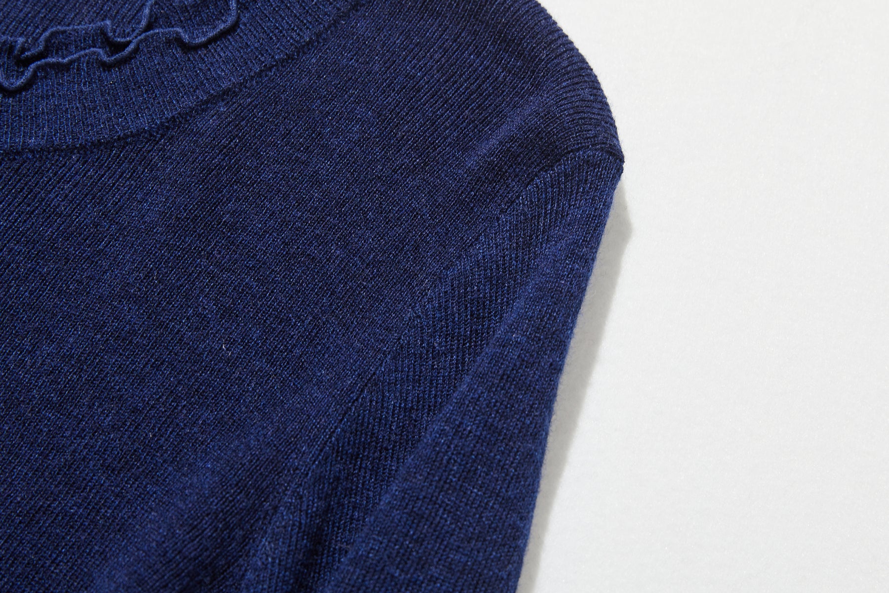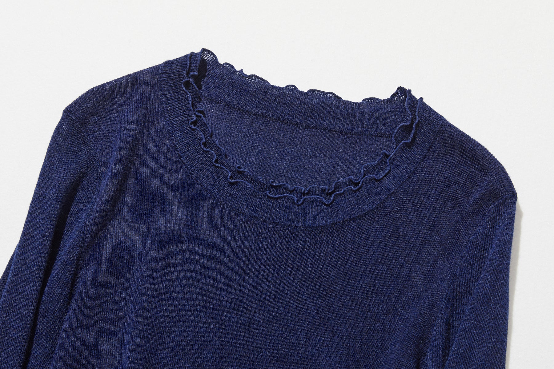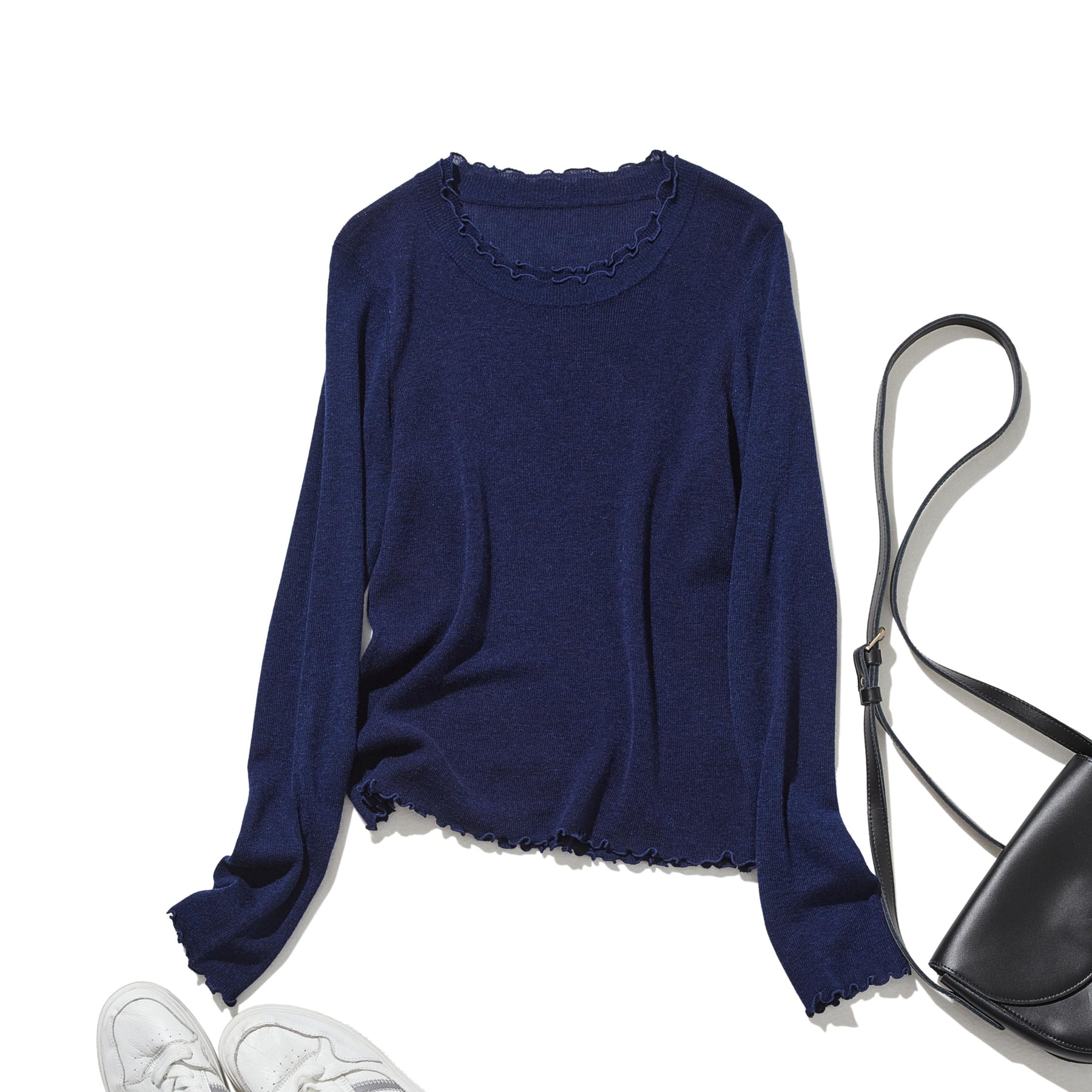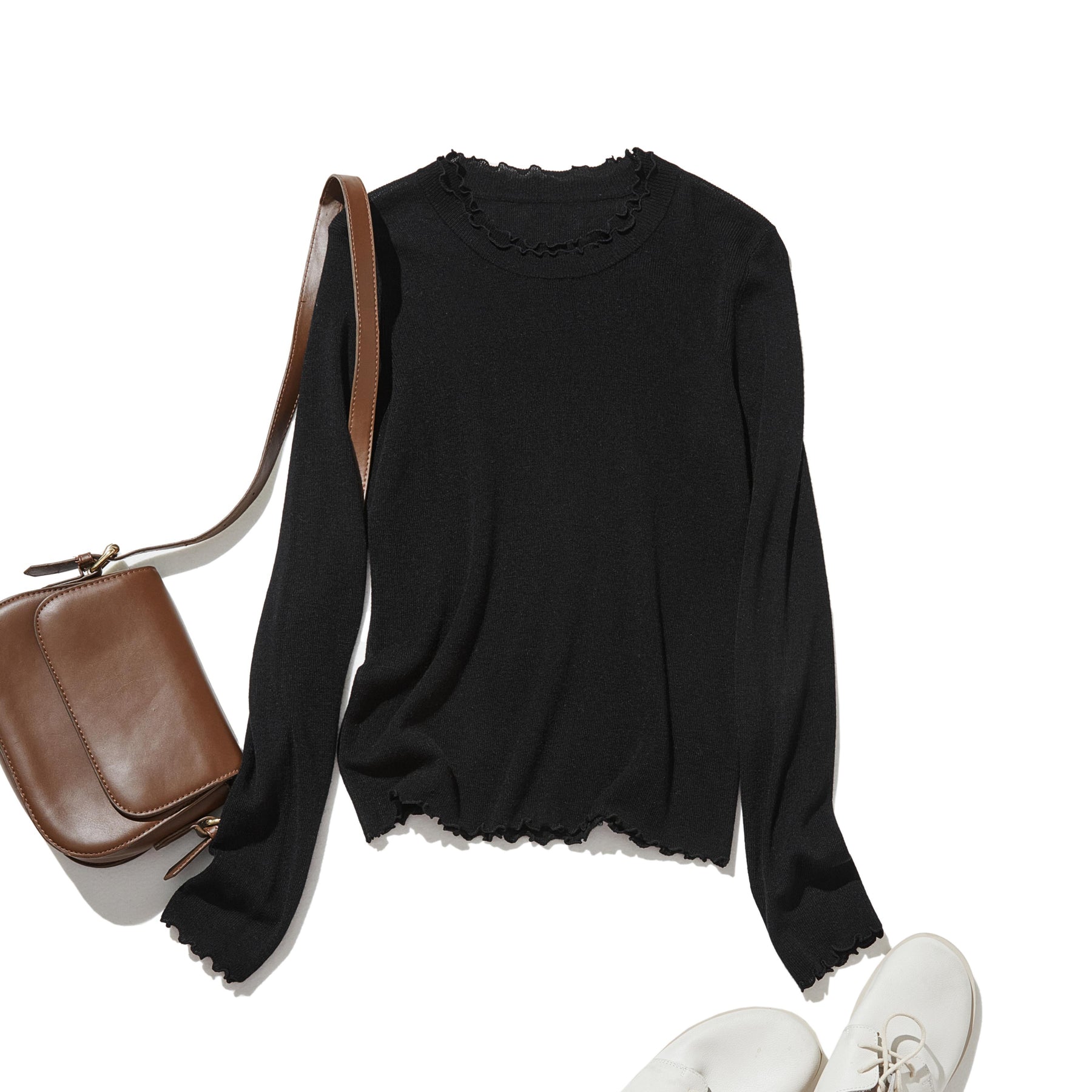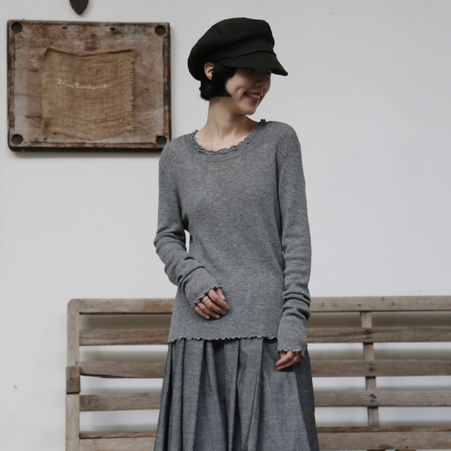すっきり女性らしいシルエット。肌に寄り添う、軽くて暖かなハイゲージニット 251102こちらのプルオーバーは、女性らしいラインを描きながらも、きつすぎない絶妙なフィット感が魅力のリブニット。高品質なウール混糸を使用し、肌にチクチクしない、なめらかな肌触りに仕上げました。【商品の特徴】• 心地よいフィット感: 細かいリブ編みが身体に優しく寄り添い、美しいシルエットを演出します。適度な伸縮性で動きやすく、Lサイズの方まで快適にお召しいただけます。• 軽暖・快適素材: あたたかみのあるウール混糸を使用。軽くてやや薄手のため、季節を問わず活躍します。• こだわりのディテール: やや開きの広いクルーネックで首元をすっきり見せ、袖口と裾には可愛らしいピコデザインをあしらいました。【こんな方におすすめです】• すっきりと体にフィットするシルエットがお好きな方• チクチクせず、軽くて動きやすいニットをお探しの方• インナーにもメインにもなる、汎用性の高いアイテムが欲しい方◎ スタイリングアドバイス• シンプルに… ベーシックなデニムやスラックスに合わせて、すっきりカジュアルに。クルーネックが差し色のネックレスを引き立てます。• レイヤードに… シャツやブラウスの上から着れば、襟元と袖口から覗くピコデザインがアクセントに。オフィスカジュアルにもおすすめです。• アウターのインナーに… ジャケットやコートの下にすっきり収まるので、冬の定番インナーとして重宝します。リバーシブルコートと合わせれば、表裏で雰囲気が変えられてより便利です。素材:ウール32.8%ポリエステル43.6%アクリル23.6%サイズ:身丈60cm肩幅38cm袖丈64cm首回り56cmバスト80〜100cm(伸縮性あり)裾80〜100cm透け感:なし裏地:なしポケット:なし伸縮性:あり光沢感:なしシーズン:春、秋、冬
