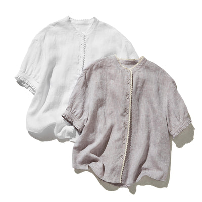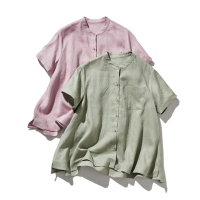 上品な着こなしに♪ リネン100% バンドカラーシャツ リネンブラウス 半袖シャツ 250509