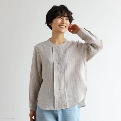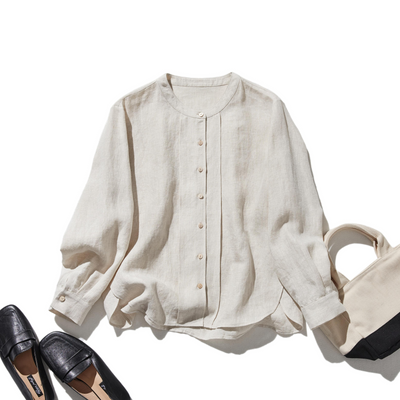 シンプルながらもこだわりのディテールが光る一枚 フランス産リネン100% シャツブラウス 生成色 250410-1
