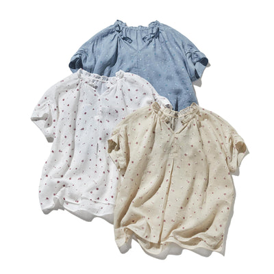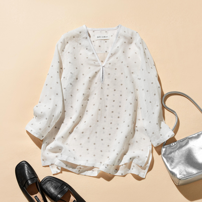 上品な抜け感と大人かわいいシルエット オリジナルドットプリントの麻ブラウス 250404-1