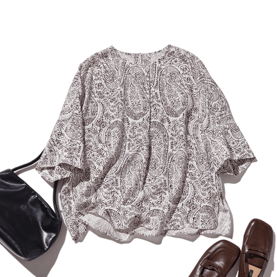 上品なカシュー柄7分袖ブラウス ゆったりシルエット プルオーバー テンセル リネン250502-1