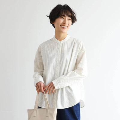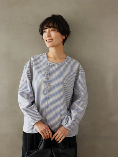クラシカルなフリルデザインのストライプシャツ 綿麻シャツブラウス 250419