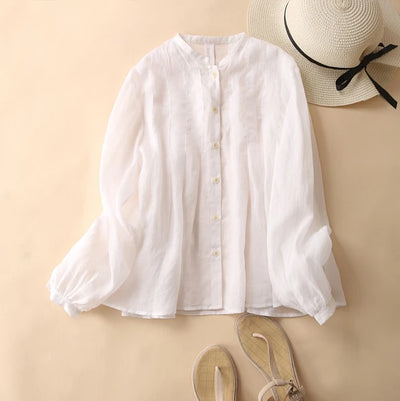 舒緩質感♪ 100%天然亞麻襯衫 防曬上衣 前後褶邊 白色 200802-1