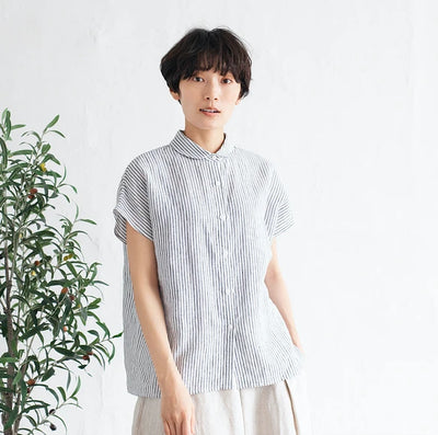 清爽迷人的圓領襯衫,100%亞麻,條紋襯衫上衣 220608