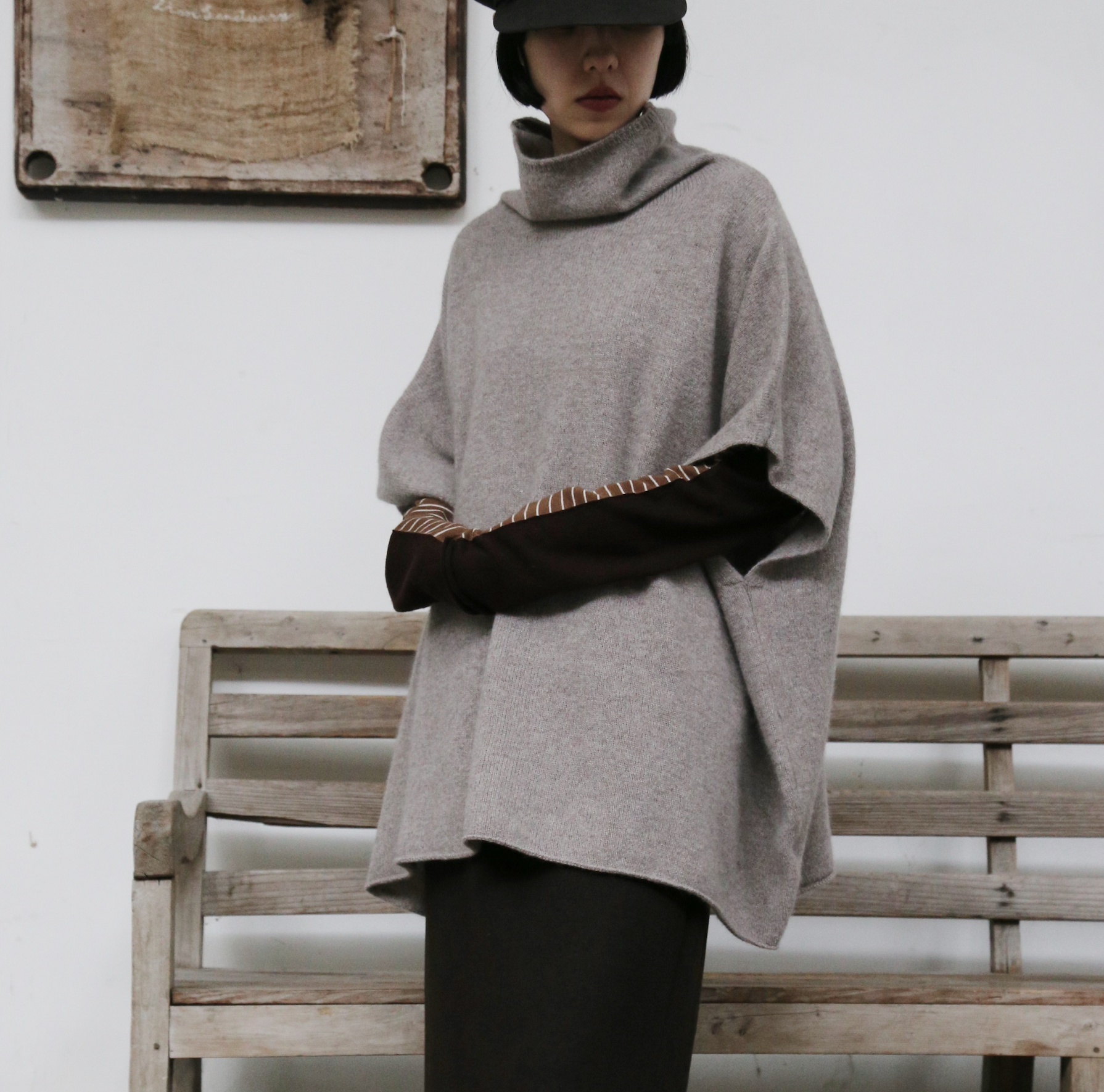 こちらの商品は、ケープのようなゆったりとしたシルエットが特徴的なハイネックトップス。