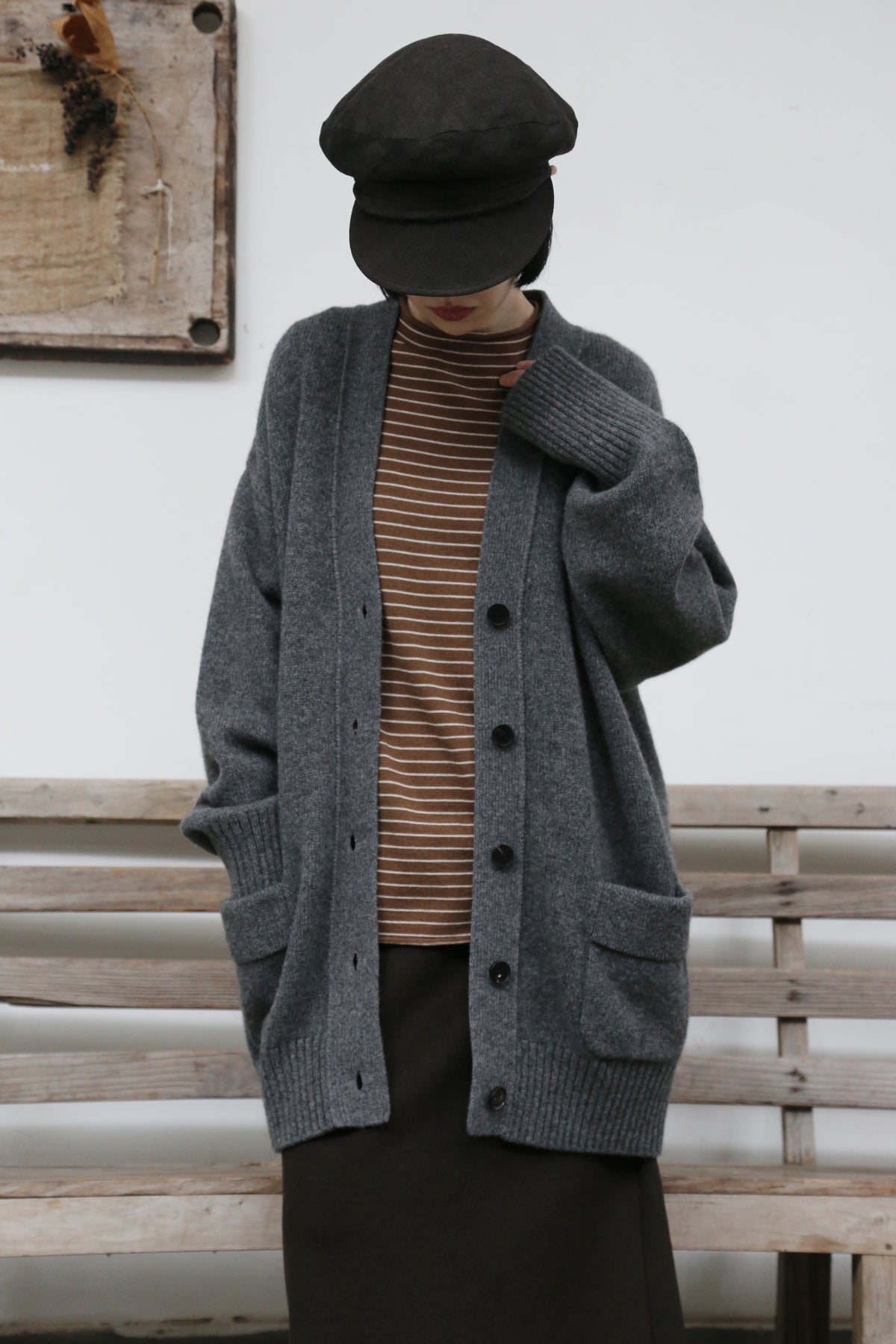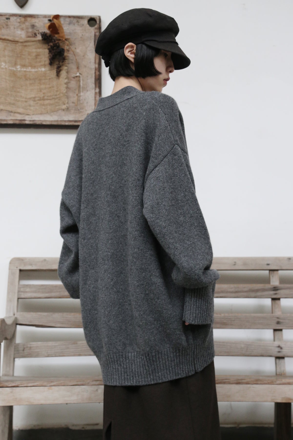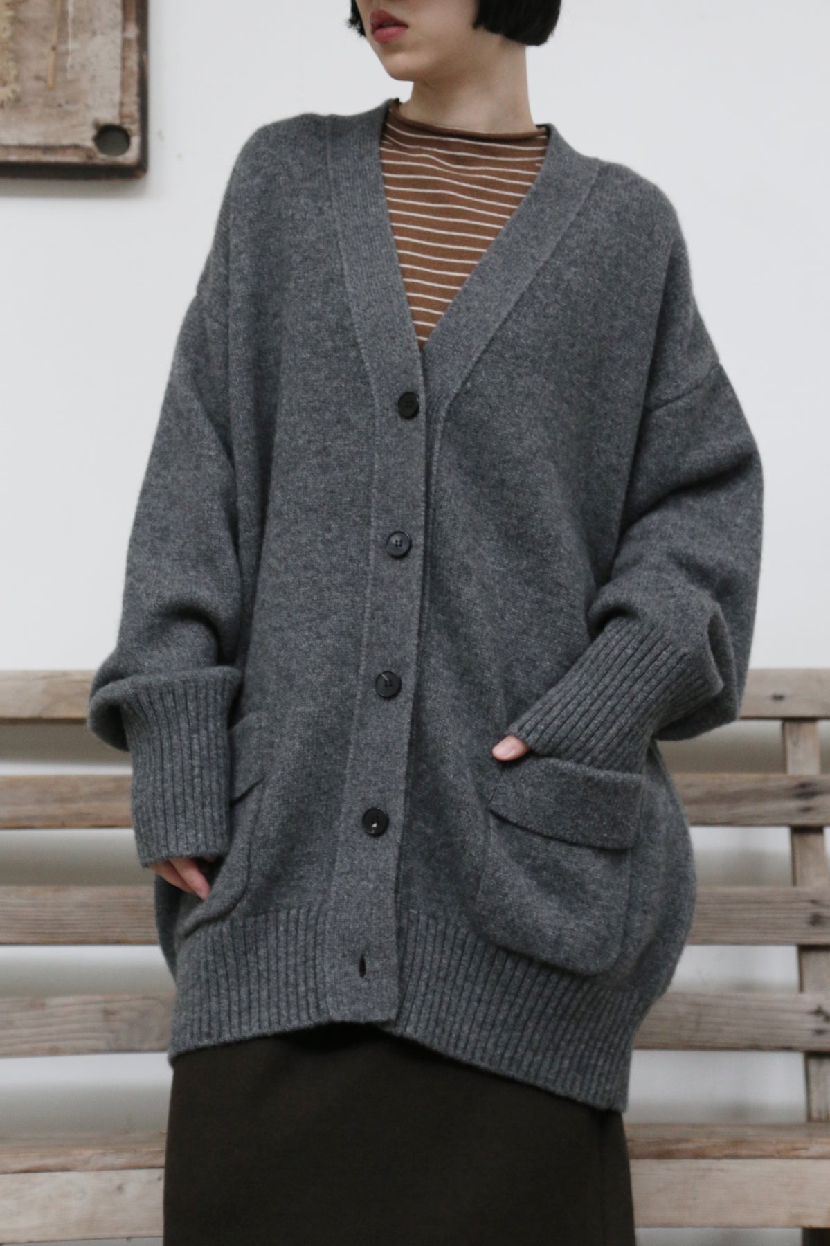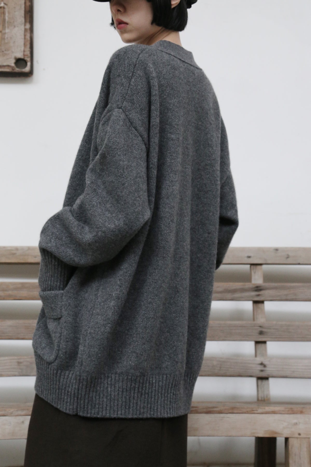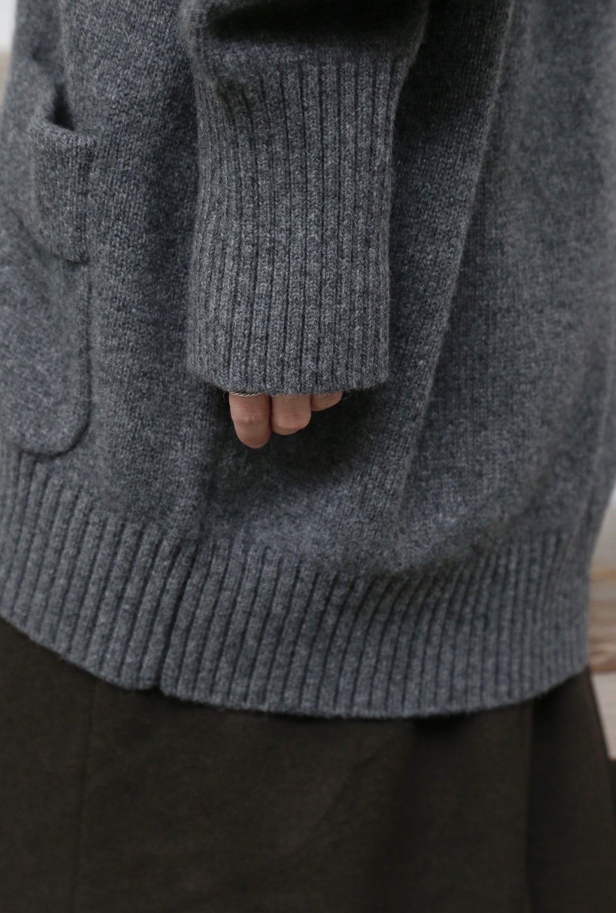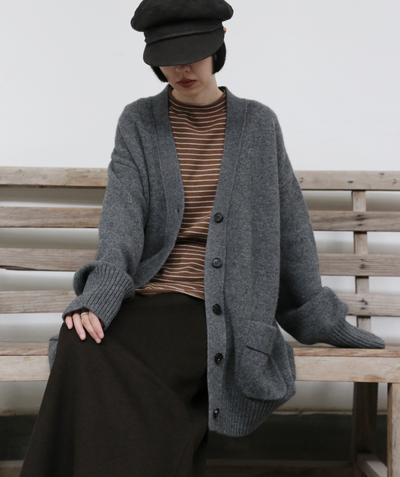 優雅なぬくもりをまとう、Vネックカーディガン ヤクダウン&ウール混紡カーディガン ダークグレー 251201-1毎日の暮らしに寄り添う、ゆったりとしたシルエットのVネックカーディガンです。ほどよい厚みのある素材感で、ウォームながらも軽やかな着心地が特徴。一枚羽織るだけで、ぐっとコーディネートに風格と温もりをプラスします。【こだわりの素材:希少なヤクダウンと上質ウールの絶妙なブレンド】本品には、厳寒の高地で生きるヤクからわずかに採取される「ヤクダウン」を贅沢に使用しています。顎や腹部のみから得られるこの極細産毛は、驚くほど柔らかく、肌になじむようななめらかな触り心地が自慢。上質なウールとブレンドすることで、以下のような理想的な性能を実現しました。• 保温性:一般的なウールより約30%高く、カシミアと同等のあたたかさをキープ。• 通気性:カシミアよりも130%高く、蒸れにくく快適な着心地。• 耐久性:毛玉ができにくく、長く美しい状態を保ちます。• 軽量性:「柔らかくて温かいのに、重たくない」理想の着心地です。【日常を豊かにする、高い着まわし力】• デザイン:すっきりとしたVネックが首元を美しく見せ、さまざまなインナーと組み合わせやすく、顔周りもすっきりと印象付けます。前身頃のポケットは、実用性とゆるやかなデイリー感を添えます。• シルエット:身体を包み込むようなゆったりラインは、体型を気にせず着用でき、着崩れの心配もありません。秋冬の厚手のインナーやアウターの下にもすっきり重ねられます。• スタイリング:オフィスカジュアルから、お出かけ、在宅時のくつろぎまで、シーンを選ばず活躍します。【おすすめスタイリング例】1. ベーシックエレガンスシンプルなタートルネックセーターやブラウスに合わせ、上品で洗練された印象に。同系色のストレートパンツやプリーツスカートと組み合わせて、大人のきれいめコーデを。2. レイヤードスタイル秋冬の定番、トレンチコートやダウンコートの下に重ねれば、保温性と立体感がアップ。3. カジュアルリラックスデニムやコーデュロイパンツ、さらにはTシャツやスウェットにも合わせやすいデザイン。ボリュームのあるワンピースの上からベルトで絞れば、程よい締まりとぬくもりをプラスできます。「特別な素材のぬくもり」を、日常のひとときに。普段着ながらも、素材のこだわりと機能性が光る一枚。忙しい毎日の中で、ふと感じる上質な温もりと安らぎを、このカーディガンがお届けします。ぜひ、ご自身の肌でその軽やかでふんわりとした着心地をお確かめください。素材:ウール88.6%ヤクダウン11.4%サイズ:身丈76cm肩幅55cm袖丈56cmバスト122cmアームホール48cm袖口22cm裾94cmモデルさんの身長:155cm透け感:なし裏地:なしポケット:あり伸縮性:あり光沢感:なしシーズン:春、秋、冬