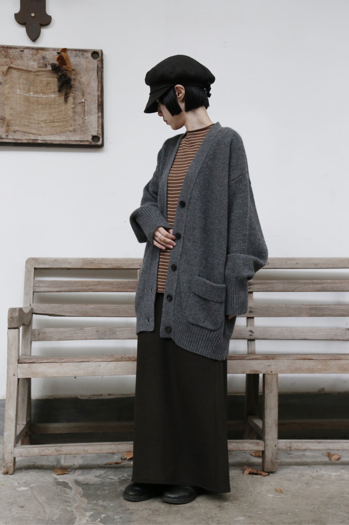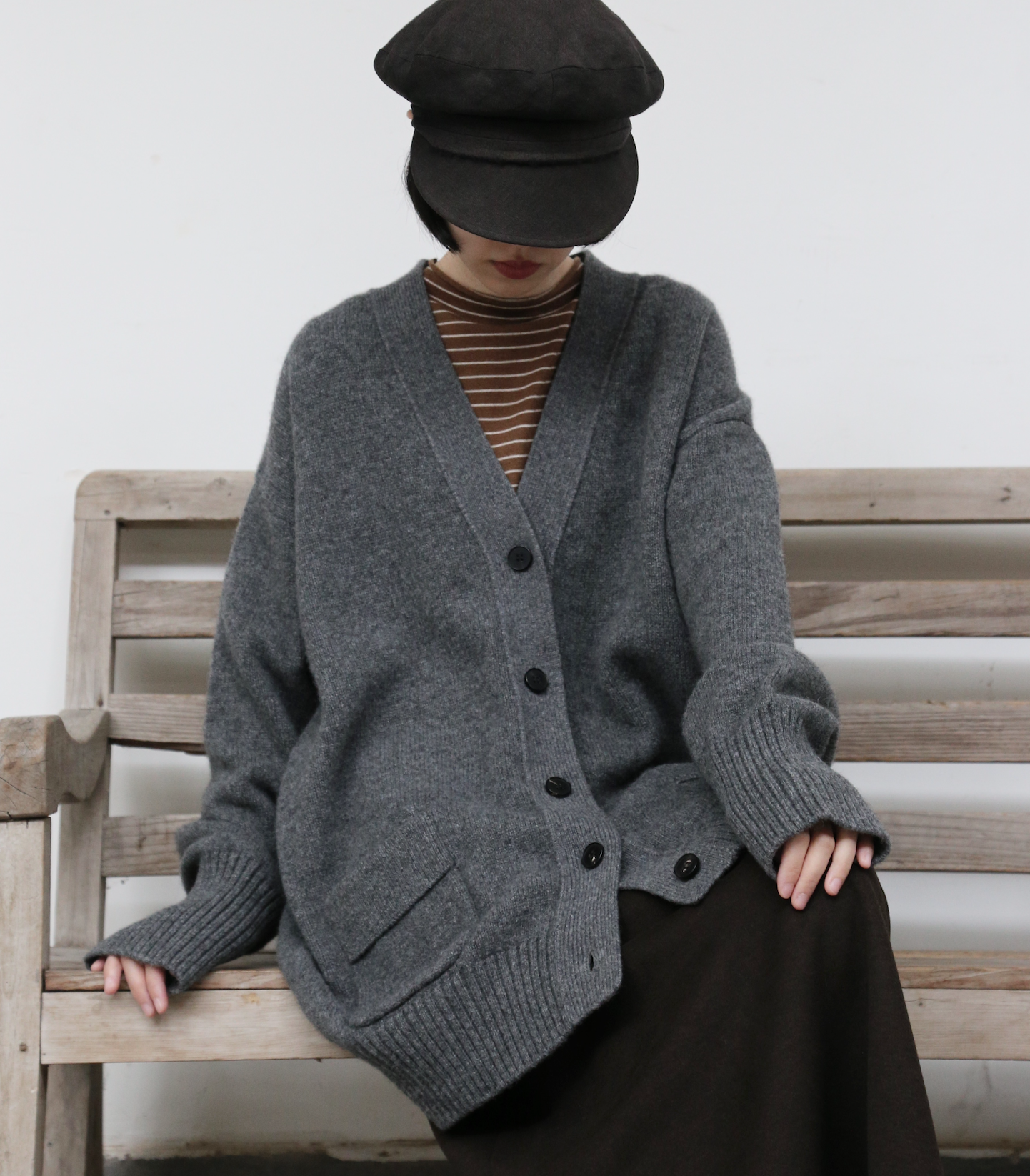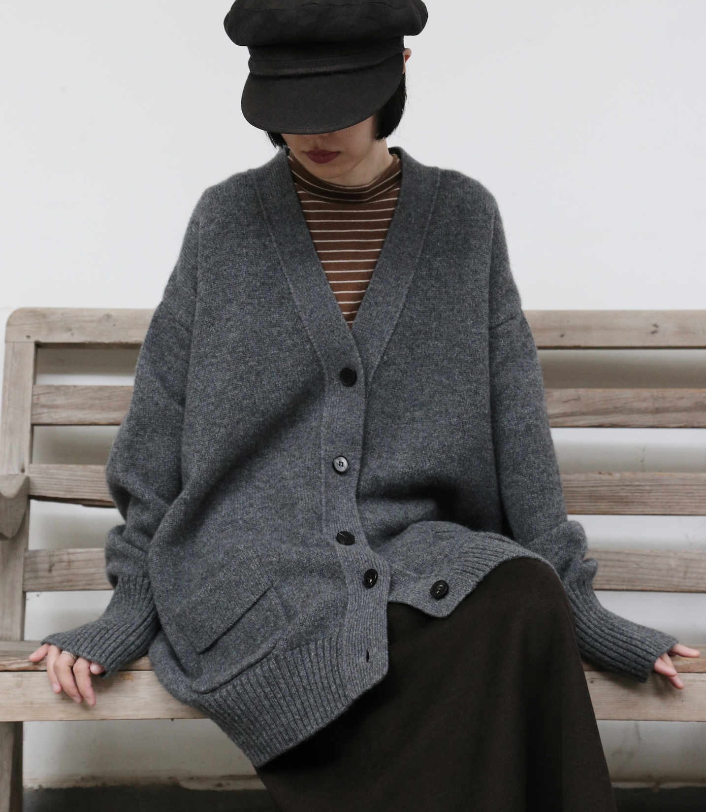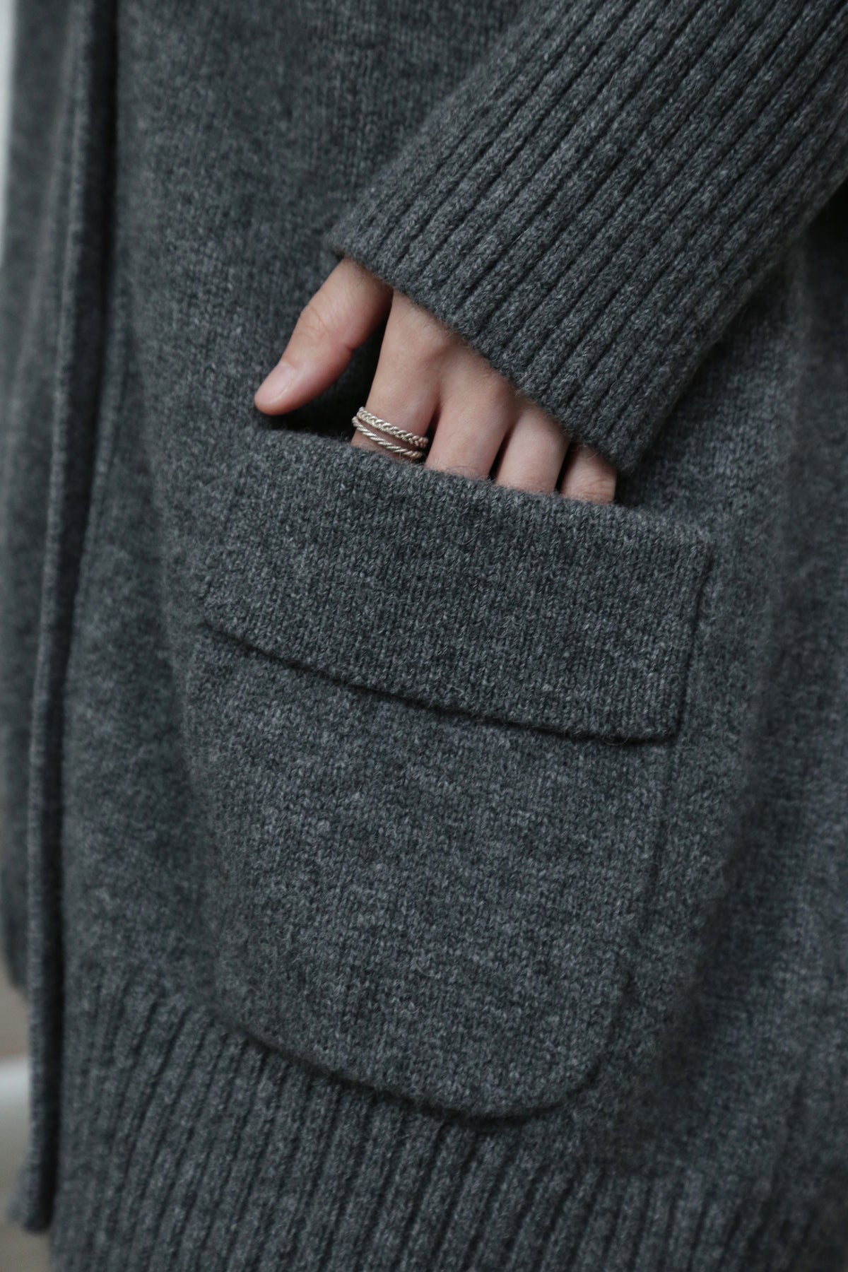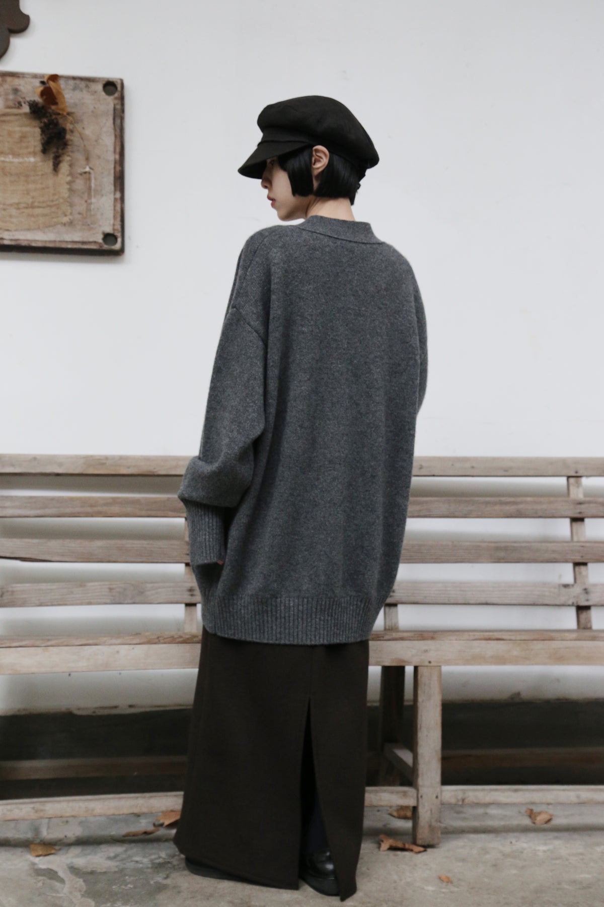 優雅なぬくもりをまとう、Vネックカーディガン ヤクダウン&ウール混紡カーディガン ダークグレー 251201-1毎日の暮らしに寄り添う、ゆったりとしたシルエットのVネックカーディガンです。ほどよい厚みのある素材感で、ウォームながらも軽やかな着心地が特徴。一枚羽織るだけで、ぐっとコーディネートに風格と温もりをプラスします。【こだわりの素材:希少なヤクダウンと上質ウールの絶妙なブレンド】本品には、厳寒の高地で生きるヤクからわずかに採取される「ヤクダウン」を贅沢に使用しています。顎や腹部のみから得られるこの極細産毛は、驚くほど柔らかく、肌になじむようななめらかな触り心地が自慢。上質なウールとブレンドすることで、以下のような理想的な性能を実現しました。• 保温性:一般的なウールより約30%高く、カシミアと同等のあたたかさをキープ。• 通気性:カシミアよりも130%高く、蒸れにくく快適な着心地。• 耐久性:毛玉ができにくく、長く美しい状態を保ちます。• 軽量性:「柔らかくて温かいのに、重たくない」理想の着心地です。【日常を豊かにする、高い着まわし力】• デザイン:すっきりとしたVネックが首元を美しく見せ、さまざまなインナーと組み合わせやすく、顔周りもすっきりと印象付けます。前身頃のポケットは、実用性とゆるやかなデイリー感を添えます。• シルエット:身体を包み込むようなゆったりラインは、体型を気にせず着用でき、着崩れの心配もありません。秋冬の厚手のインナーやアウターの下にもすっきり重ねられます。• スタイリング:オフィスカジュアルから、お出かけ、在宅時のくつろぎまで、シーンを選ばず活躍します。【おすすめスタイリング例】1. ベーシックエレガンスシンプルなタートルネックセーターやブラウスに合わせ、上品で洗練された印象に。同系色のストレートパンツやプリーツスカートと組み合わせて、大人のきれいめコーデを。2. レイヤードスタイル秋冬の定番、トレンチコートやダウンコートの下に重ねれば、保温性と立体感がアップ。3. カジュアルリラックスデニムやコーデュロイパンツ、さらにはTシャツやスウェットにも合わせやすいデザイン。ボリュームのあるワンピースの上からベルトで絞れば、程よい締まりとぬくもりをプラスできます。「特別な素材のぬくもり」を、日常のひとときに。普段着ながらも、素材のこだわりと機能性が光る一枚。忙しい毎日の中で、ふと感じる上質な温もりと安らぎを、このカーディガンがお届けします。ぜひ、ご自身の肌でその軽やかでふんわりとした着心地をお確かめください。素材:ウール88.6%ヤクダウン11.4%サイズ:身丈76cm肩幅55cm袖丈56cmバスト122cmアームホール48cm袖口22cm裾94cmモデルさんの身長:155cm透け感:なし裏地:なしポケット:あり伸縮性:あり光沢感:なしシーズン:春、秋、冬