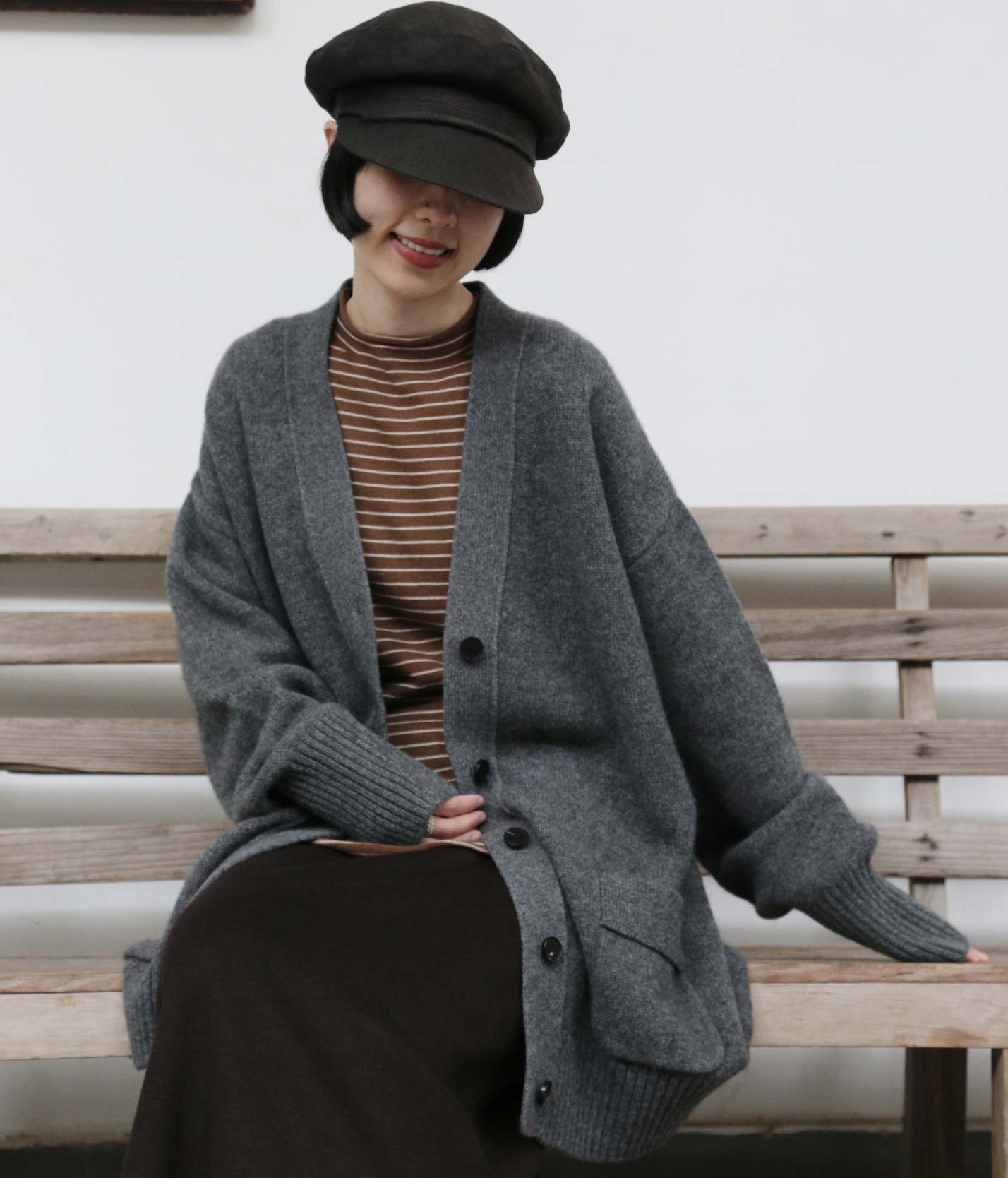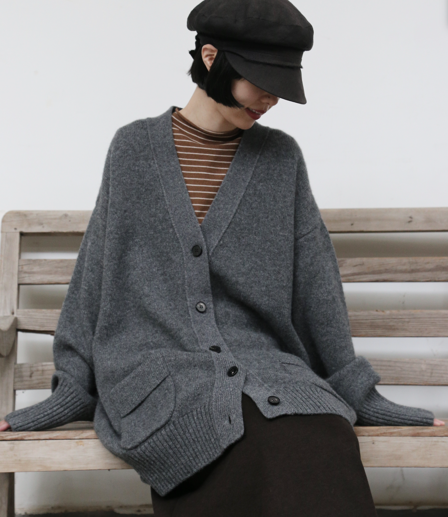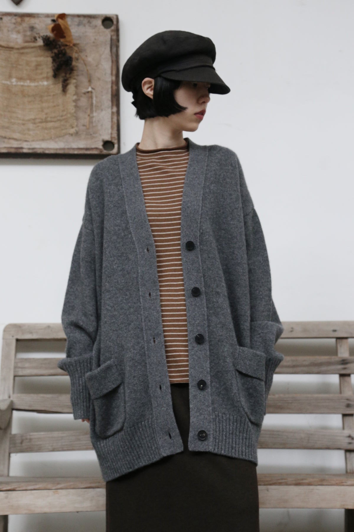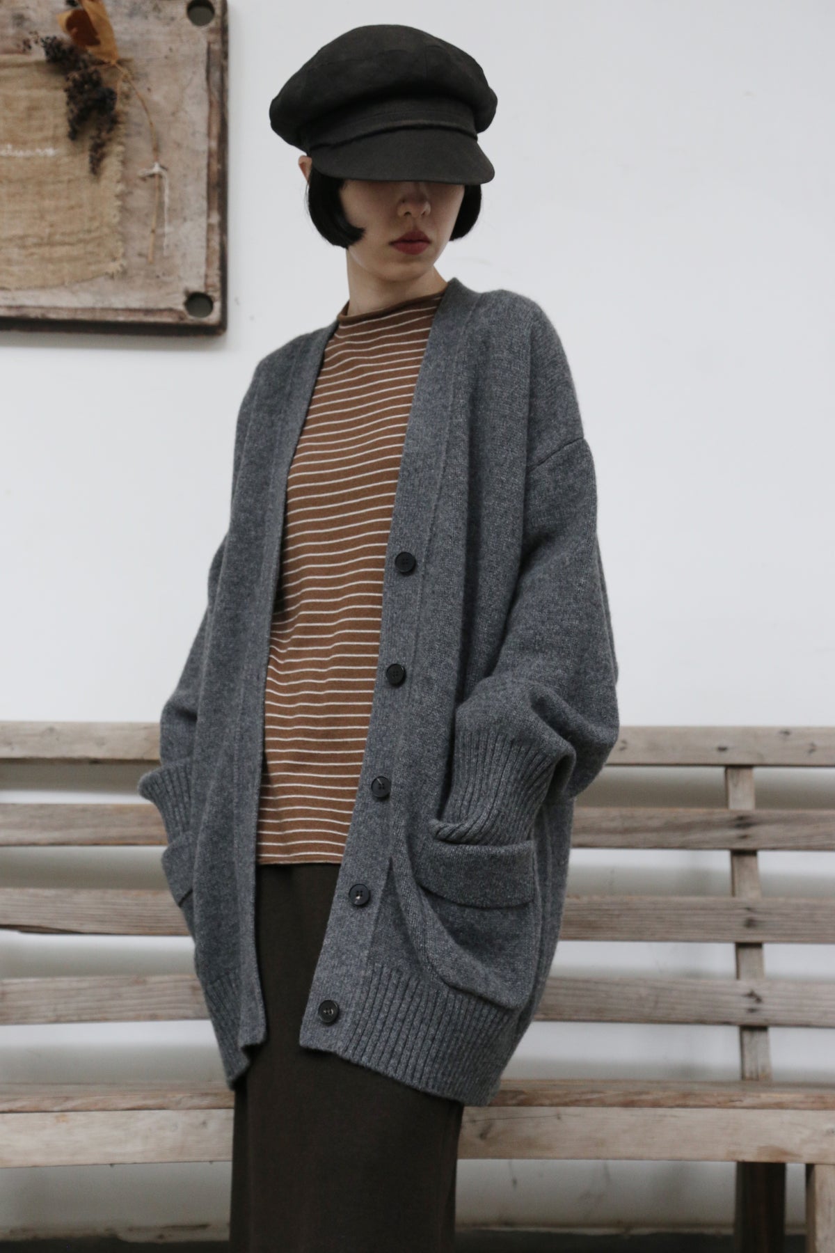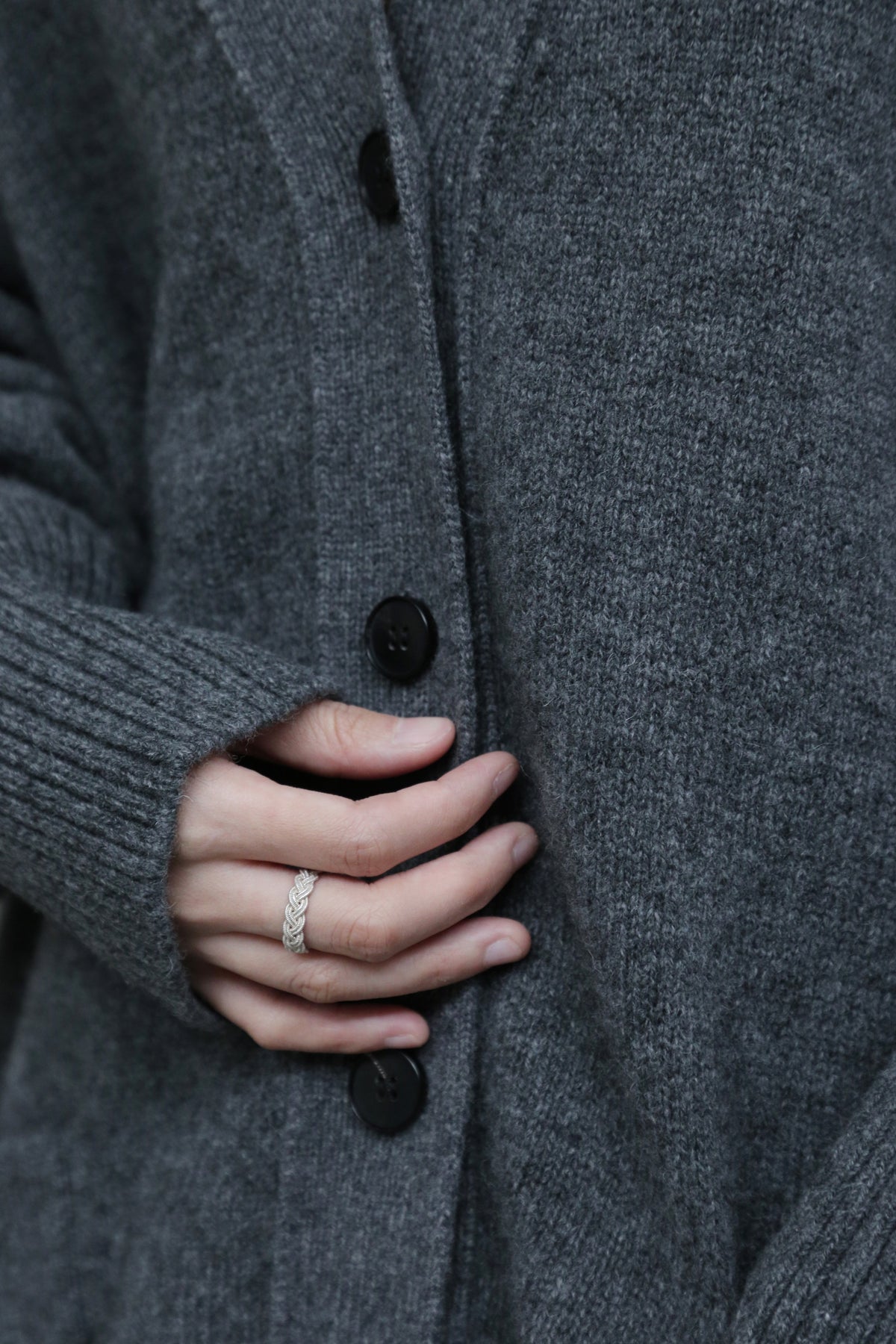 優雅なぬくもりをまとう、Vネックカーディガン ヤクダウン&ウール混紡カーディガン ダークグレー 251201-1毎日の暮らしに寄り添う、ゆったりとしたシルエットのVネックカーディガンです。ほどよい厚みのある素材感で、ウォームながらも軽やかな着心地が特徴。一枚羽織るだけで、ぐっとコーディネートに風格と温もりをプラスします。【こだわりの素材:希少なヤクダウンと上質ウールの絶妙なブレンド】本品には、厳寒の高地で生きるヤクからわずかに採取される「ヤクダウン」を贅沢に使用しています。顎や腹部のみから得られるこの極細産毛は、驚くほど柔らかく、肌になじむようななめらかな触り心地が自慢。上質なウールとブレンドすることで、以下のような理想的な性能を実現しました。• 保温性:一般的なウールより約30%高く、カシミアと同等のあたたかさをキープ。• 通気性:カシミアよりも130%高く、蒸れにくく快適な着心地。• 耐久性:毛玉ができにくく、長く美しい状態を保ちます。• 軽量性:「柔らかくて温かいのに、重たくない」理想の着心地です。【日常を豊かにする、高い着まわし力】• デザイン:すっきりとしたVネックが首元を美しく見せ、さまざまなインナーと組み合わせやすく、顔周りもすっきりと印象付けます。前身頃のポケットは、実用性とゆるやかなデイリー感を添えます。• シルエット:身体を包み込むようなゆったりラインは、体型を気にせず着用でき、着崩れの心配もありません。秋冬の厚手のインナーやアウターの下にもすっきり重ねられます。• スタイリング:オフィスカジュアルから、お出かけ、在宅時のくつろぎまで、シーンを選ばず活躍します。【おすすめスタイリング例】1. ベーシックエレガンスシンプルなタートルネックセーターやブラウスに合わせ、上品で洗練された印象に。同系色のストレートパンツやプリーツスカートと組み合わせて、大人のきれいめコーデを。2. レイヤードスタイル秋冬の定番、トレンチコートやダウンコートの下に重ねれば、保温性と立体感がアップ。3. カジュアルリラックスデニムやコーデュロイパンツ、さらにはTシャツやスウェットにも合わせやすいデザイン。ボリュームのあるワンピースの上からベルトで絞れば、程よい締まりとぬくもりをプラスできます。「特別な素材のぬくもり」を、日常のひとときに。普段着ながらも、素材のこだわりと機能性が光る一枚。忙しい毎日の中で、ふと感じる上質な温もりと安らぎを、このカーディガンがお届けします。ぜひ、ご自身の肌でその軽やかでふんわりとした着心地をお確かめください。素材:ウール88.6%ヤクダウン11.4%サイズ:身丈76cm肩幅55cm袖丈56cmバスト122cmアームホール48cm袖口22cm裾94cmモデルさんの身長:155cm透け感:なし裏地:なしポケット:あり伸縮性:あり光沢感:なしシーズン:春、秋、冬